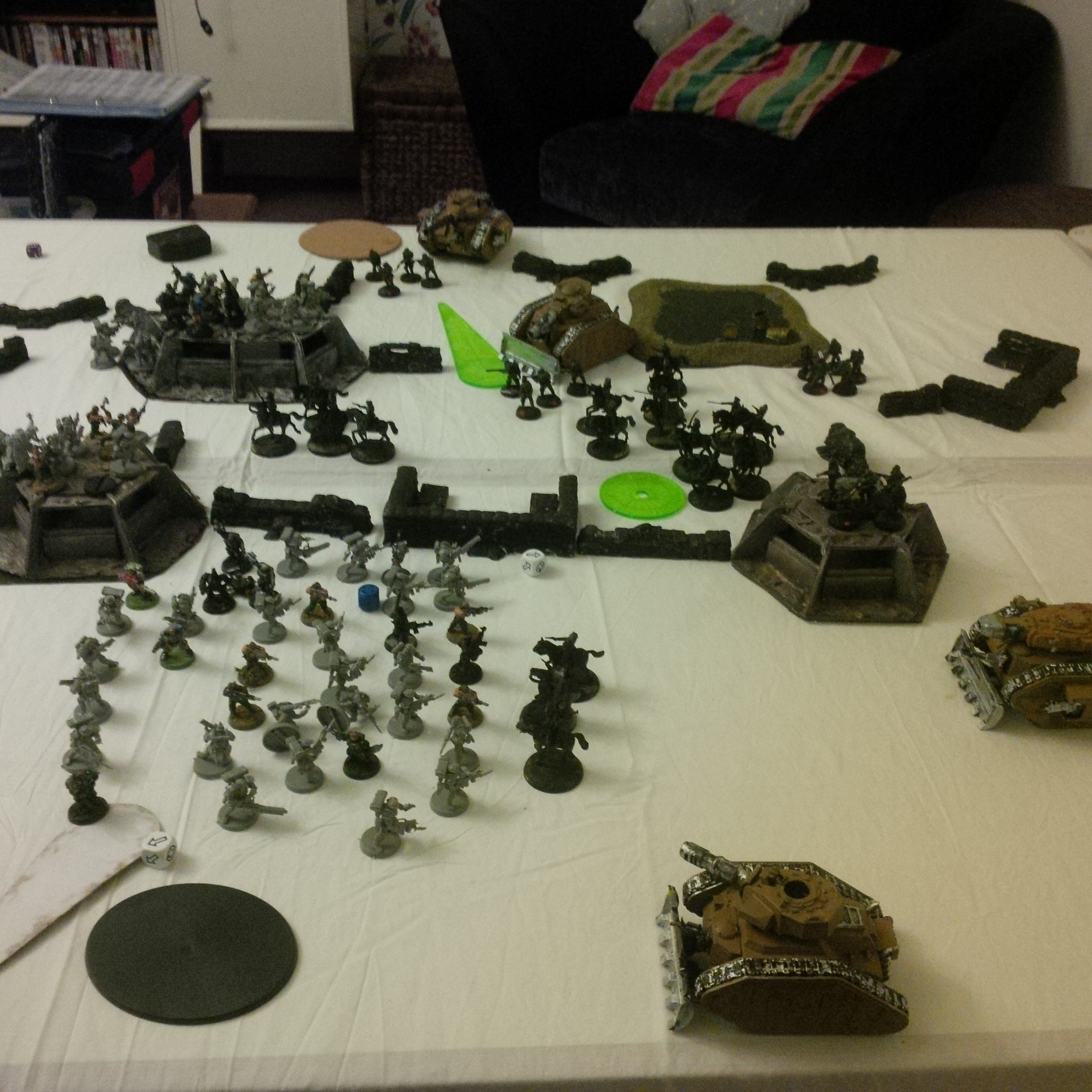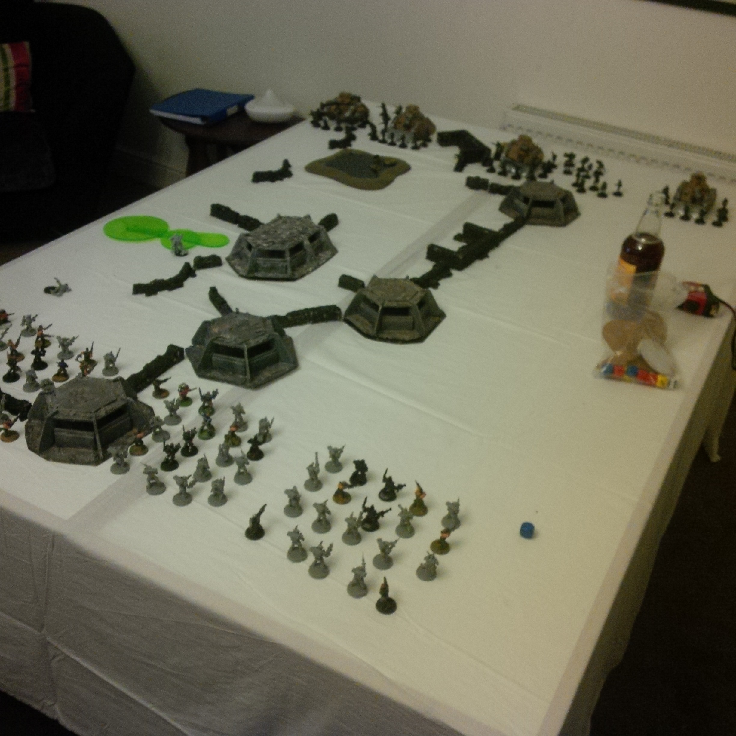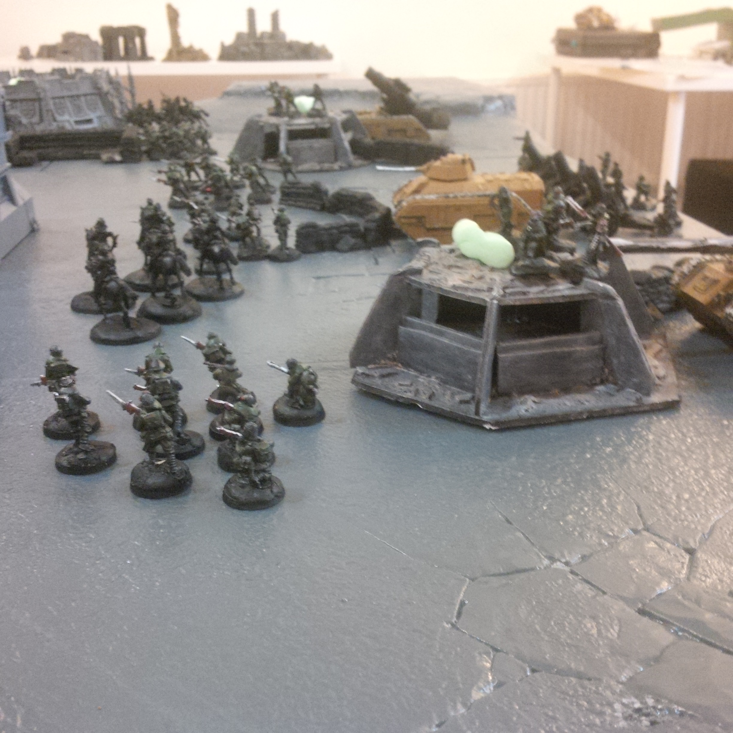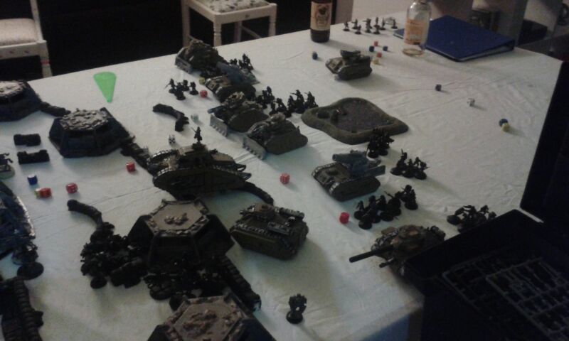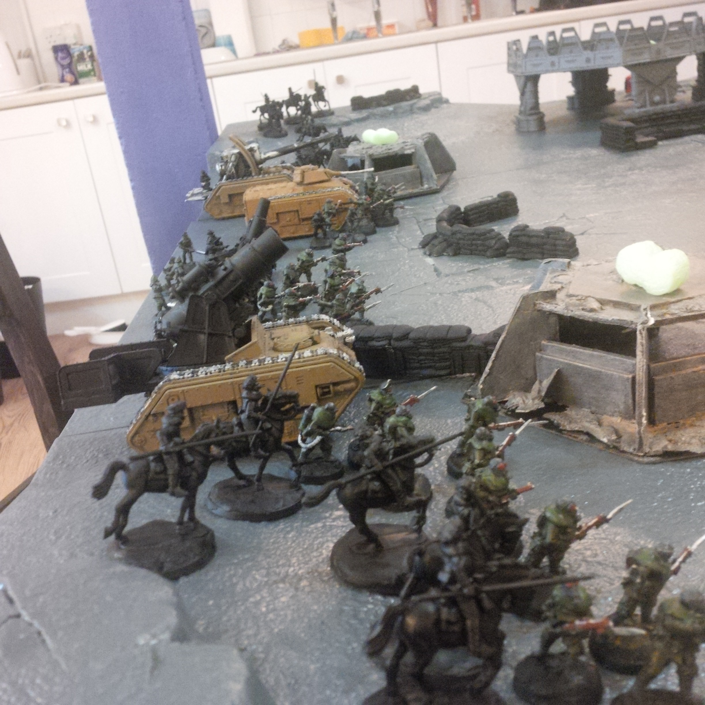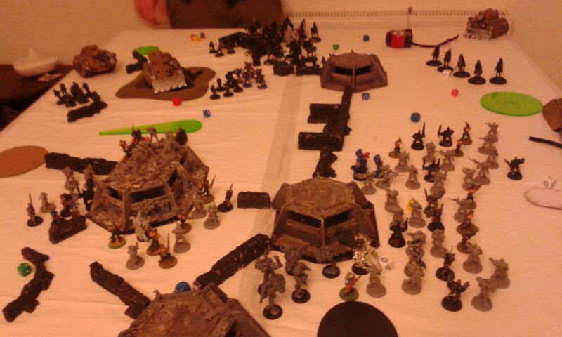 The idea was a 2000pt DkoK assault brigade versus a 2000pt CSM force on vraks. The CSM were rolling down the trench lines before coming into contact with a krieg counterpush by mechanised assets, cavalry and a couple of platoons. We had fought the game sidewise down the board and the CSM player had two dread claws (models at home so two cups...for shame) which he could assault out of. Each single bunker was one VP, the large bunker 2VP and included slay the warlord and line breaker. We houseruled that vps were counted at the end of the game.