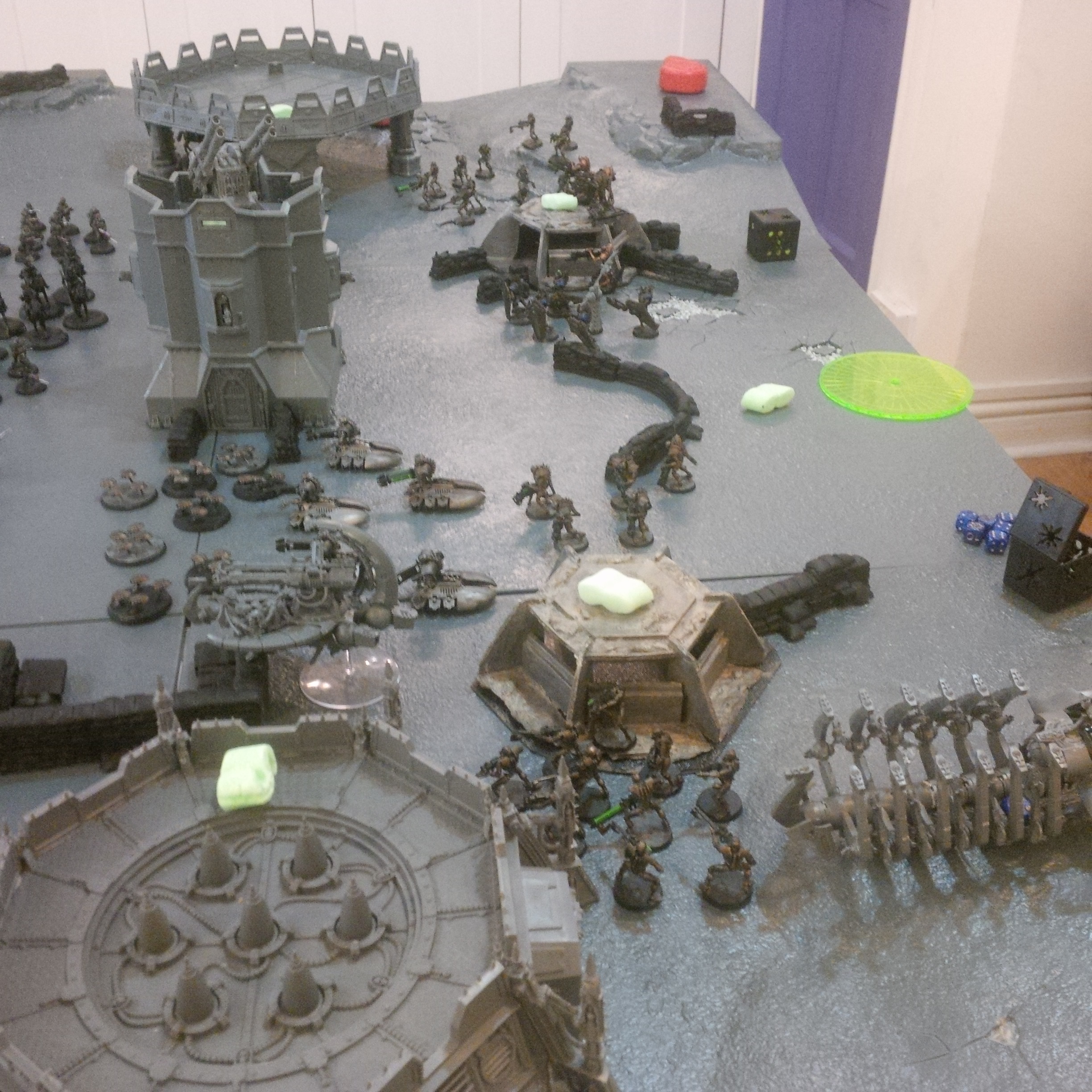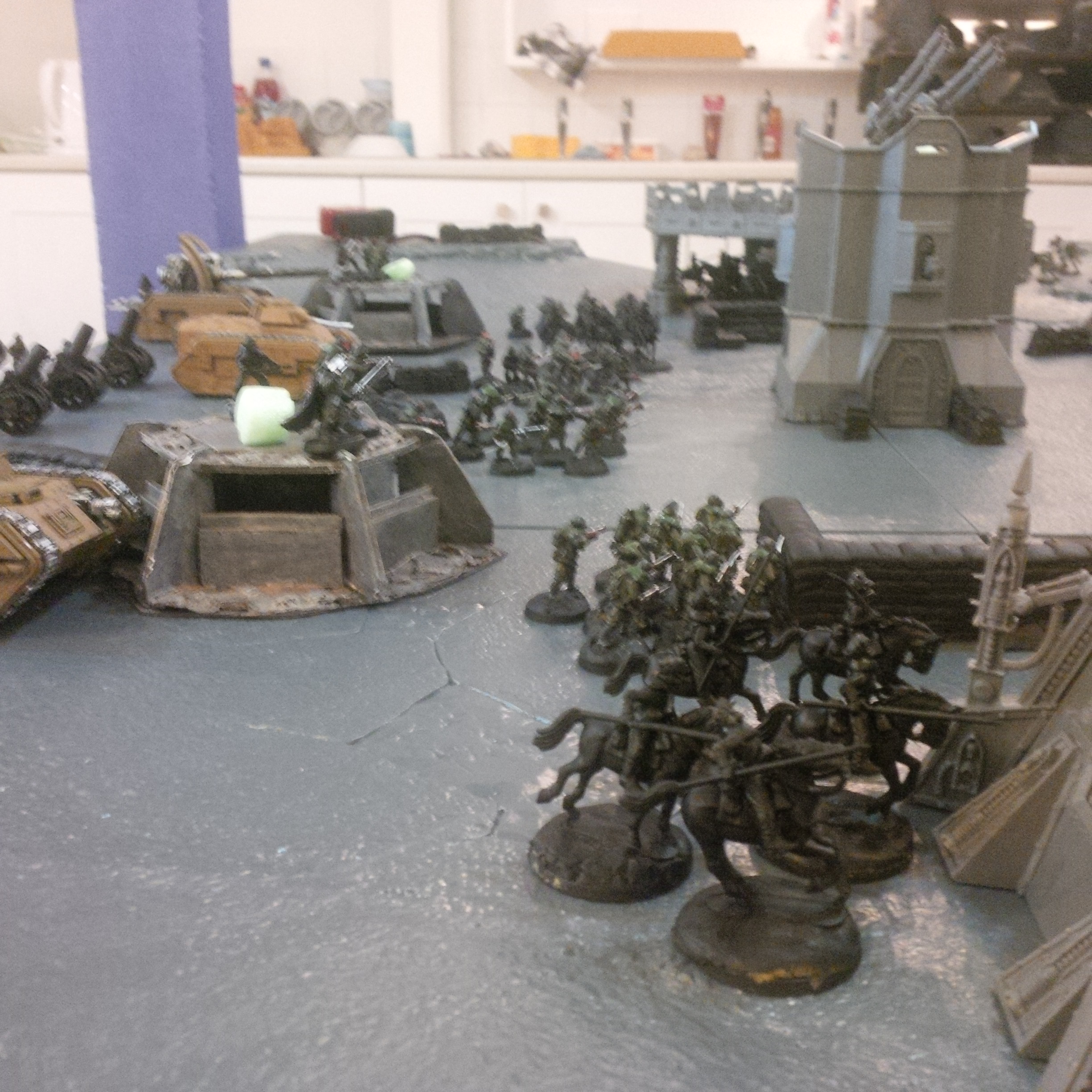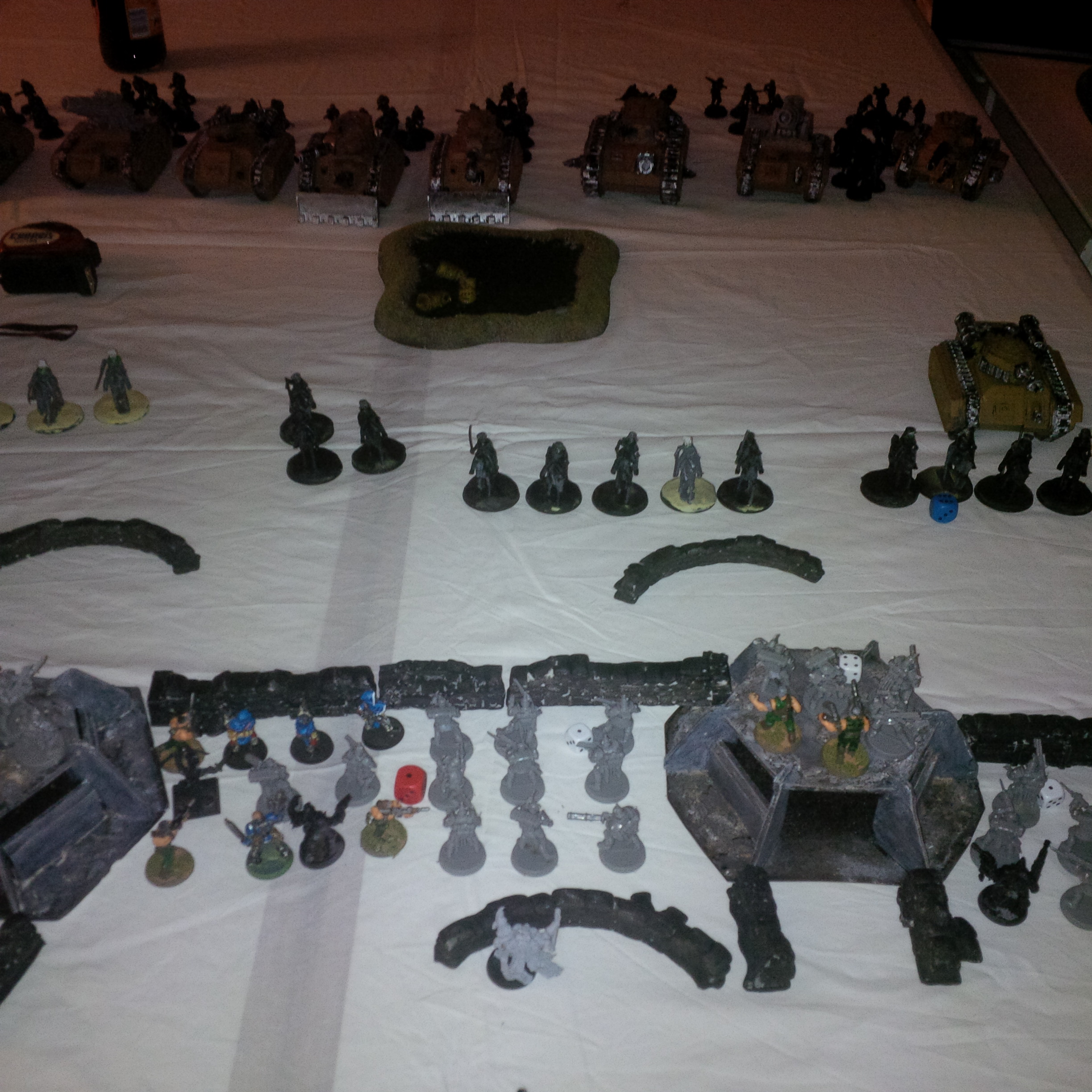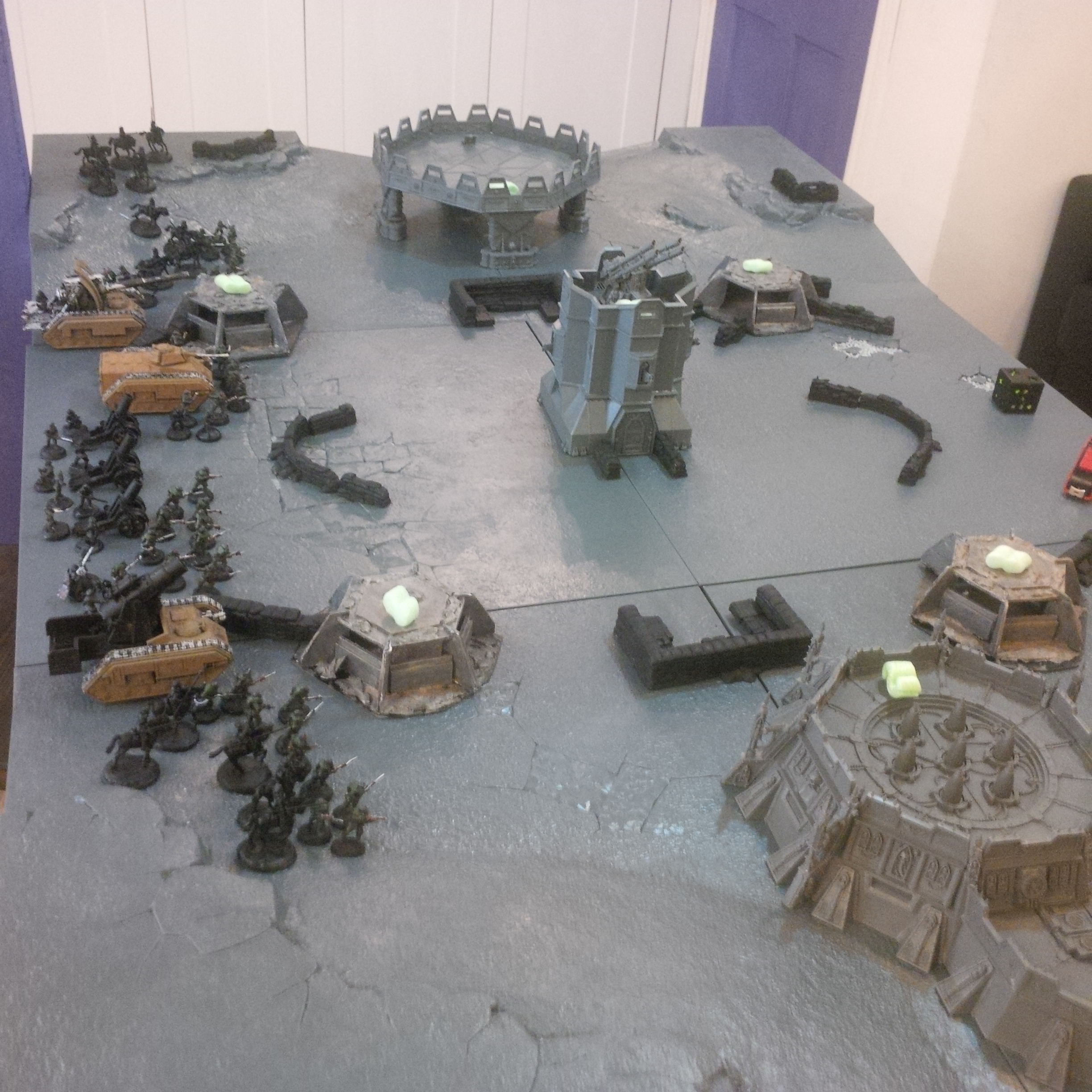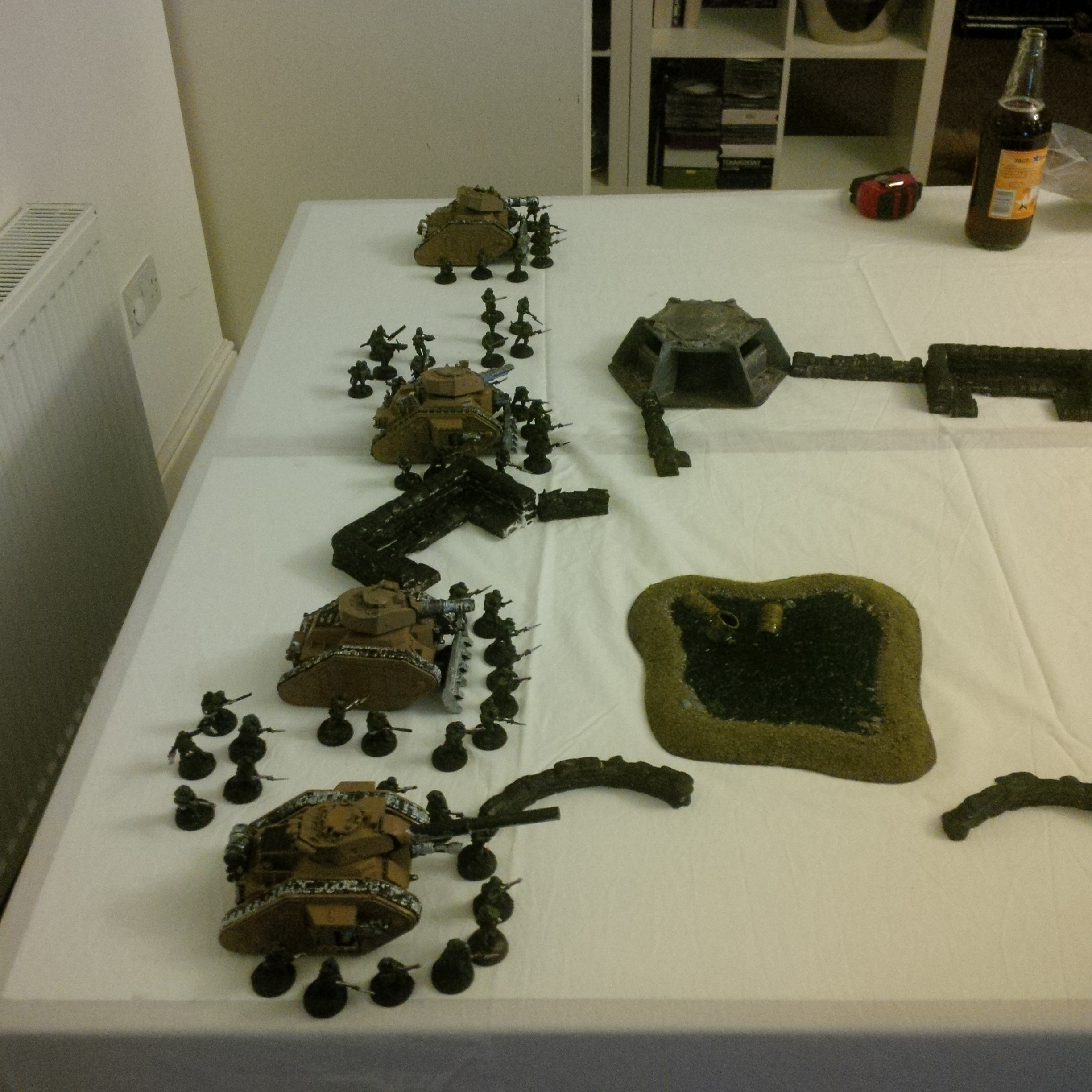 The idea was a 2000pt DkoK assault brigade versus a 2000pt CSM force on vraks. The CSM were rolling down the trench lines before coming into contact with a krieg counterpush by mechanised assets, cavalry and a couple of platoons. We had fought the game sidewise down the board and the CSM player had two dread claws (models at home so two cups...for shame) which he could assault out of. Each single bunker was one VP, the large bunker 2VP and included slay the warlord and line breaker. We houseruled that vps were counted at the end of the game.