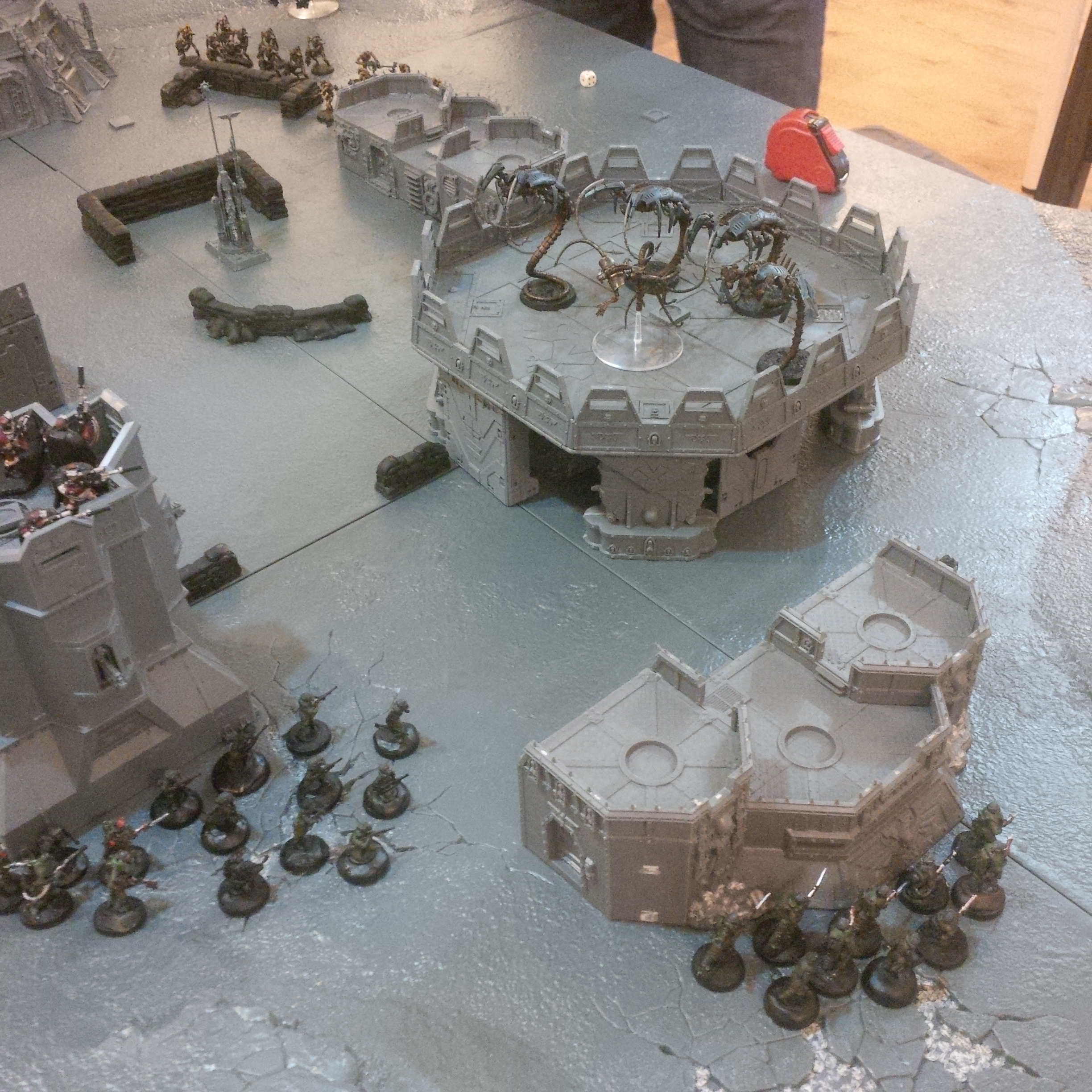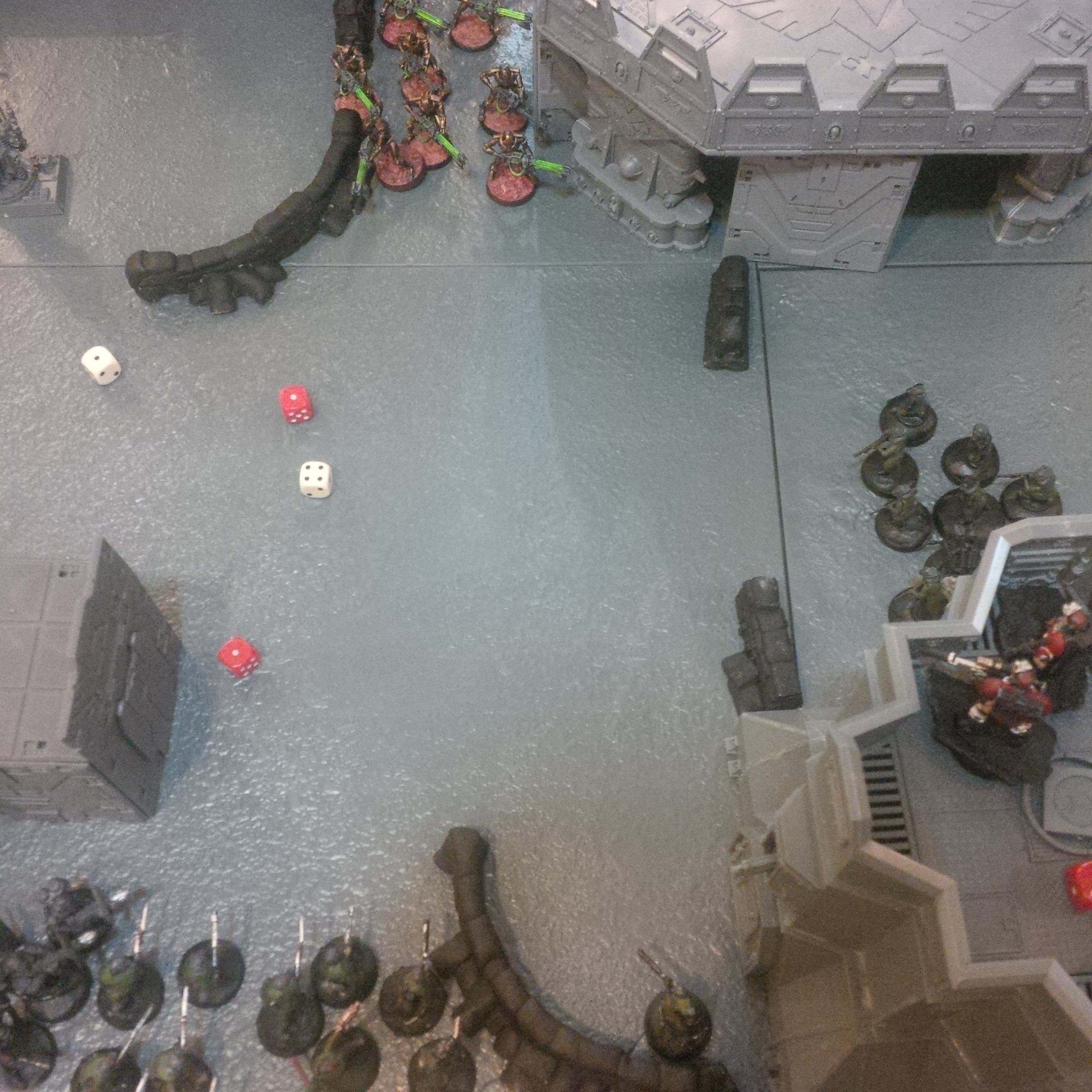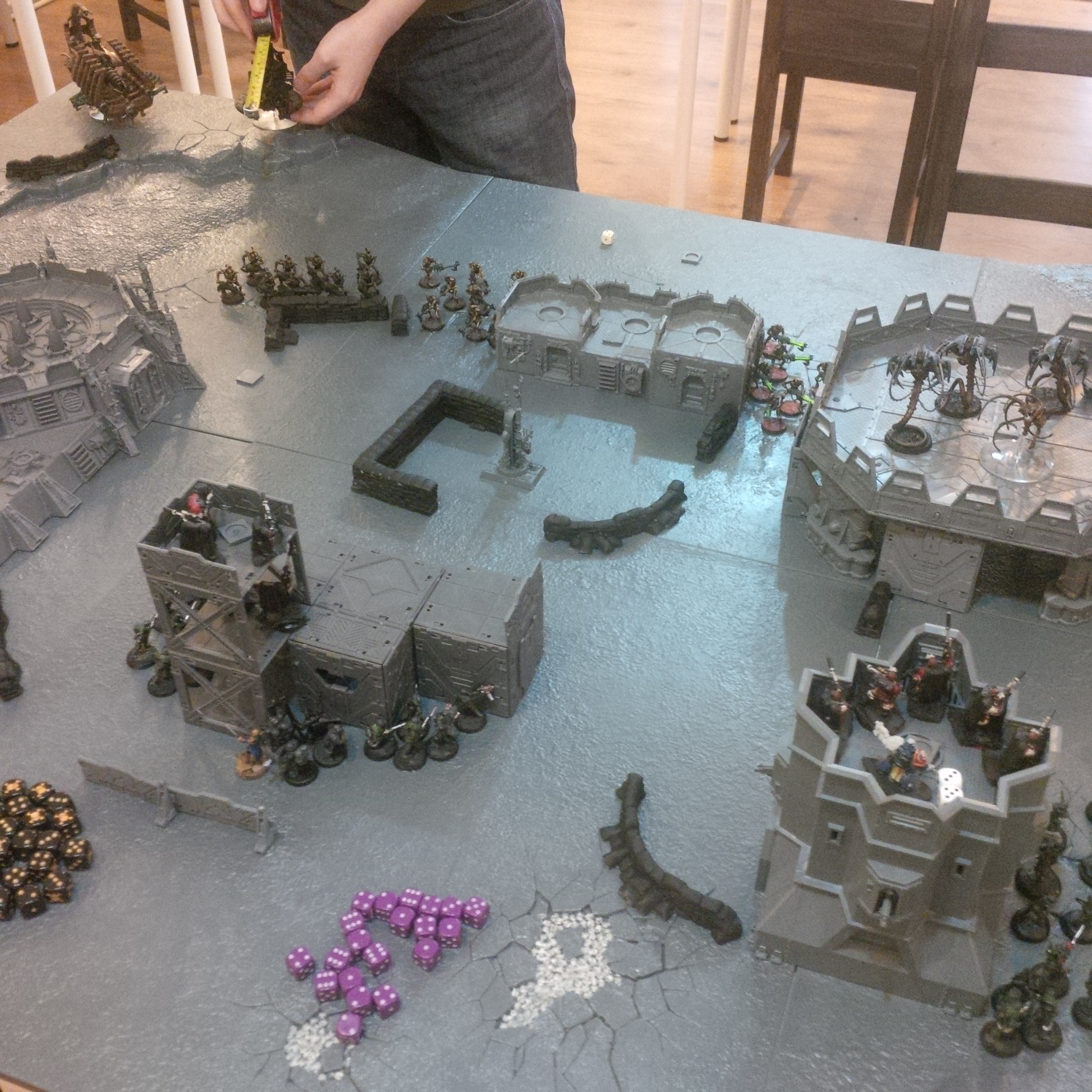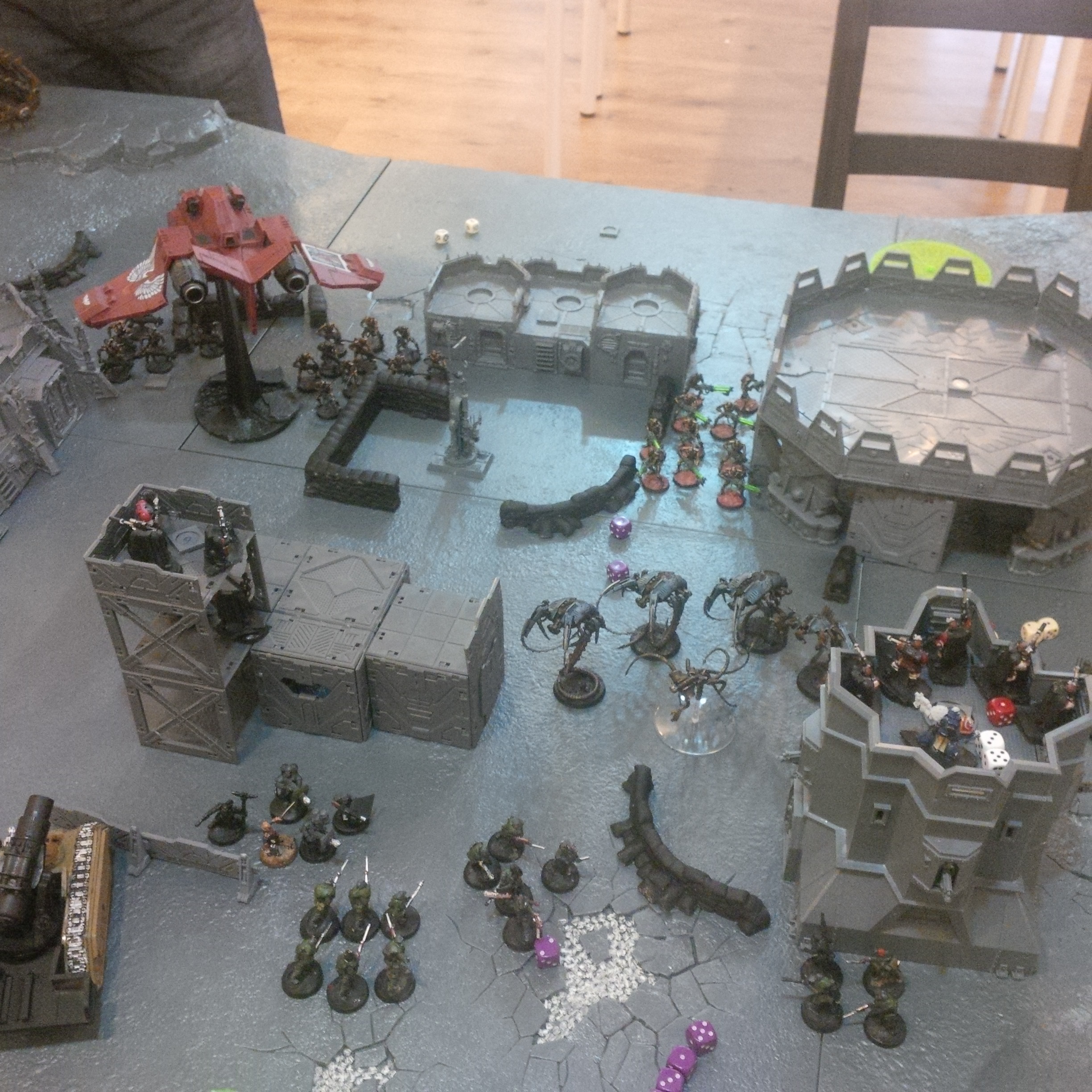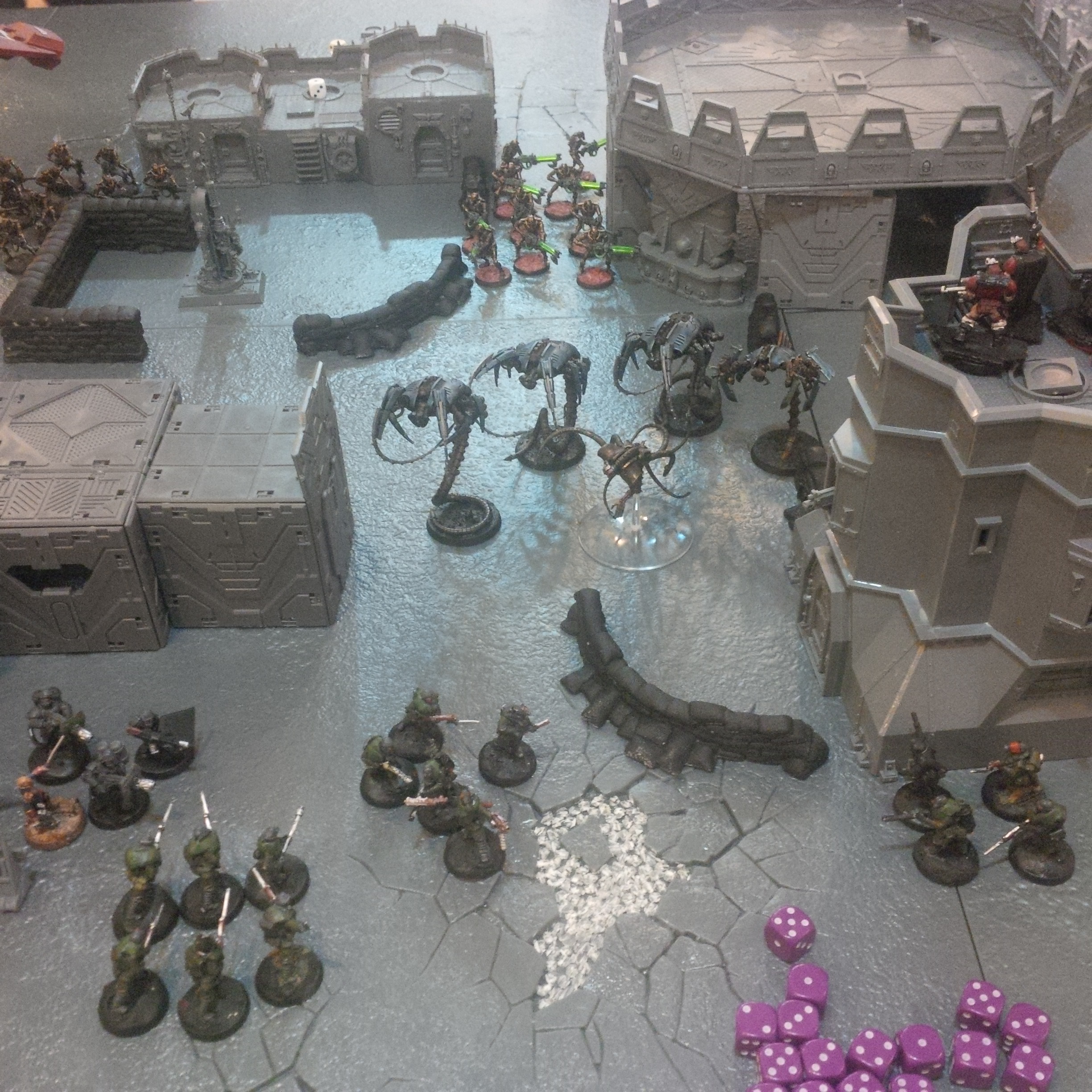 The idea was a 2000pt DkoK assault brigade versus a 2000pt CSM force on vraks. The CSM were rolling down the trench lines before coming into contact with a krieg counterpush by mechanised assets, cavalry and a couple of platoons. We had fought the game sidewise down the board and the CSM player had two dread claws (models at home so two cups...for shame) which he could assault out of. Each single bunker was one VP, the large bunker 2VP and included slay the warlord and line breaker. We houseruled that vps were counted at the end of the game.