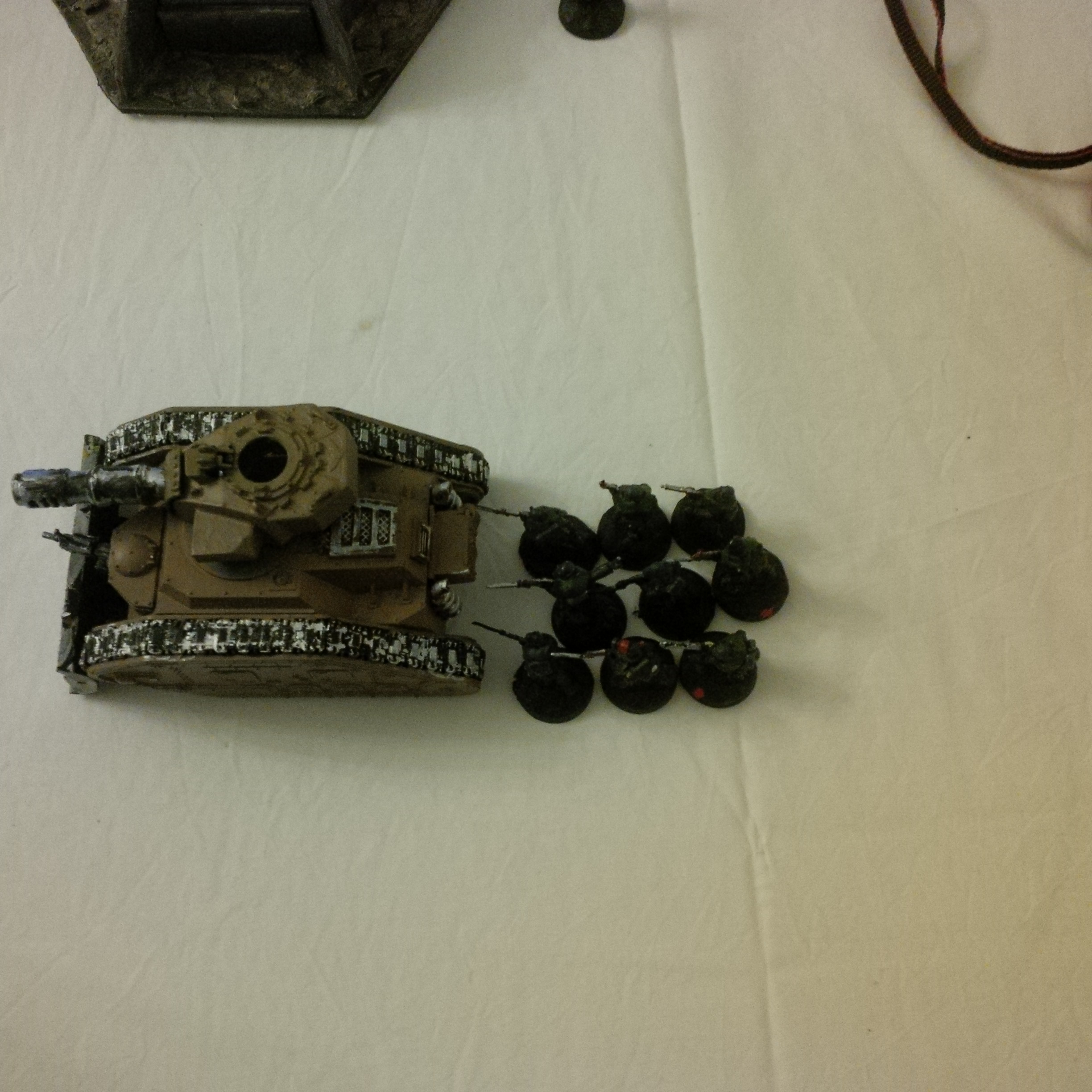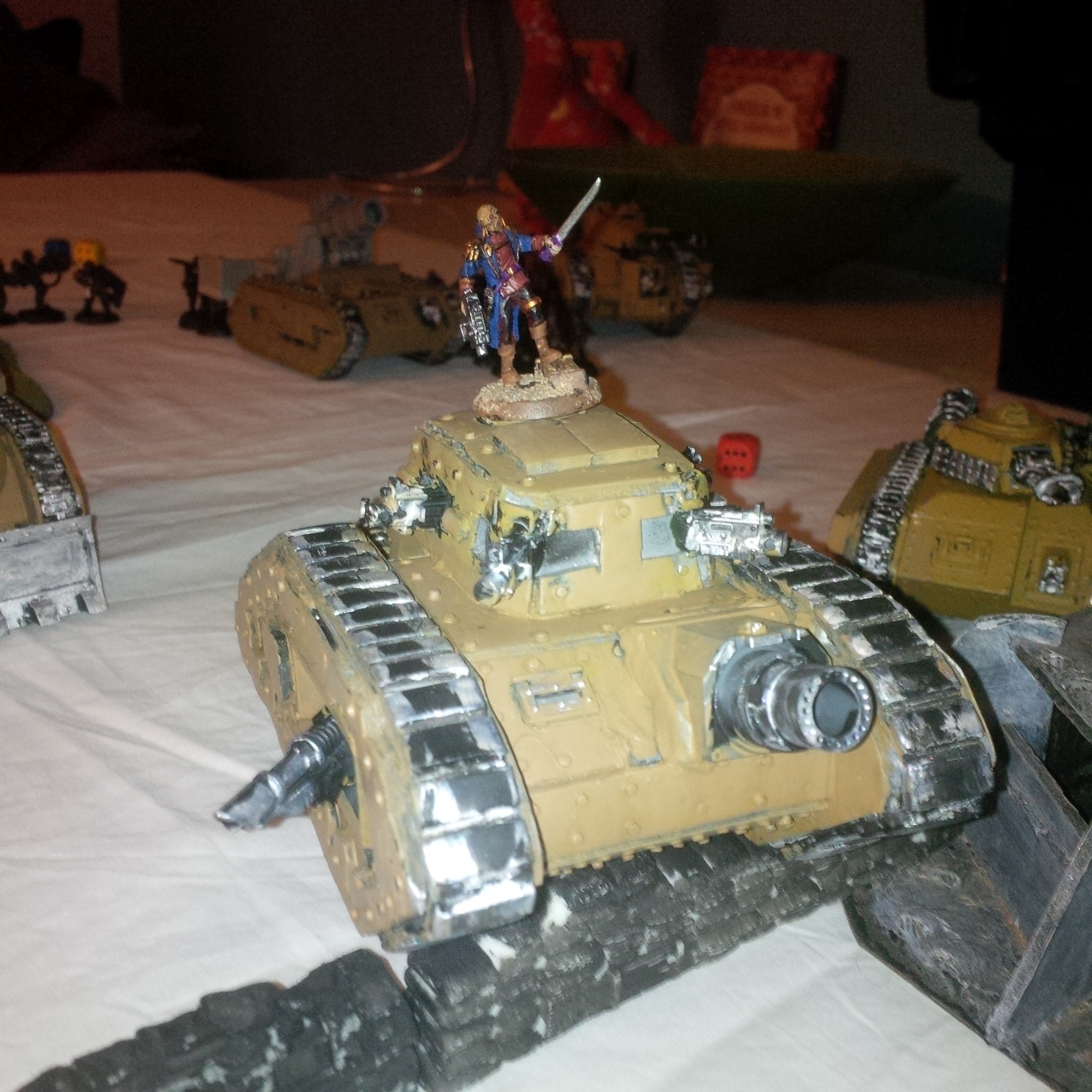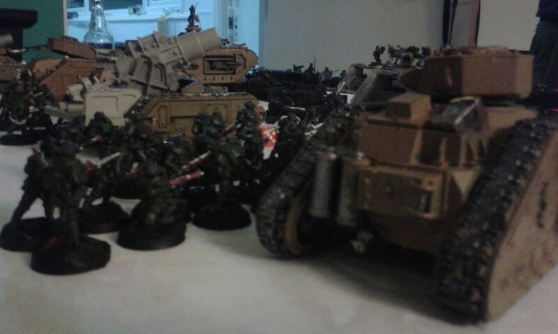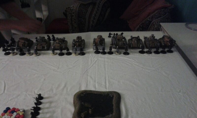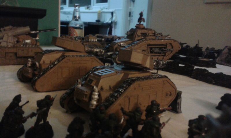 High atop his cupola on the relic vanquisher 'Mortua ferrox' colonel 92 was quick to move his assets into a wide dispersion. Orders had set him on an attack vector, one which he would refuse to enter unless on a oblique movement. He had enough firepower in his five Leman Russ to make a mockery of anything these rebels could throw at him.