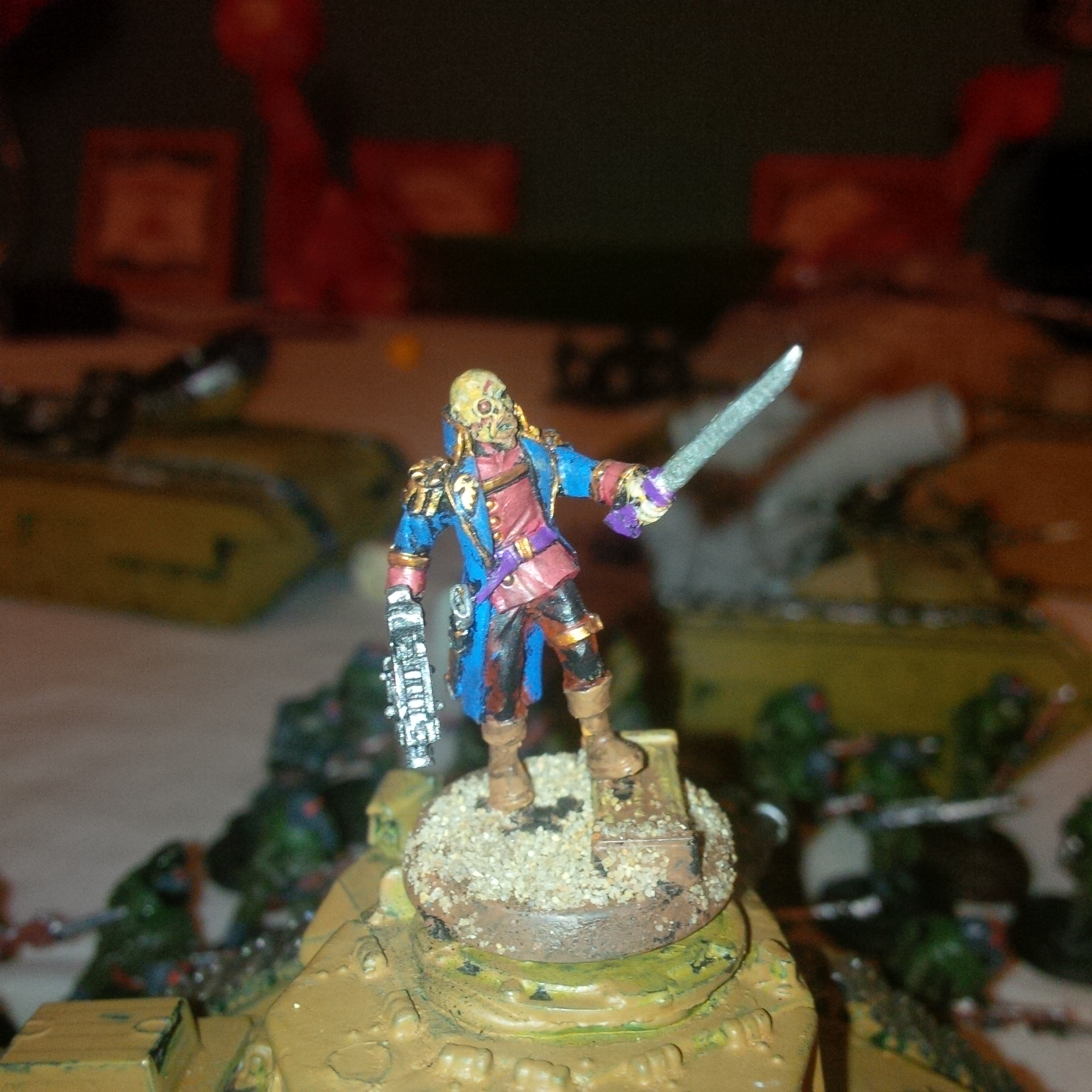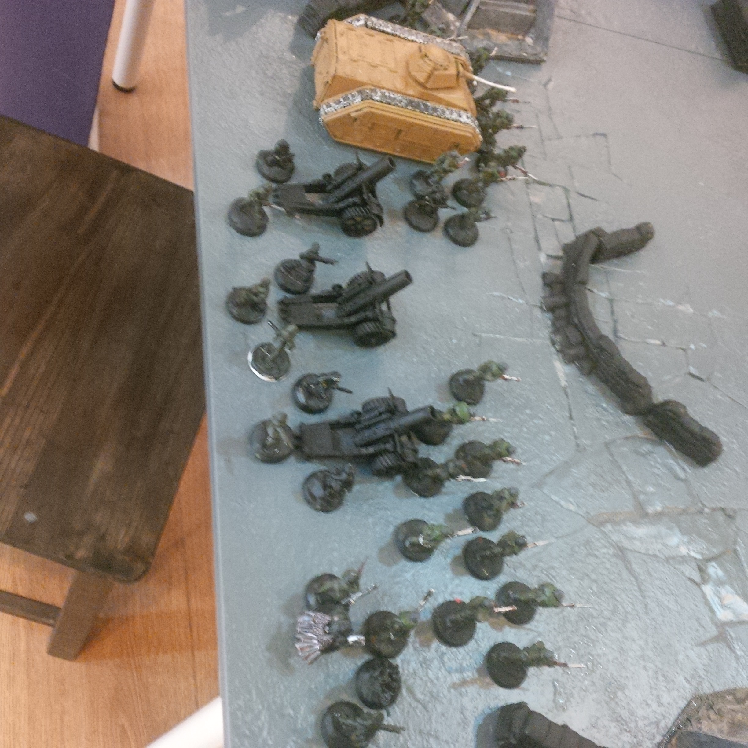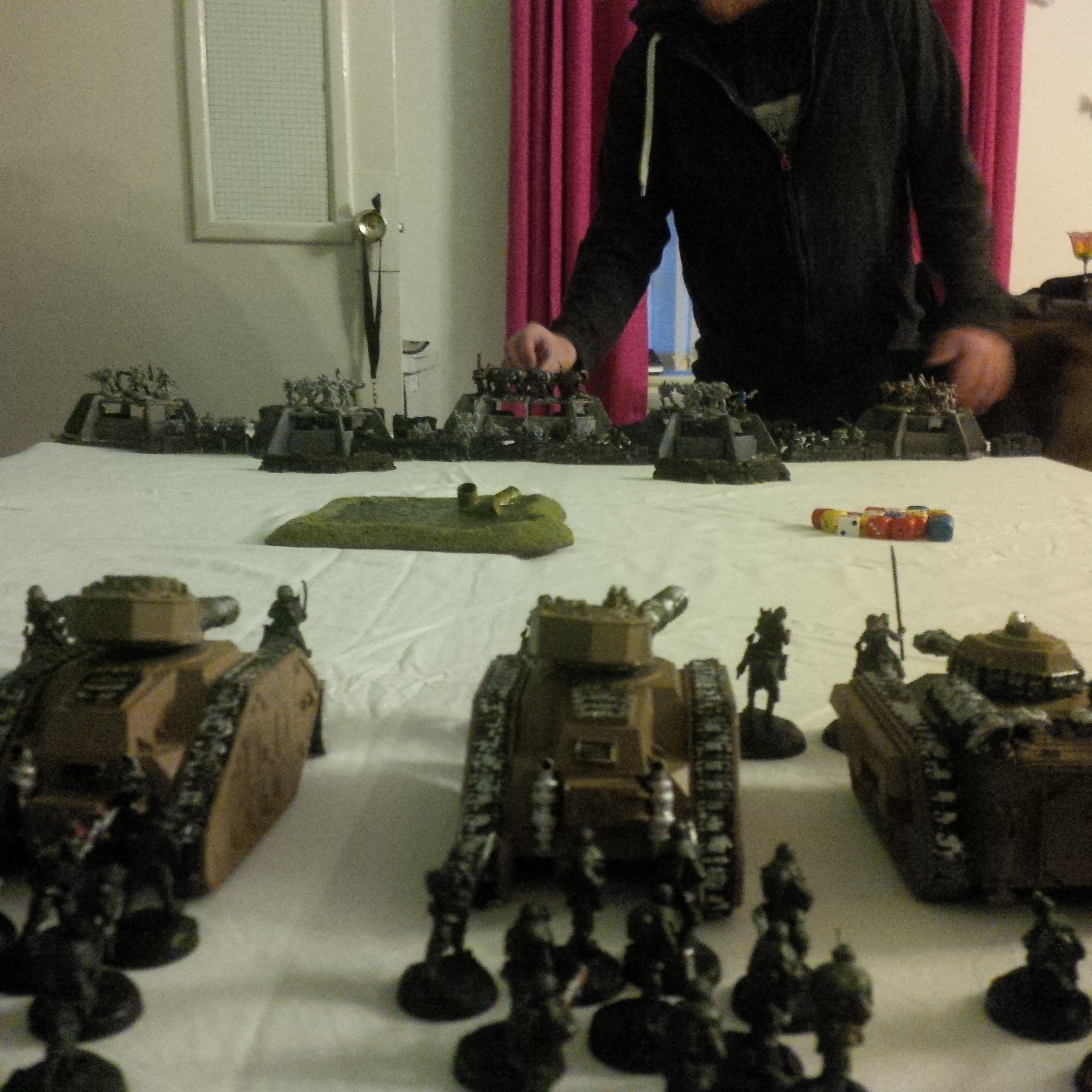 High atop his cupola on the relic vanquisher 'Mortua ferrox' colonel 92 was quick to move his assets into a wide dispersion. Orders had set him on an attack vector, one which he would refuse to enter unless on a oblique movement. He had enough firepower in his five Leman Russ to make a mockery of anything these rebels could throw at him.