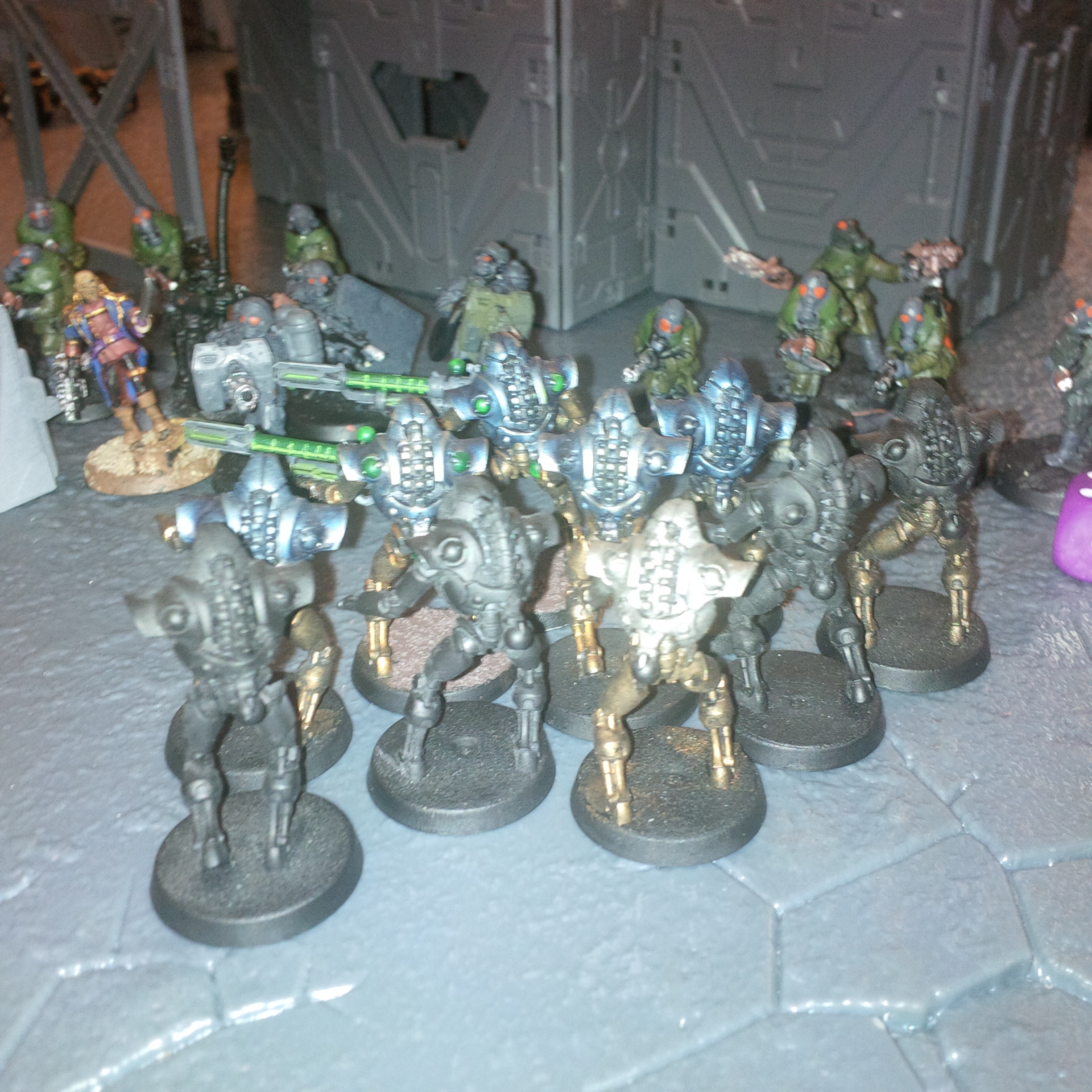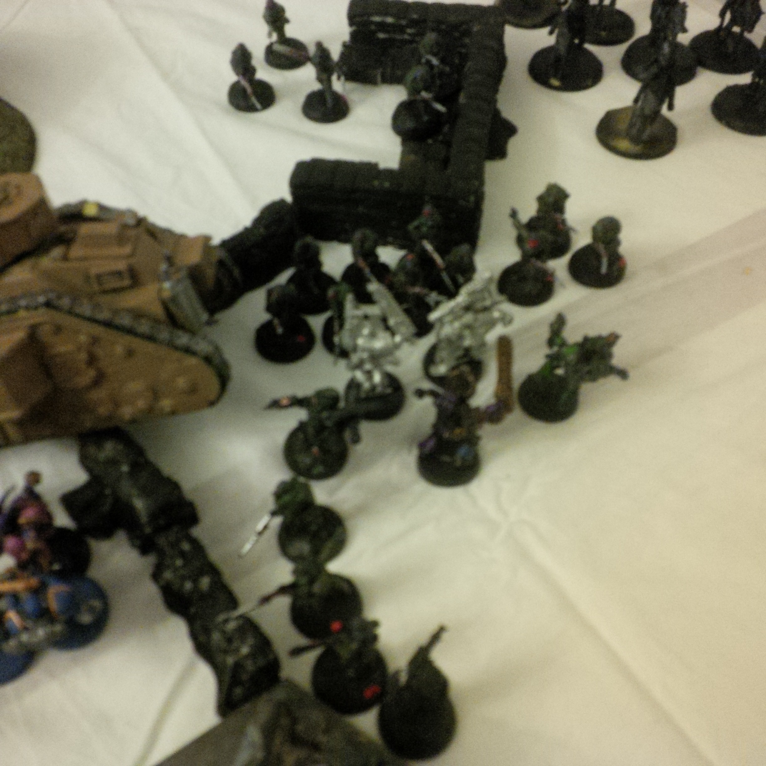The colonel was interrupted by the shouts of his gunner. He had a shot loaded and primed. Chanting the blessed incantations he lined up his shot and the bio-mechanical demon was brought down, it's shrieks echoing across the battlefield. The executioner turned it plasma blastgun and in a sustained maelstrom of fire saw the mechanical warriors evaporate..or returned to whence they came. The field was starting to turn. Another battlecannon shot saw a whole squad of swooping jet pack troops annihilated. Still the toll on his men was astronomical and it was quickly obvious that the renegades had seized most of the objectives. They were pouring a ferocious hail of auto and las shots into the Krieg, who were now pinned behind a line of sandbags.