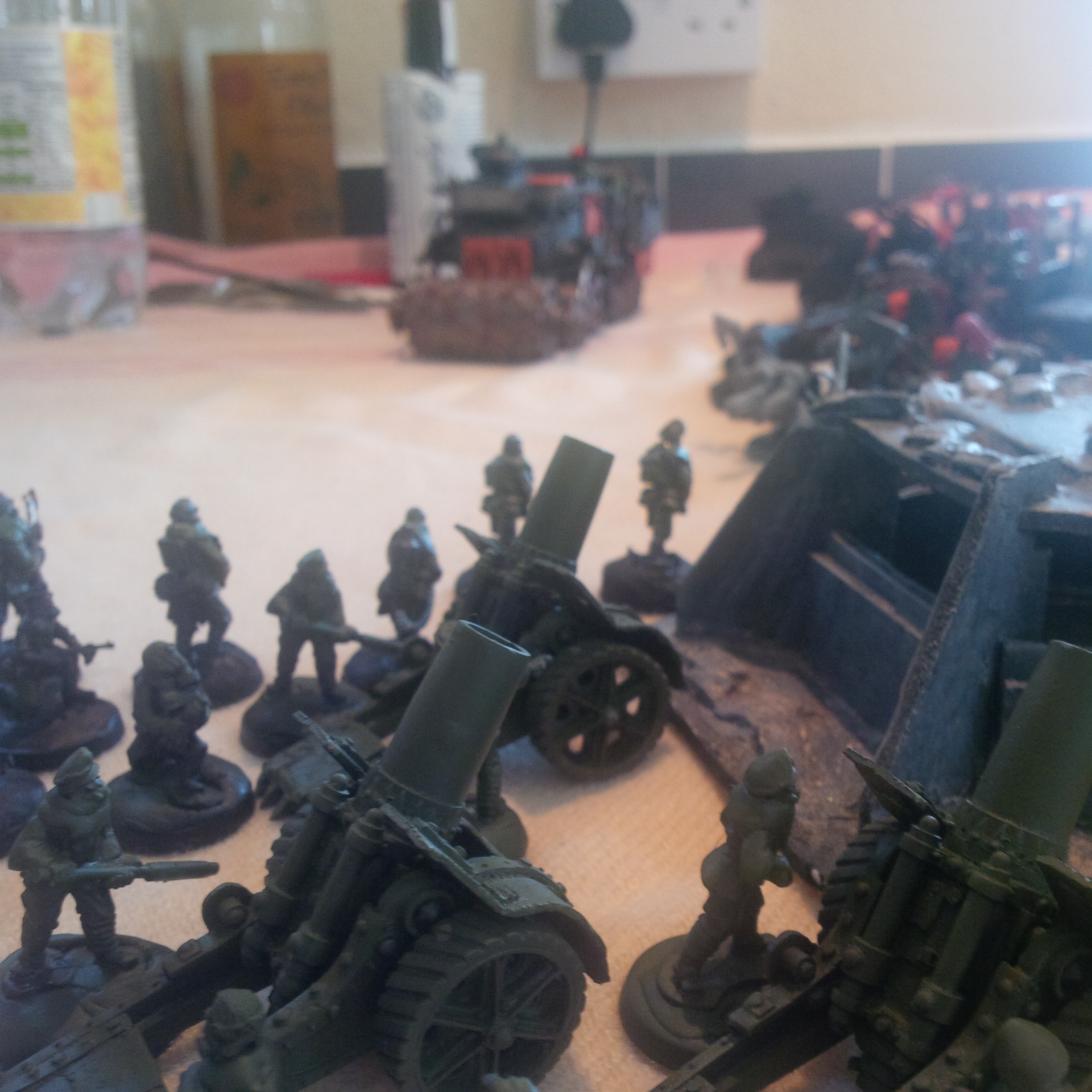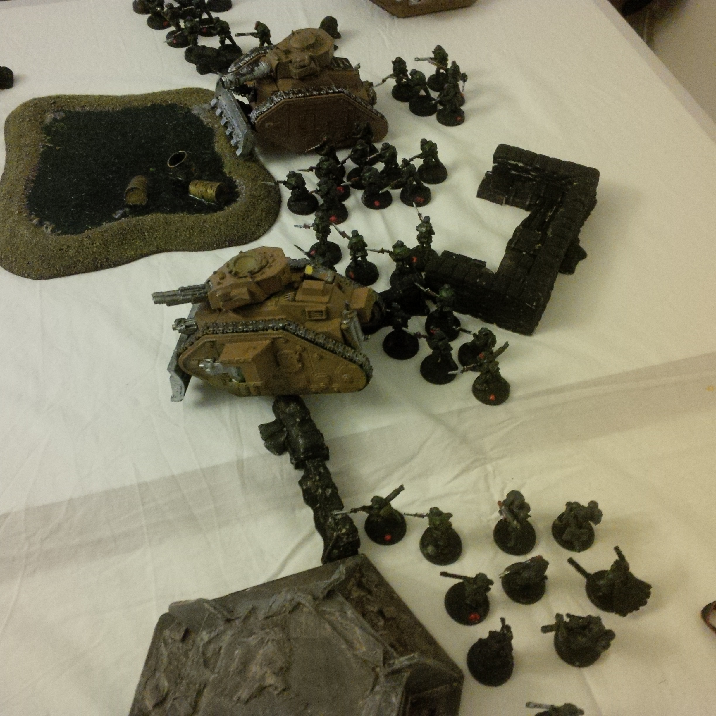 His answer was not long in coming. Striding out of the mist far to the front near bunker complex 28b came a ragged procession of renegade PDF. Behind them he spotted two large trucks carrying what appeared to be cannisters. A simple yet brutal tactic he quickly voxed back the information to headquarters. The enemy now had access to potent chem weapons. He noted with shame that they carried looted lasguns...this outrage must be avenged. slamming down the cuppola hatch he issued orders to engage!