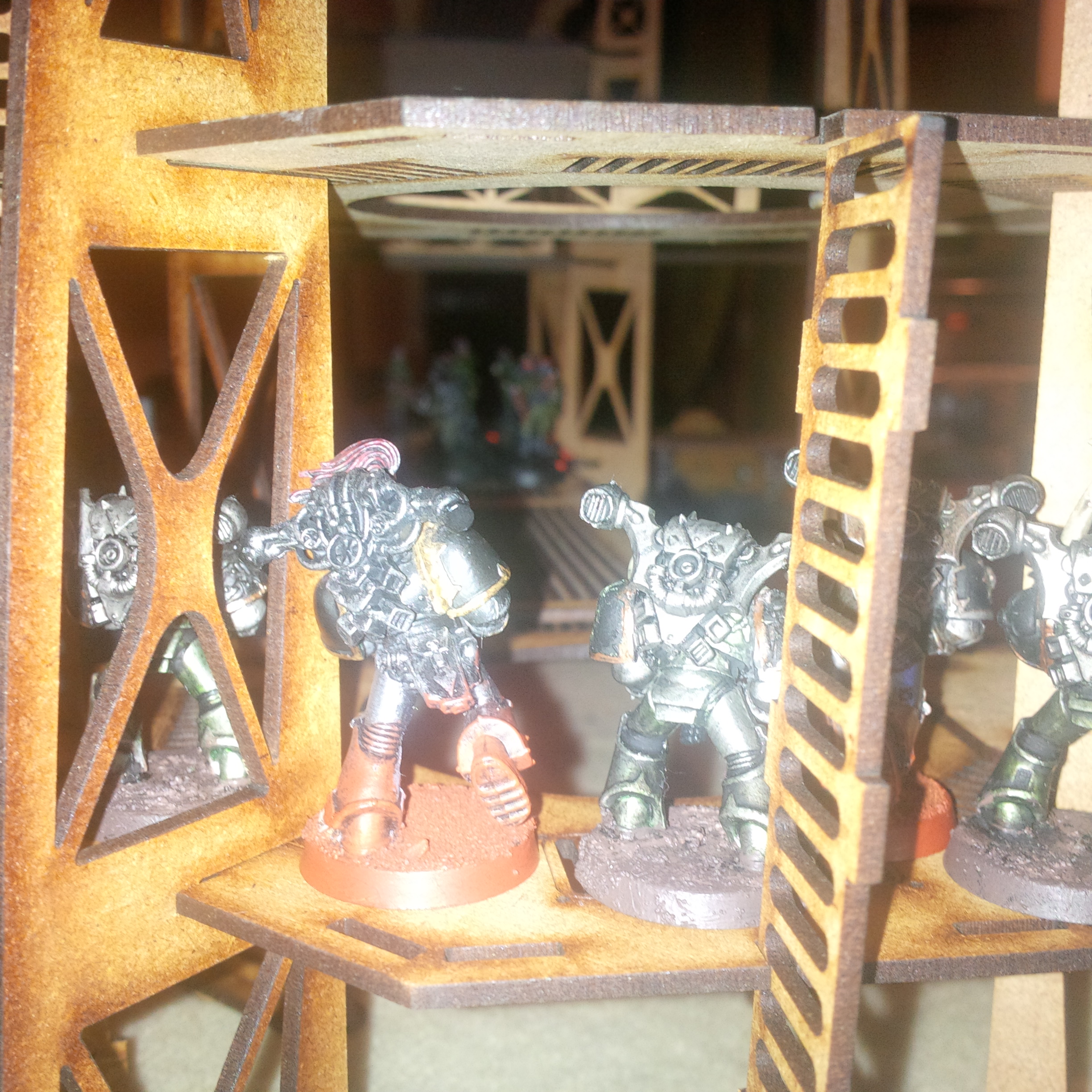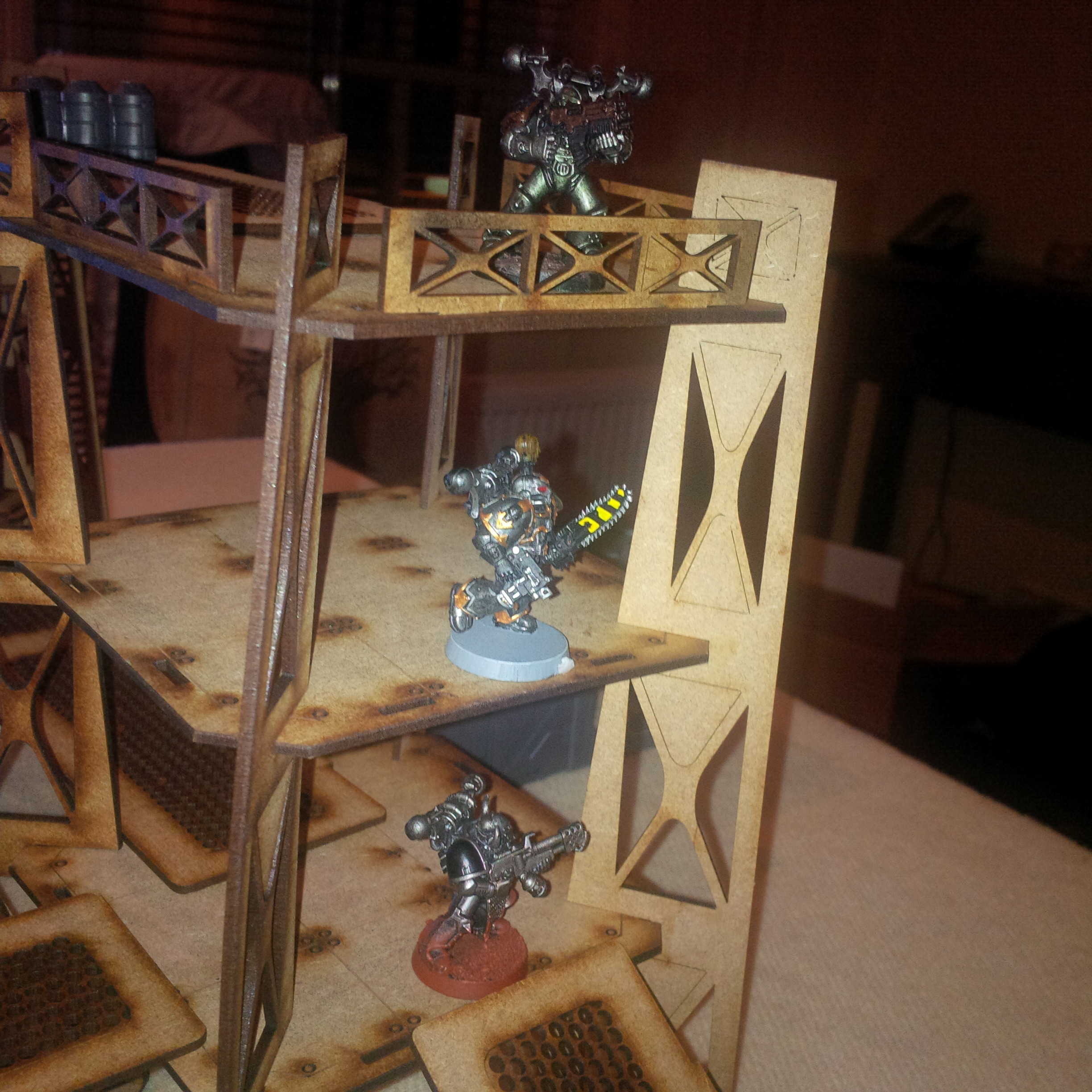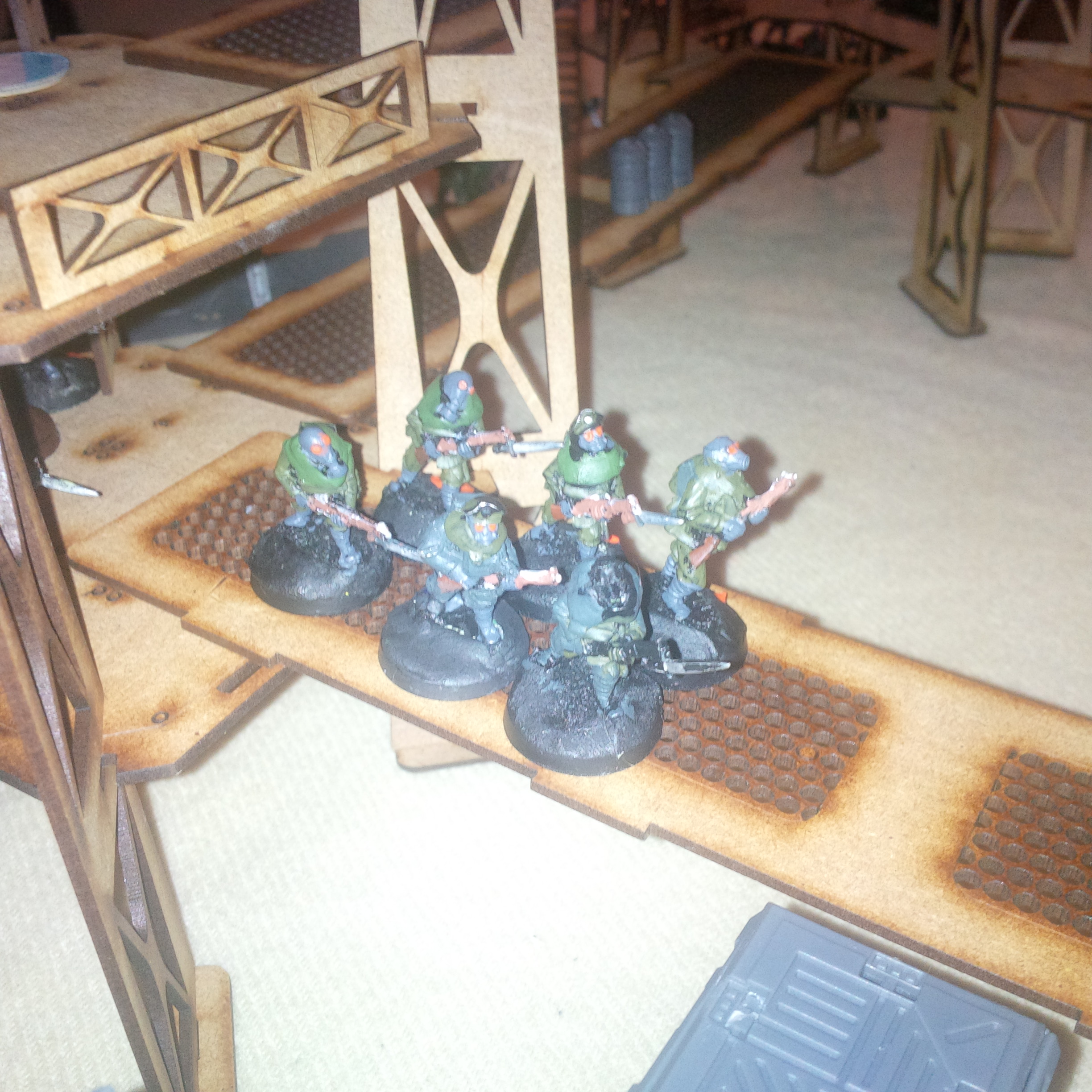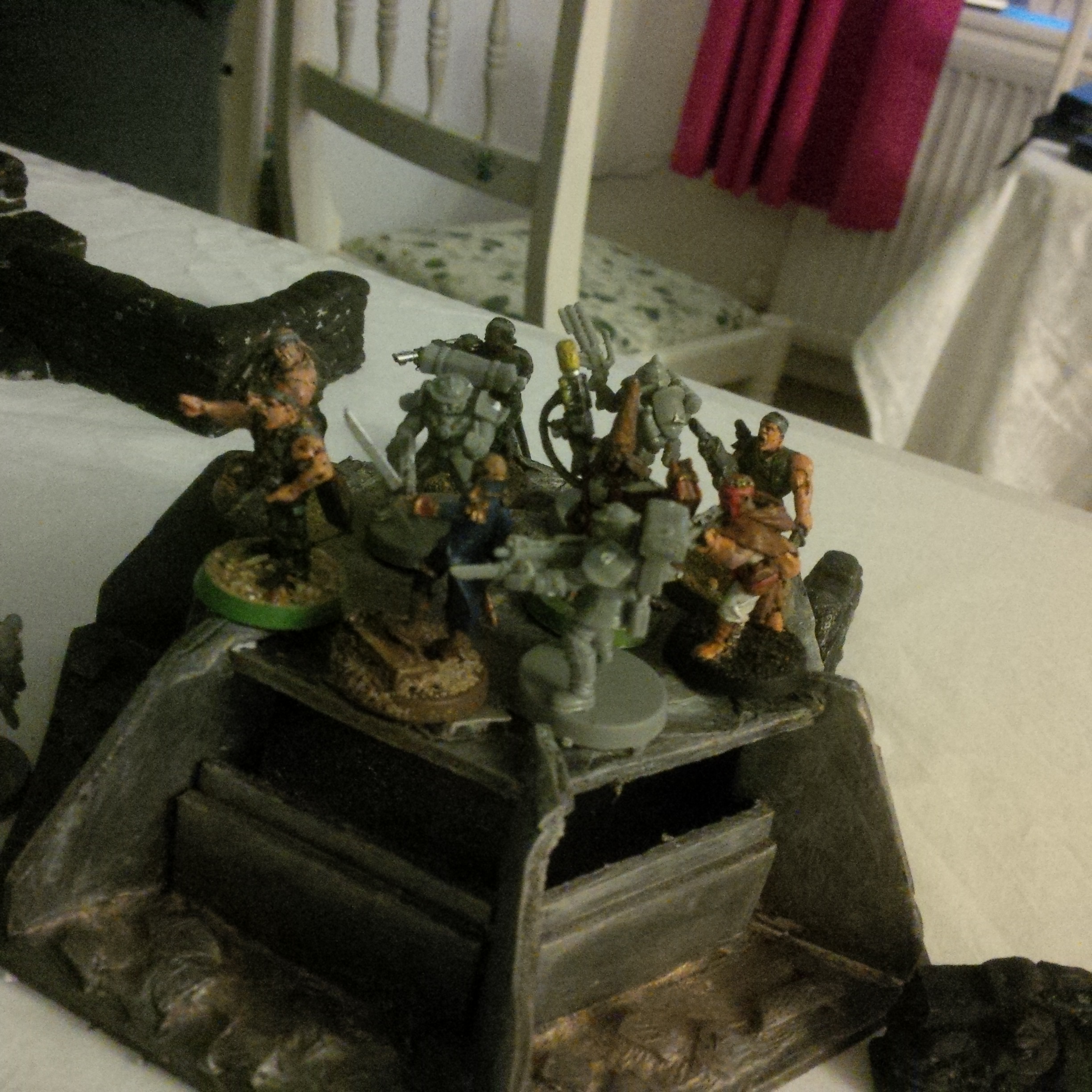 So the next game involved another chaos player...my GF. she's running a iron warrior-nightlord warband (nicer looking than my badly painted lot). The game was on a small amount of my necromunda scenery and involved paper markers representing the launch control systems to a planetary defence laser. Chaos and IG had rushed forces to contest. Will write a battle rep when I'm done and post the rest of the pictures. In short a draw. Bolter fire on gantries wipes entire platoons off the board. Thank god krieg don't run.