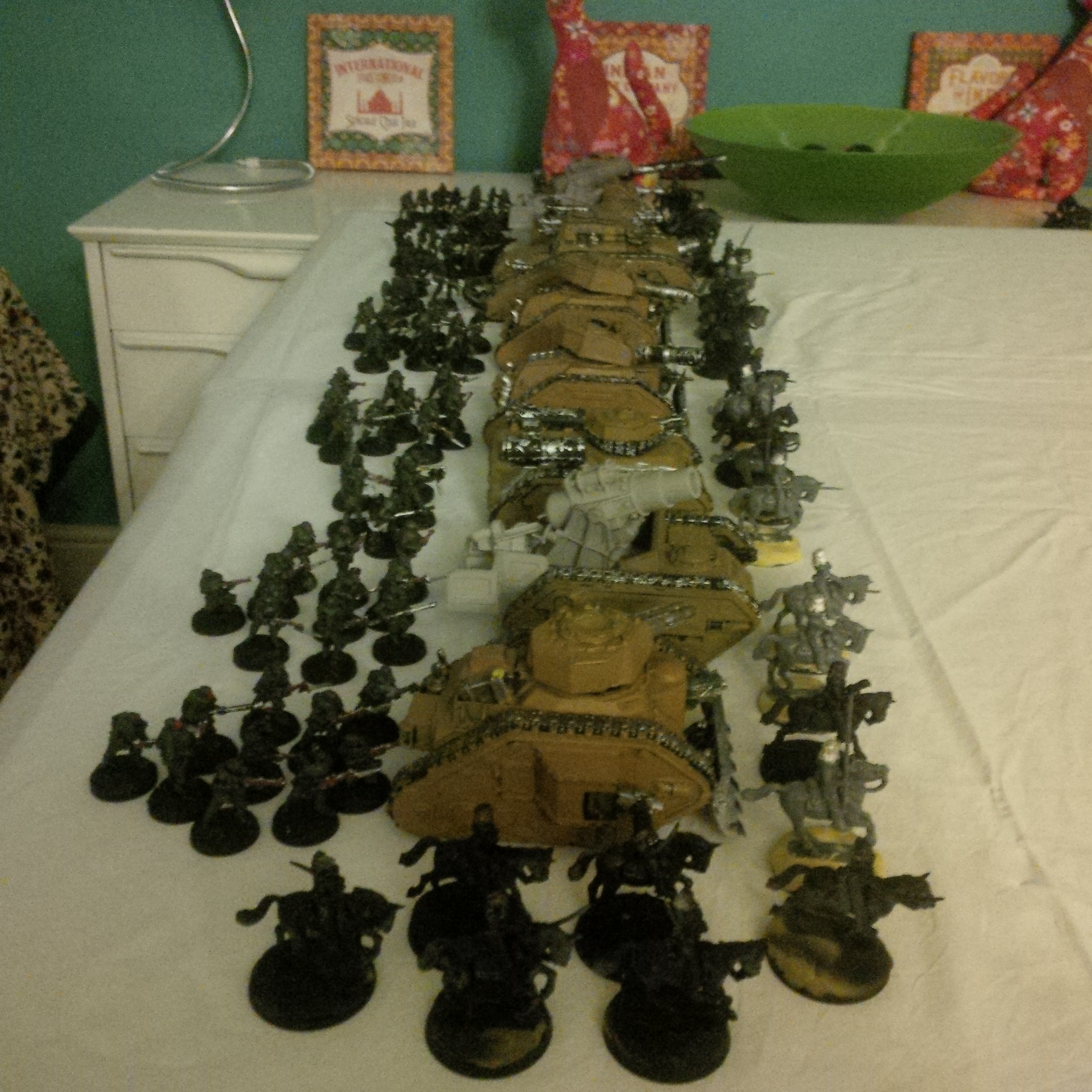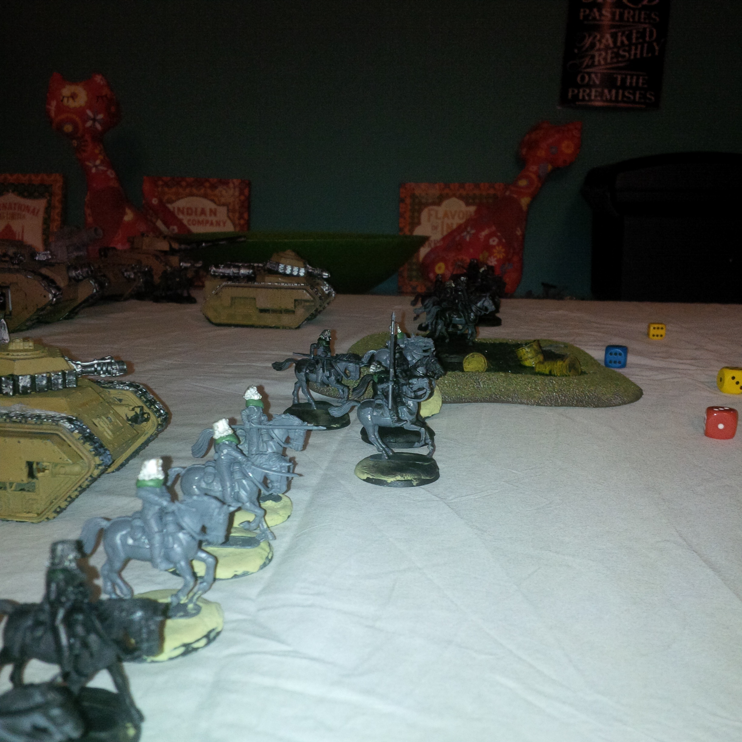 Not a lot of long range firepower to combat my rolling wall of death. So my plan was to trundle forward with tanks and shoot things till they die. Troops pour forward and flood the enemy trenches. They would be covered by a charge of the light brigade style assaultaccompanied by two hellhounds . Death or glory!!