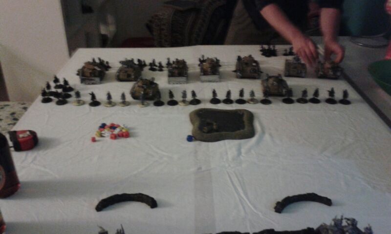 Chaos deployed first and gained first turn. He spaced three huge (40mini's in each) squads of cultists covering a vindicator. In amongst one of the squads was a dark apostle placed to give two of the squads fearless. I deployed in a line trying to maximise my tanks coverage of the enemy and try and counteract his deepstrikers.