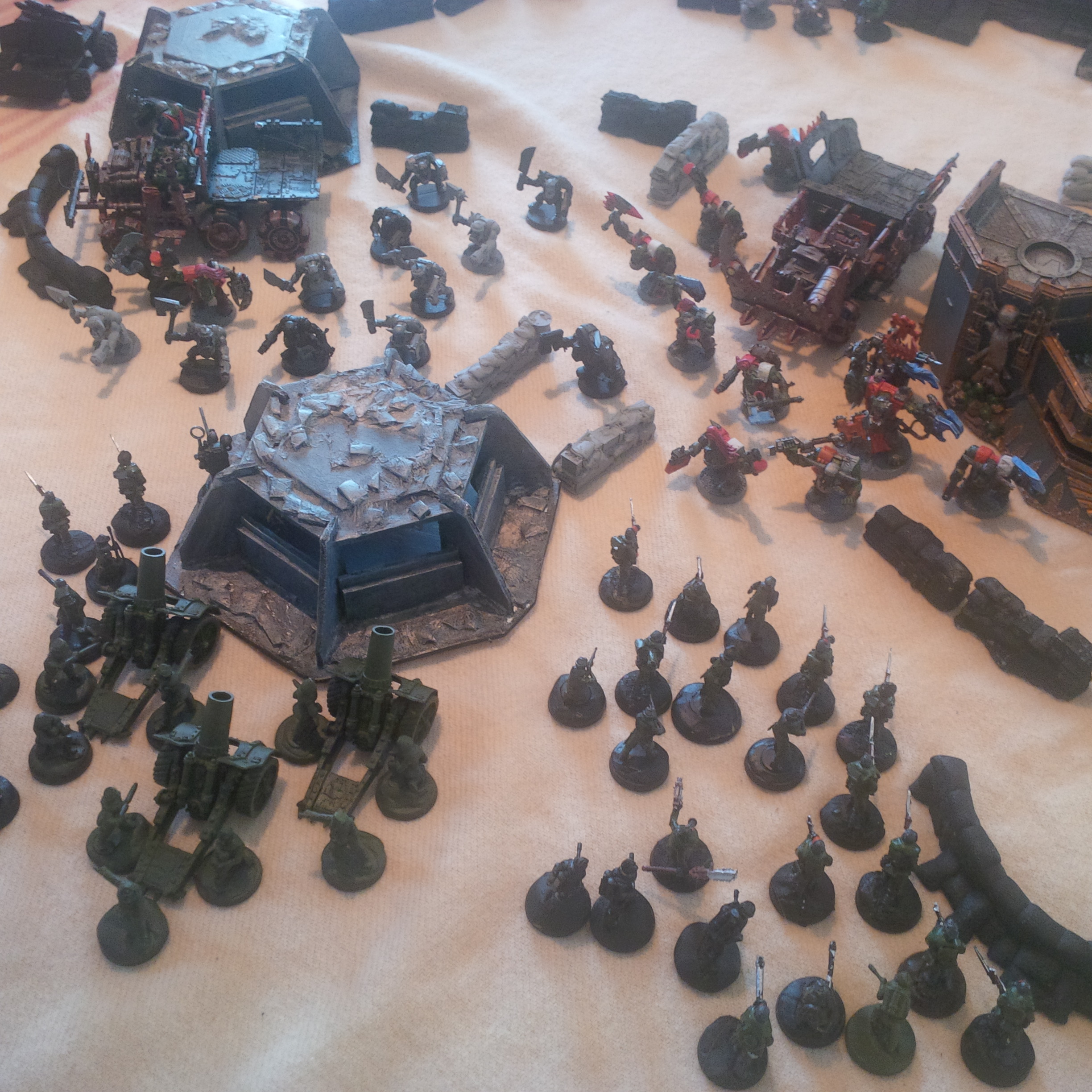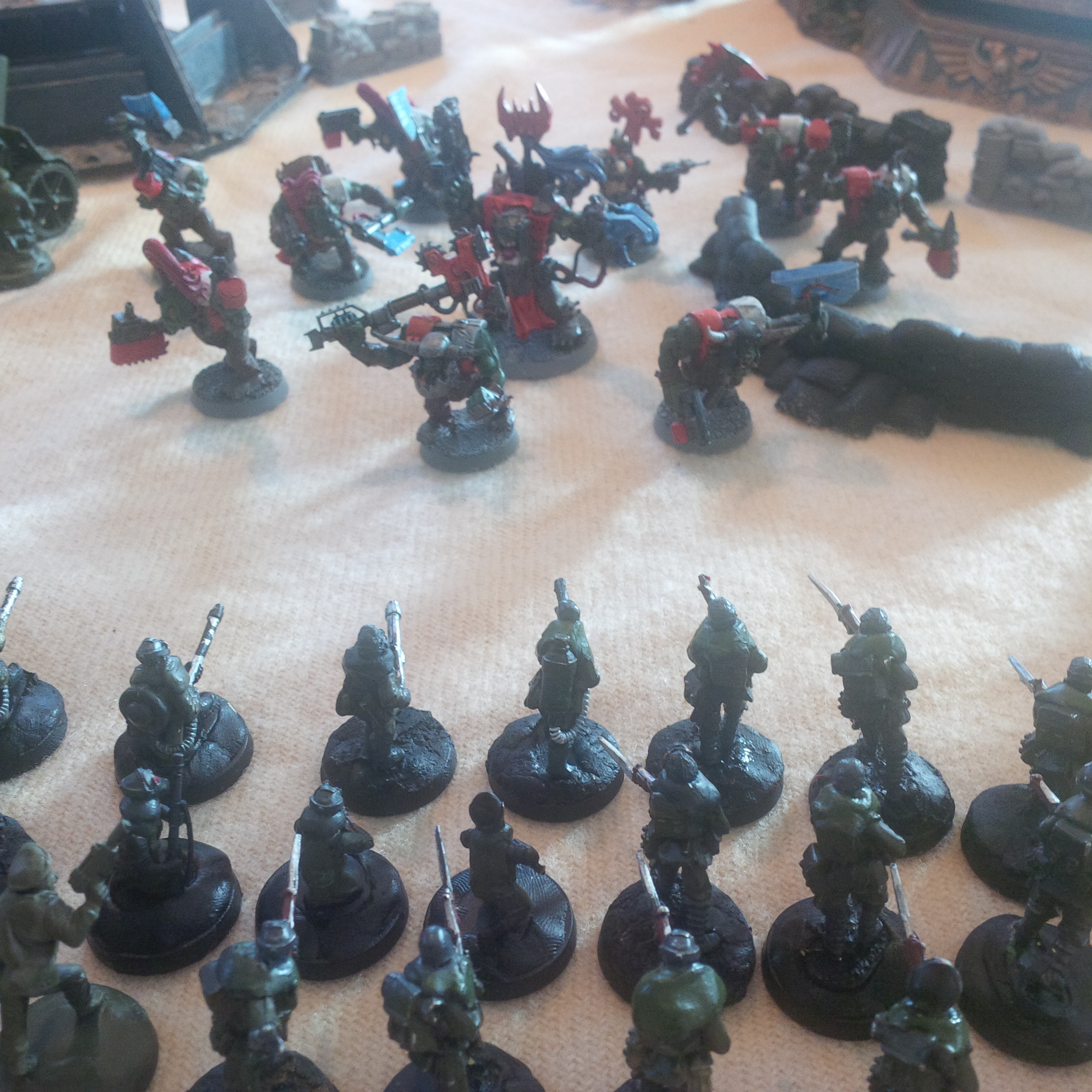 A very simple board (a sheet) some bunkers a friend knocked together, alongside some sandbags and we had ourselves a fun holiday (not much stuff game). We were using a mix of minis..most of mine are converted krieg and chaos was using an old unpainted army he had lying around...sadly not his new painted raptors and noise marines!