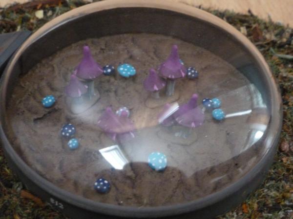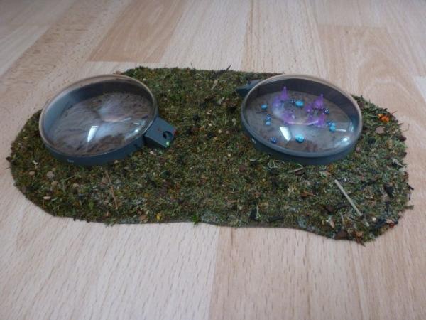 My girlfriend wanted to participate in this project and thus she painted a selection of tasty mushrooms for me to fill one of the green houses. The second one will be empty and temporarily out of order. (Sorry for the reflections! I polished the domes but now they interfere with my photography skills )