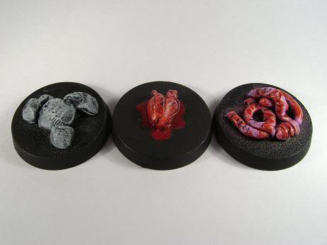 Secondly, maybe green stuff a heart. Deep reds should contrast the scheme quite well, and is a suitable subject for something that would be on a platter. I've done one a long time ago for my WHFB Ogre Kingdoms as upkeep markers.