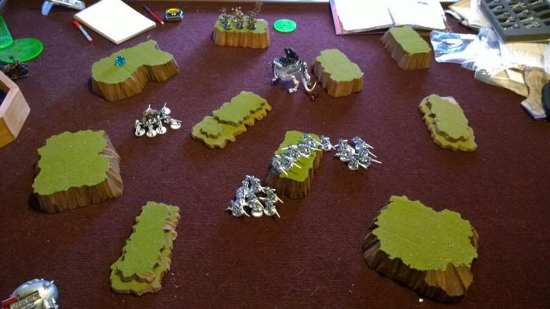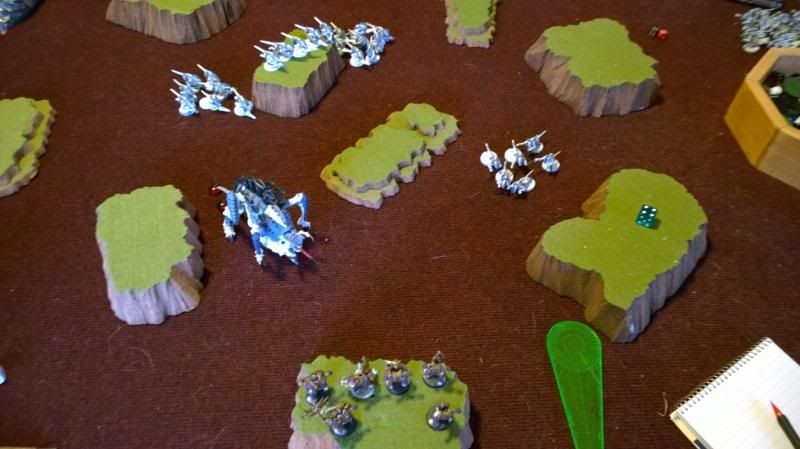 Turn 1 consisted of the Tyranids moving as rapidly as possible towards my forces. This means everything that could run, ran. The Tervigon birthed 8 Termigaunts and rolled doubles. Nothing was in range for shooting and so the turn passed.