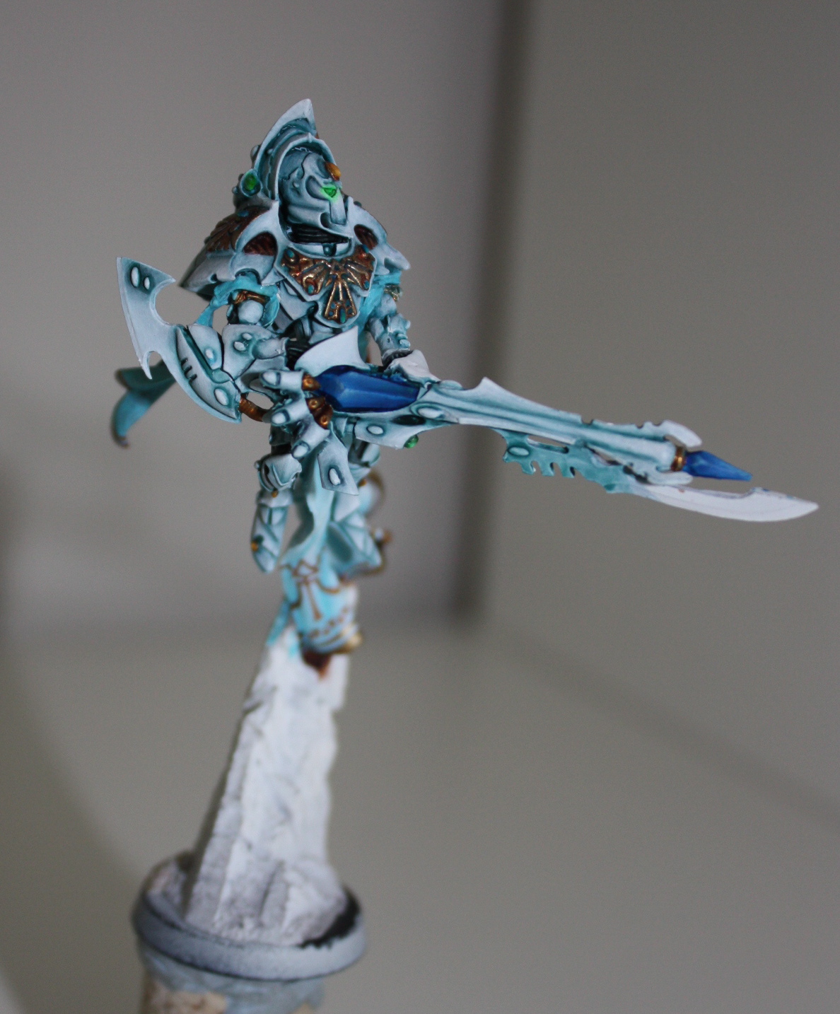 For Irillyth, I basecoated white, and then did a wash of 1:1 of Waywatcher Green:Guilliman Blue. Then it was straight in with Ceramite White... to be honest, there's not much difference between Skull White and Ceramite for this, I just prefer Ceramite, despite its tendency to separate out when watered down. I always water down my paints, but for this, I water them down A LOT. You want the paint THIN here, so that when you lay it down with the brush, it builds up the pigment, but slowly so that you avoid any harsh lines. I use a fairly small brush, and don't overload the brush and just go slowly and carefully. It does take time to build up the layers, but not as long as you might think.