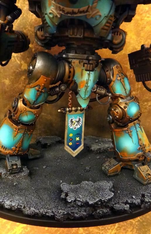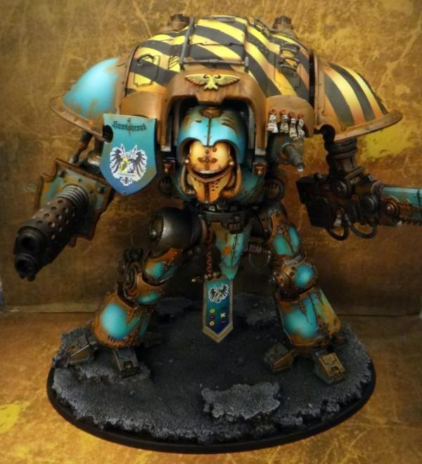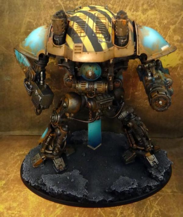 I like the overall color scheme and the skill in painting it is obvious, but I can't say that I like the weathering. It looks like it's been neglected and left out to rust, which is not the appearance a Knight should have to me.