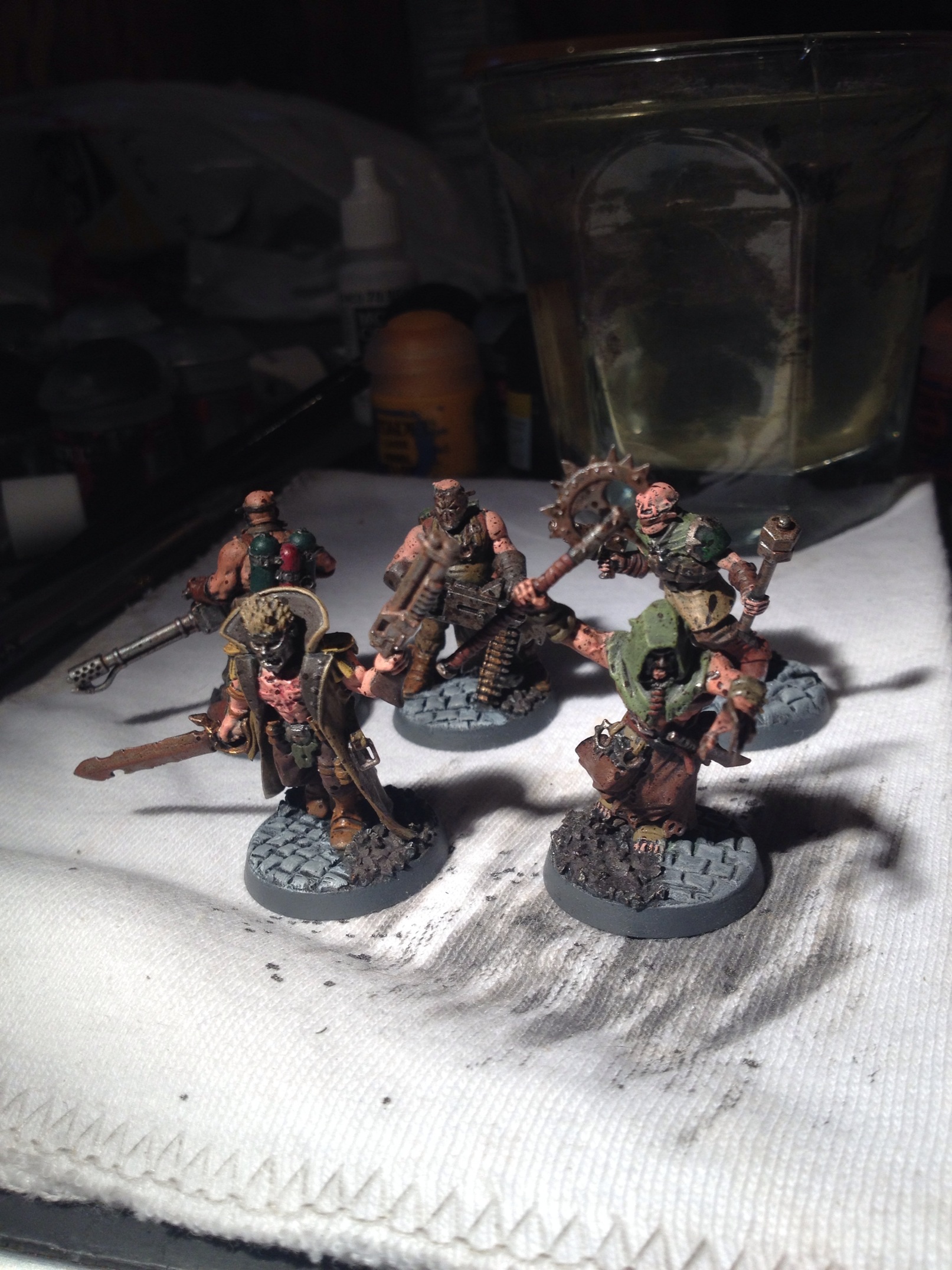 From what I can see they're looking good! I'd only add some soot (I believe that's the word) to the end of the flamer to give it a look that's a bit more realistic, and helps break up a slightly large space of bare metal.