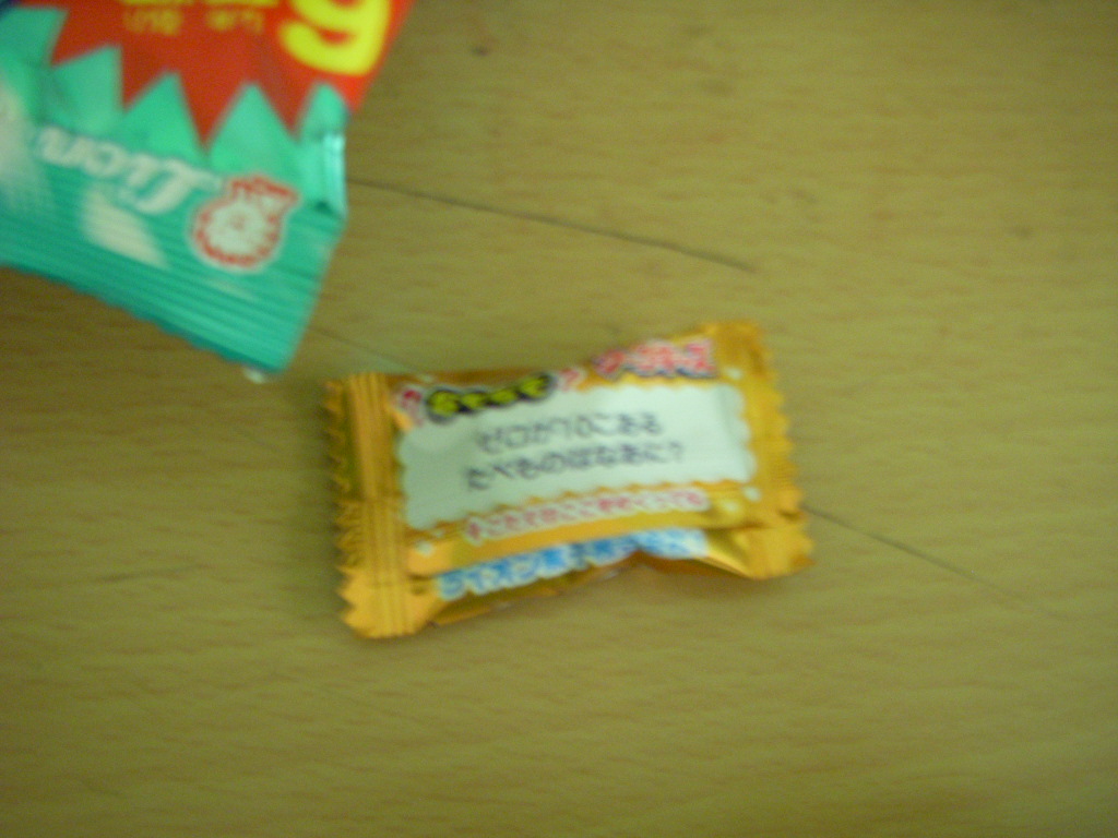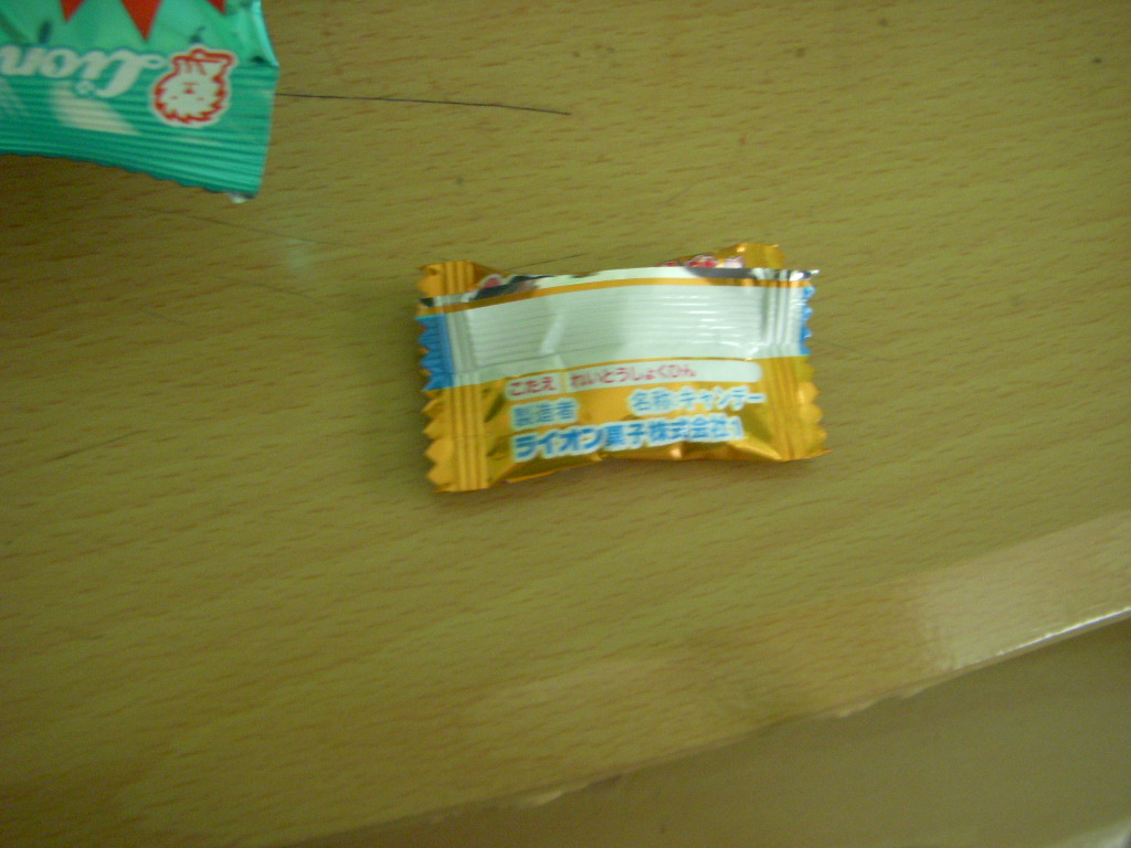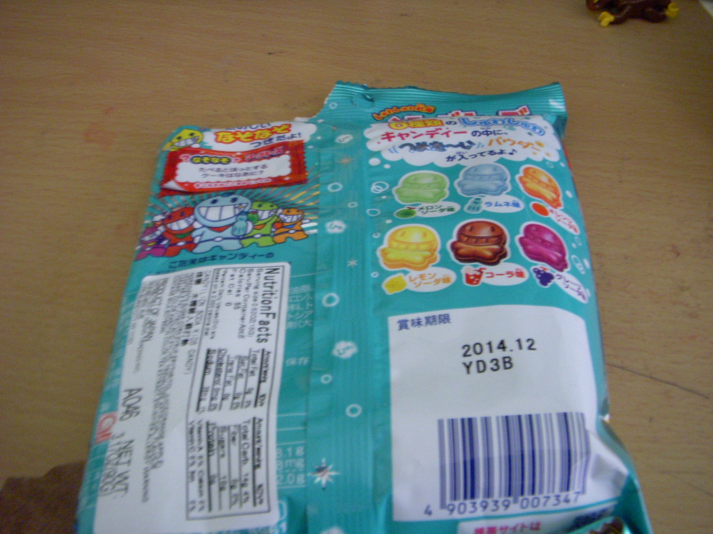 It's Soda Kids. The front lists the flavours, which are actually pretty pedestrian for Japan. The back has a quiz and an answer when you flip the wrapper up. I can't read it as my eyes don't do fuzzy anymore. It also has the name of the company, KK Lion Candy.
