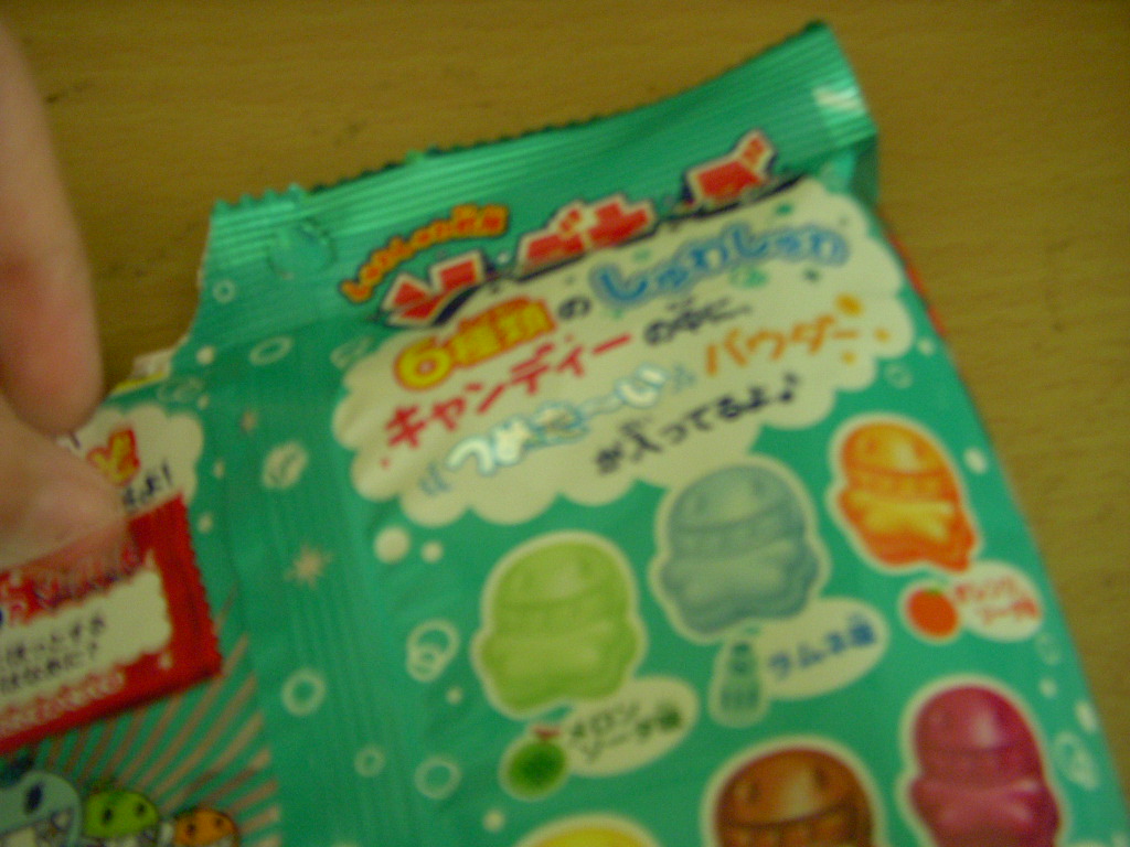 Bookwrack wrote: You bought a pack of Soda-Kiss, which looks like hard candies that come in lemon, grape, ramune, melon, cola, and orange flavors.