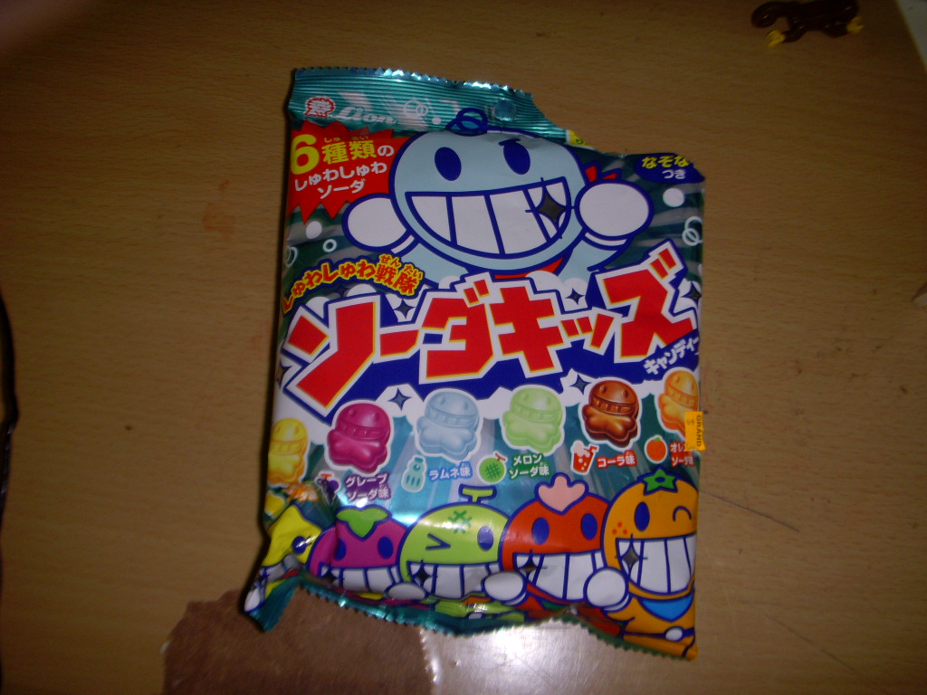 You bought a pack of Soda-Kiss, which looks like hard candies that come in lemon, grape, ramune, melon, cola, and orange flavors.