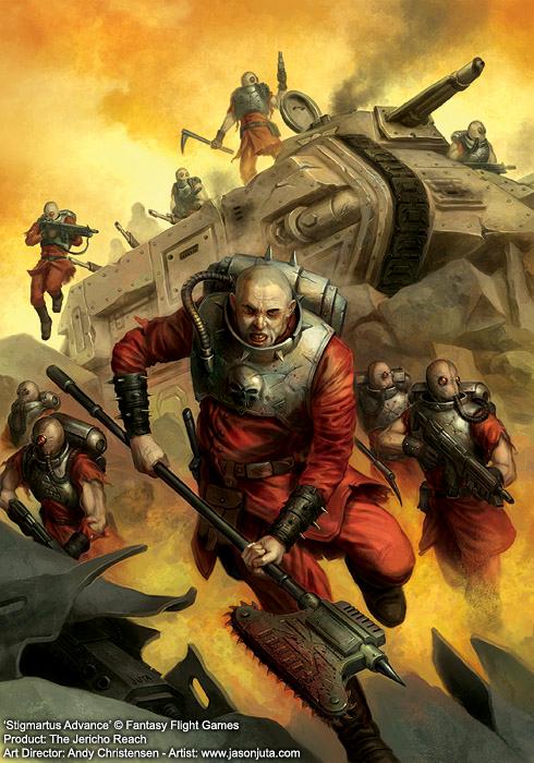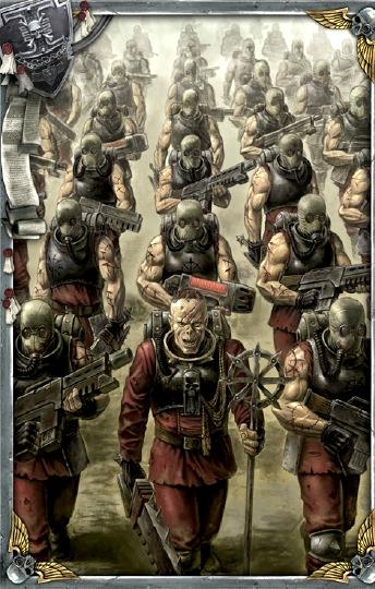 I'll make you a summary: consisting of Renegades, Imperial criminals, cultists, and rogue psykers, the Stigmartus was named for the ritual branding of its members' flesh with the sigil of their Chaotic masters. Although they are brutal and frenzied to the extreme, like the Blood Pact they maintain harsh discipline and military-style professionalism, and are organised along the lines of an Imperial Guard regiment. Stigmartus are bound to the charismatic leadership of a cult-general and self-proclaimed god known as Elak Sarda, who is said to be sworn to the service of a daemonic entity within the Charon Stars.