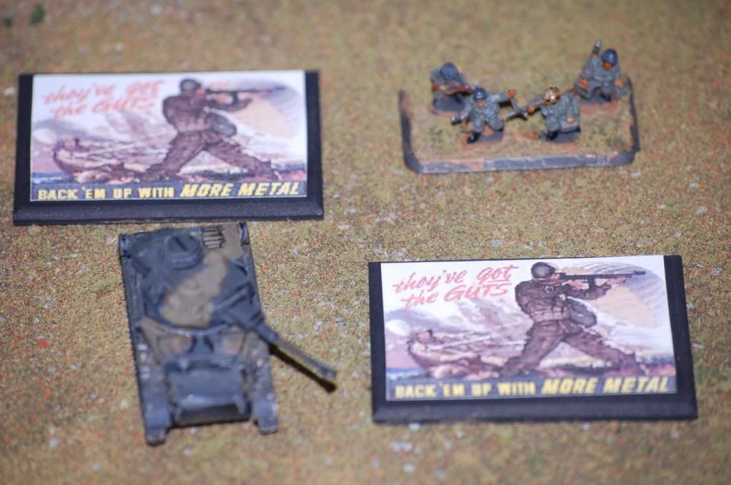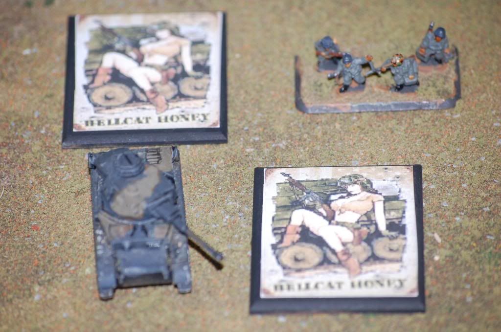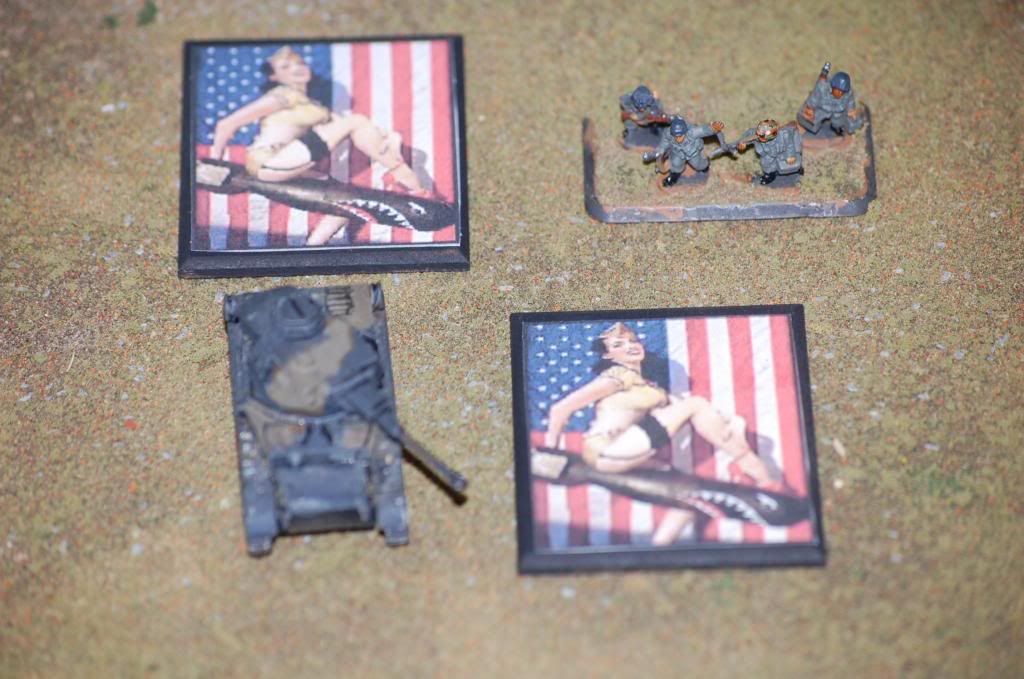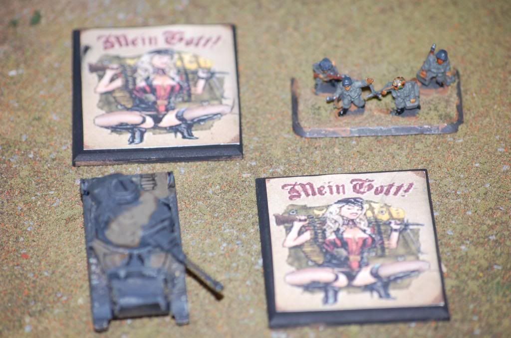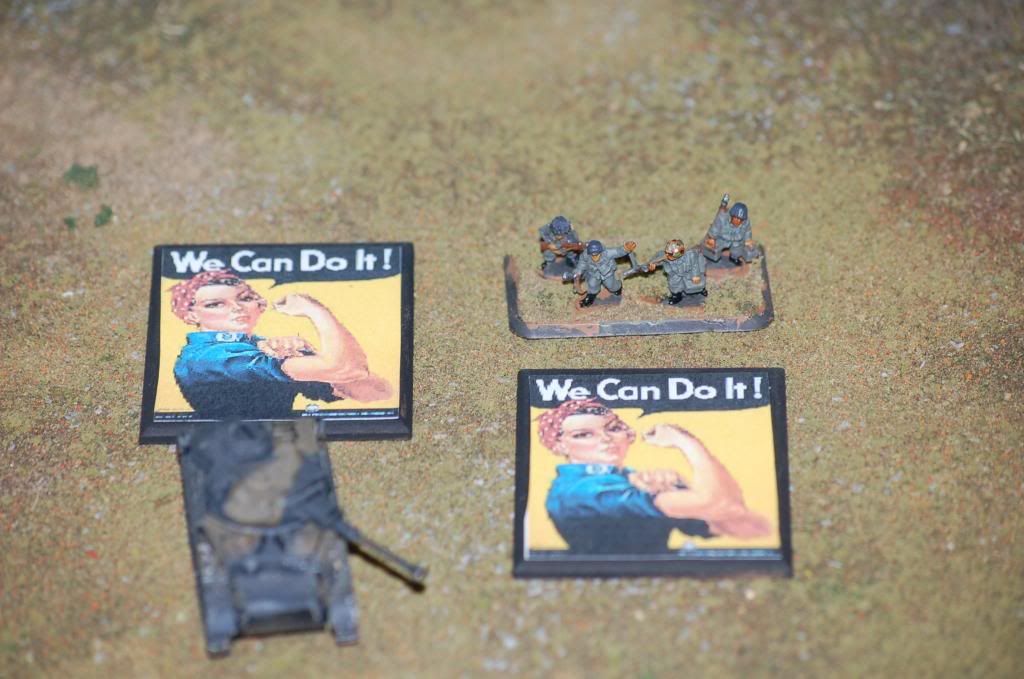 A friend asked me to work up some objective markers for him. He wanted something different from the usual unit or national emblems. So I thought it over and I hit on propaganda posters and pin up/nose art. Here are few samples of the end result. Feed back as always is appreciated.