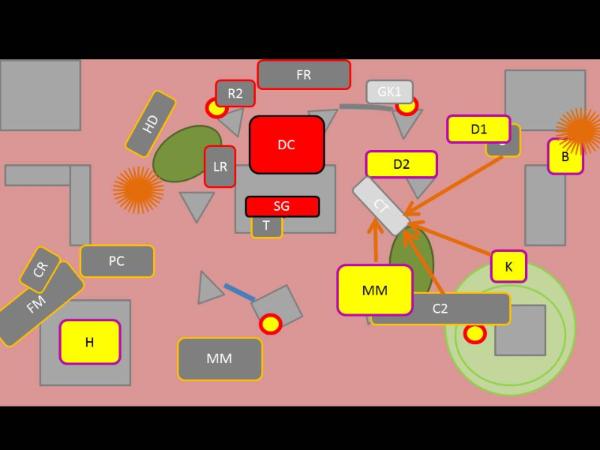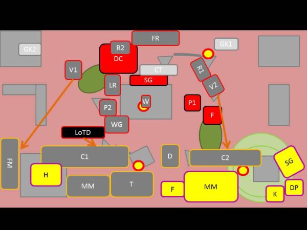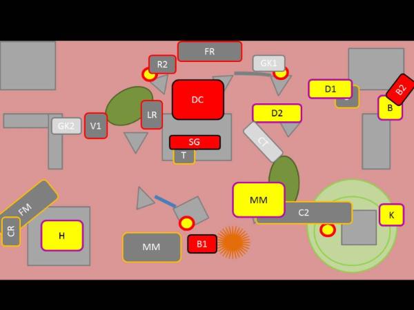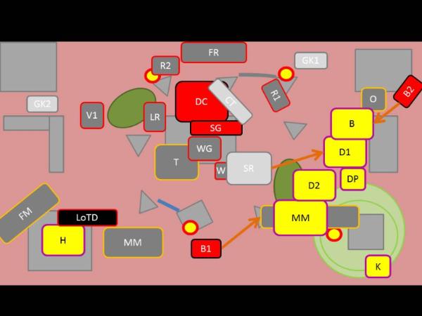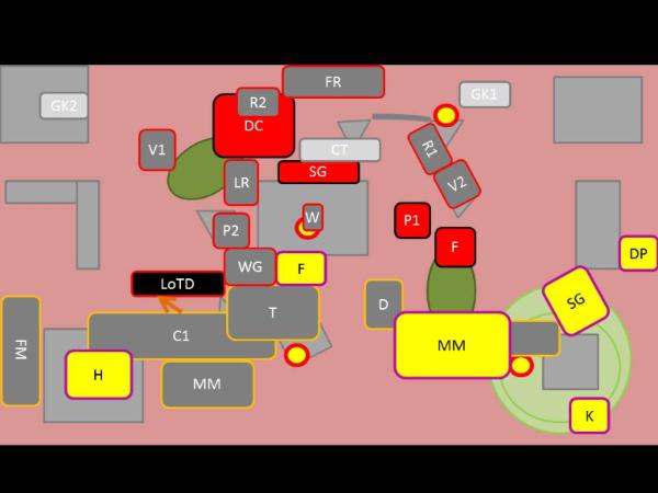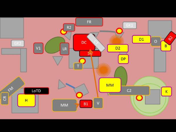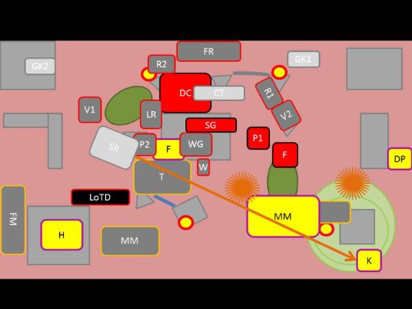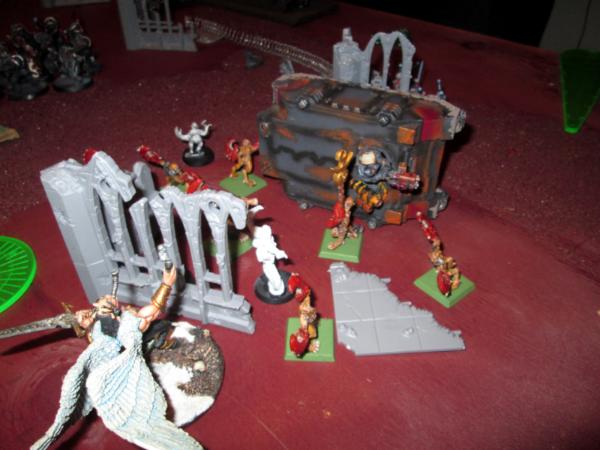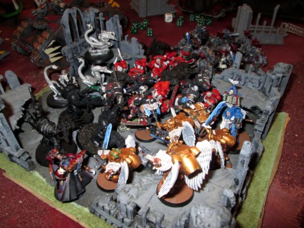 Chaos - Finally, the Heldrake arrives. It Vector Strikes the Grey Hunters Rhino, spilling them out, but fires through the Redoubts access port, killing a Long Fang with random allocation. The Redoubt does manage to knock off a Hull Point with Interceptor, but It Will Not Die brings that point back at the end of the turn. The Daemons moved forward, looking at the 5 man Grey Knight squad with glee. The Havocs in the tower manage to blow up the Vindicator on their flank, leaving the Chosen free to rapidfire plasma through the small Grey Knight squad in support. Coteaz and his Terminators weather a shocking amount of fire from the few nearby squads, and find themselves left with only a few models remaining. Thrawn goes down and never stands up again this battle. My Chaos Lord finished ripping open the Baal and turned to see what the Daemons were up to. Abaddon slaughters the Sanguinary Priest in a challenge.