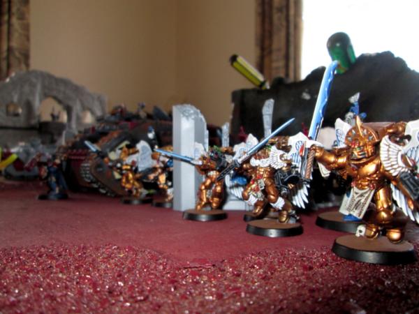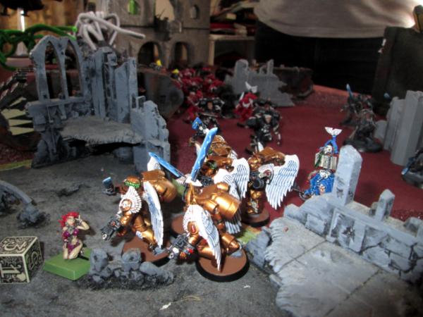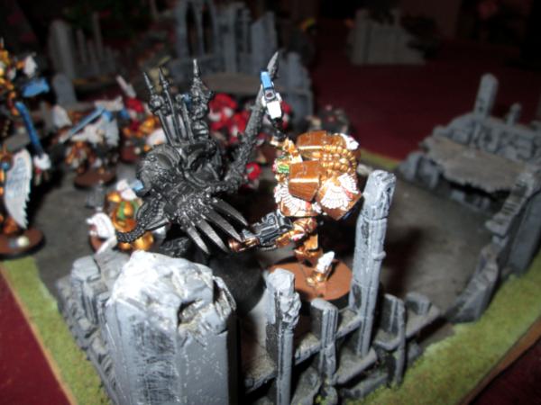 Daemons raced across the ground towsards them, unnaturally fast. A unit of Grey Hunters fought bravely, but fell beneath the long thin claws of the monsters. The Knights moved slowly back, lowering their Storm Bolters in a scything rain of fire.