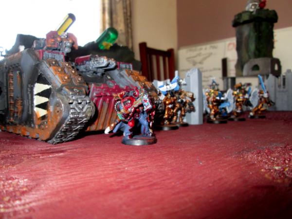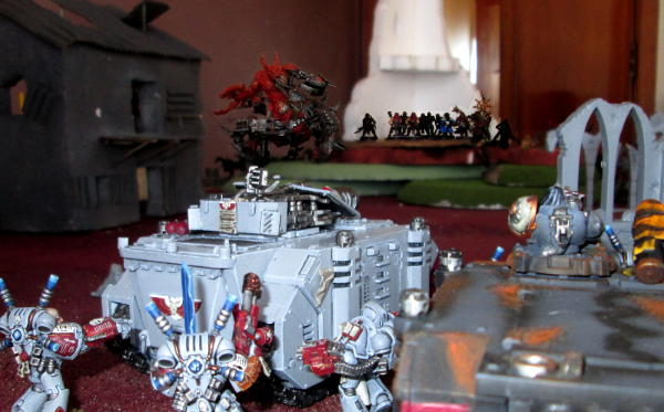 Imperium - The battle began strong with the Furioso Dread, Wolf Guard and Legion of the Damned all dropping right in the face of the Chaos Horde. The Landraider shot forward and the bulk of their ground troops moved up to the objective in the ruins in the middle of the table. Unfortunately, all their big guns managed to perform poorly due to the bonus cover saves provided by Night Fight. One squad went to ground versus a Demolisher round. Chaos lost a few cultists at this stage!