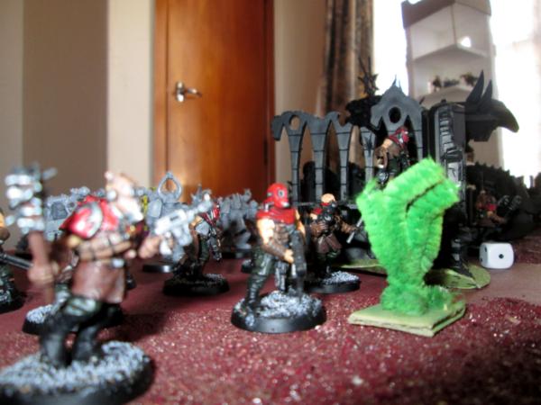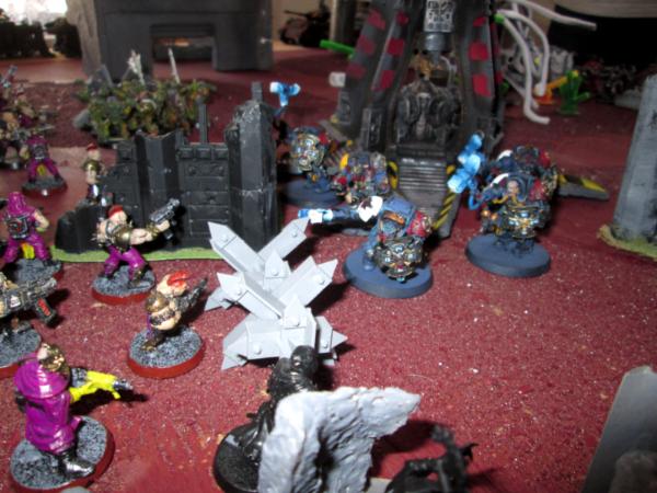 We rolled five objectives, and placed two on either battleline with one central. The Imperium set up first, creating a solid mass in the centre of their side of the field, and reserving a few units in droppods etc. Then Chaos formed up, completely filling our Deployment zone with cultists and a few heavier units, reserving some of the heavy hitters until later, and our deepstriking / outflanking units. My Havocs were in a ruined skyscraper. The Apostle was with the second unit of Cultists, on our right. The Long Fangs and the Warlord Rune Priest were deployed in the Redoubt.