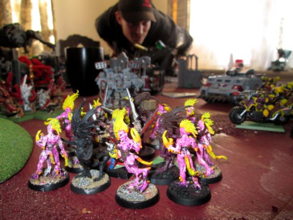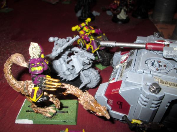 Brother Phetrion could not finish his sentence before a swarm of bike mounted warriors burst from the smoke that coiled across the field. Though the Knights switched their fire, it was too late, in seconds the beasts were among them. In their midst rode an ornately armoured warrior, mounted on a daemonic steed. The red shine from his visor caught their eye, before he brought energy wrapped claws up in a whirlwind of death.
