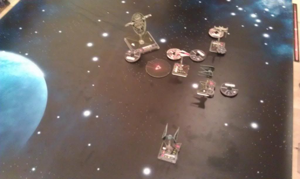 In case the picture is hard to see, yes, that is three critical results and four blanks on the agility dice. Tycho's critical cards made sense: damaged cockpit, injured pilot, and weapons malfunction. But he never had to worry about that considering the apparent shot to the cockpit blew him up. Once again, the Rebel player lost most of his points early on. Even worse, in a bizarre demonstration of shell shock, the Rebel player immediately turned his X-Wing into my proximity mine. Fortunately for us both -- given only one of the Interceptors had lost its Stealth Device thus far -- it was not enough to do him in.