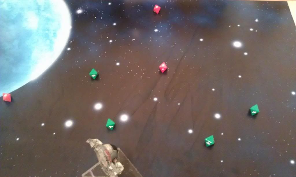 I later found the mine had the desired effect, making the Interceptors waste a turn of movement to avoid it. But in the meantime, they turned their considerable firepower onto Tycho. The farther away Interceptor in the picture above opened up first: