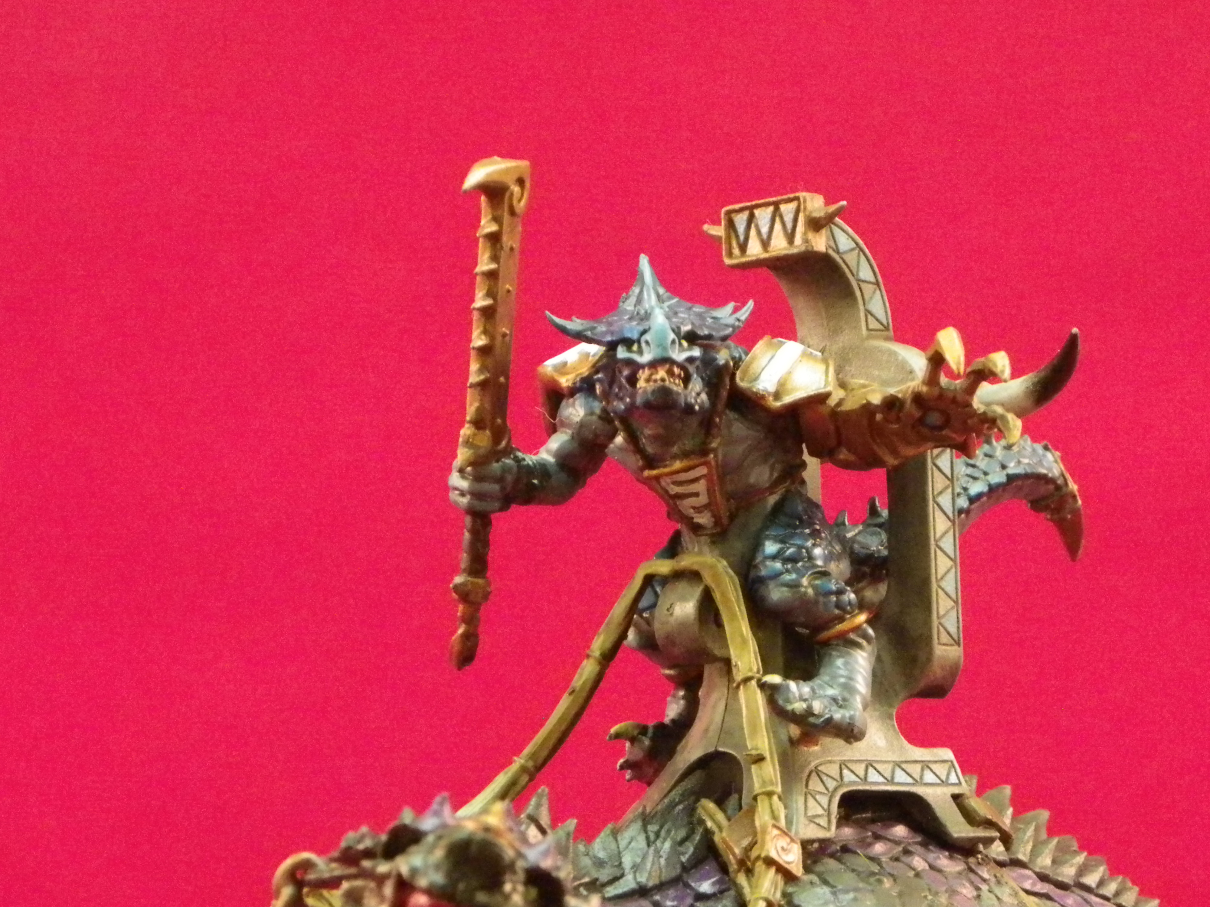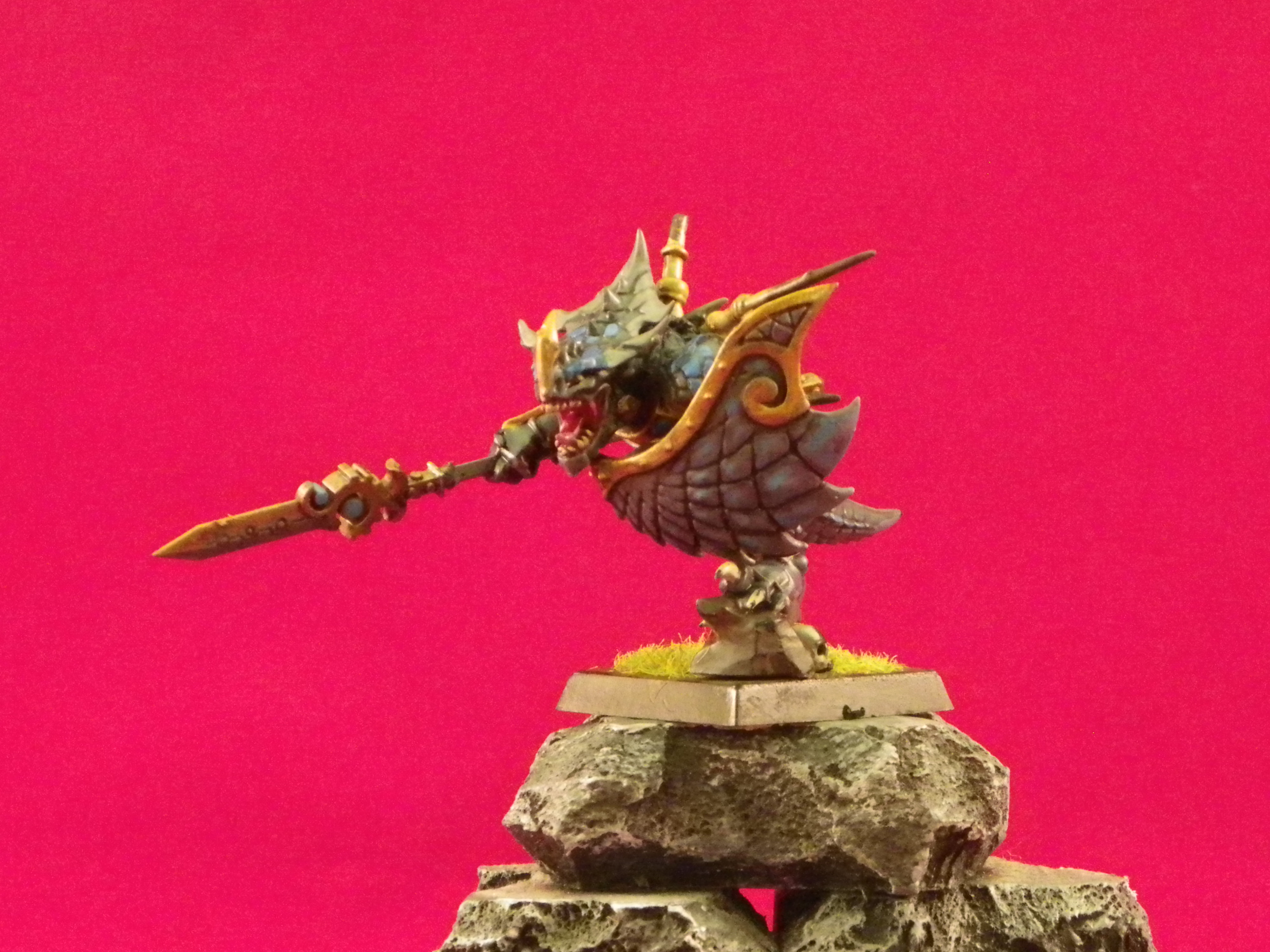 Awesome looking lizardmen, TERRIBLE background. You should pick something other than bright Danger Red as your backdrop. It makes it hard to distinguish the details of the models.