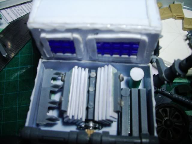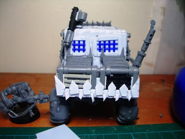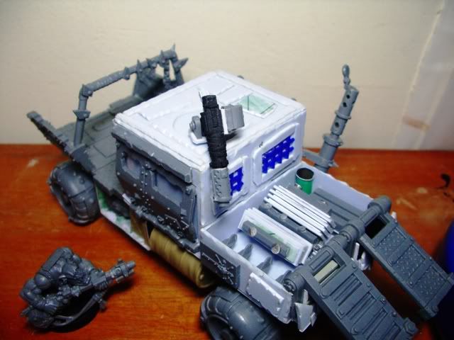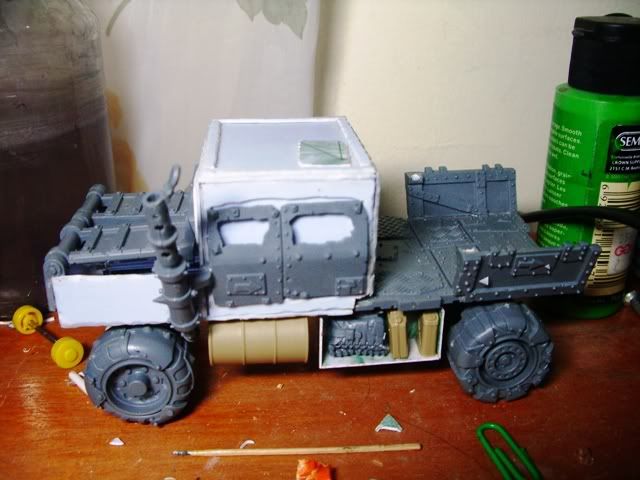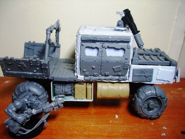 I like the use of sprue in the engine, have you thought about putting a big shoota on the roof of the cab, then cutting a hole in the roof and having a boy sticking out.