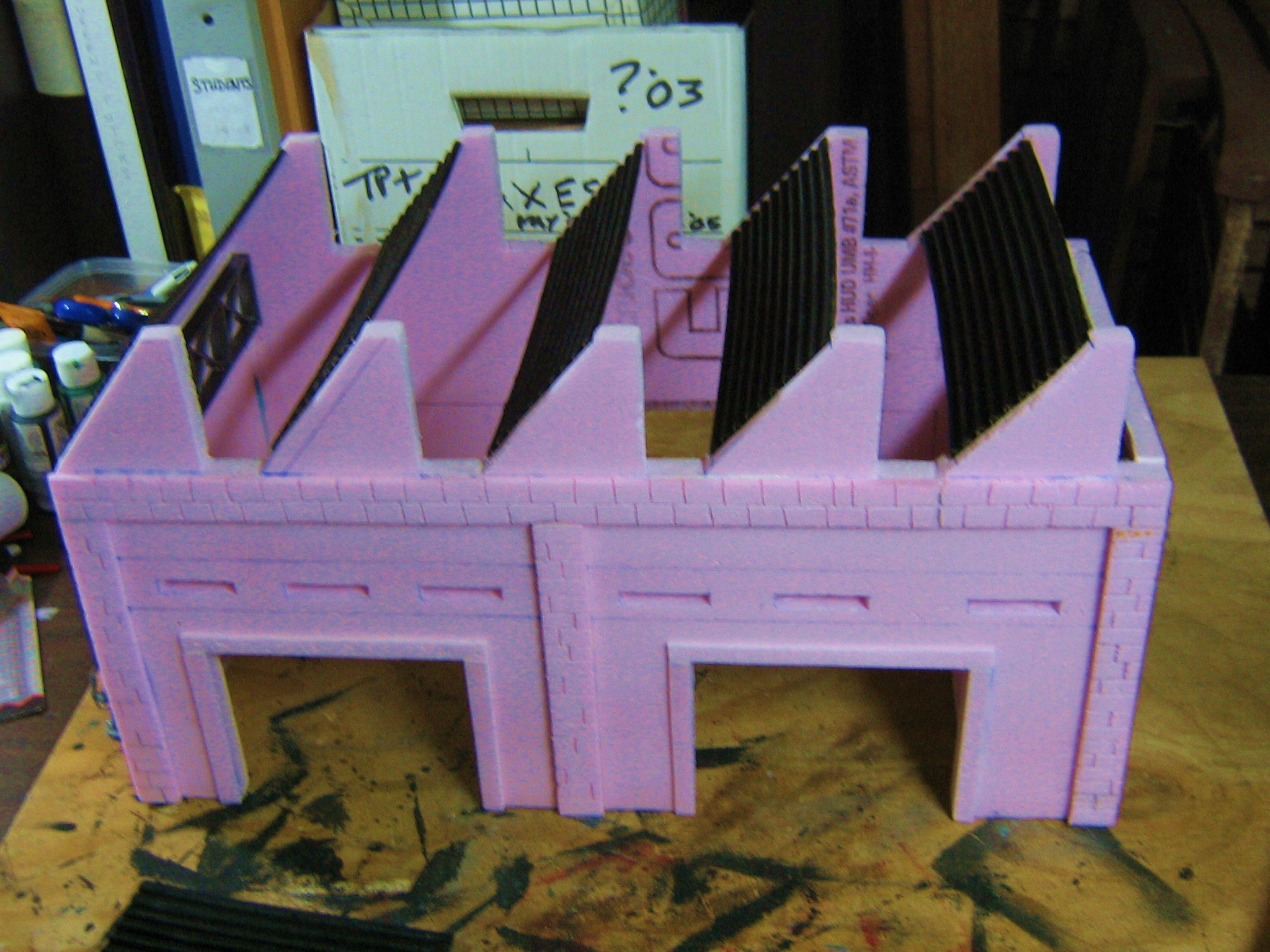 Ok so by now I'm probably killing it with the micro updates but hey... I'm a glutton for any kind of exposure and all your imput and suggestions have really helped me get beyond my second guessing -so thanks. Here is the nearly almost finished factory... the only issue I have is what to do about the roof. I put the panels on and there just seems to be something missing? maybe some cros beams? I'm not sure... but whatever it is I don't want it to block or prevent players from sticking their hands in -all roof panels are detachable. I'm thinking of just putting a block of pinkstuff at one end and maybe making some sort of ventilation or fan system... of just sticking up some faux-grating/venting and just leaving the rest (I guess this would be the lazy approach. I am also not sure exactly about the colours yet (guess that's my problem) for I really don't want every single building I make to be a depressing grey  . after painting it the long term goal will be to base it and add something like a large boiler, and two areas in just after the main door that have platforms for tanks to be raised up fr undercarriage inspection (one of which will be perminantly raised). the front bay door that is half open will be painted and have some sort of large intustrial numbering (I may even make it 'opperational'). I'm also going to add hand rails to the little raised area and thow some of my homemdae barrels in there. guess that's about all -thanks for the imput, patience etc...