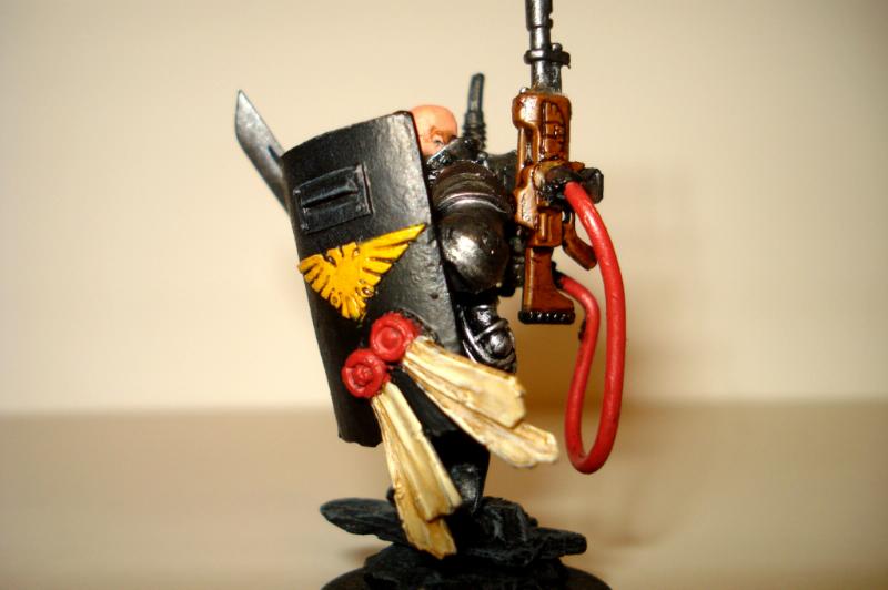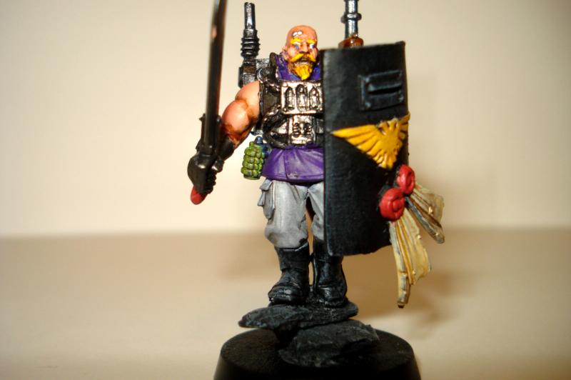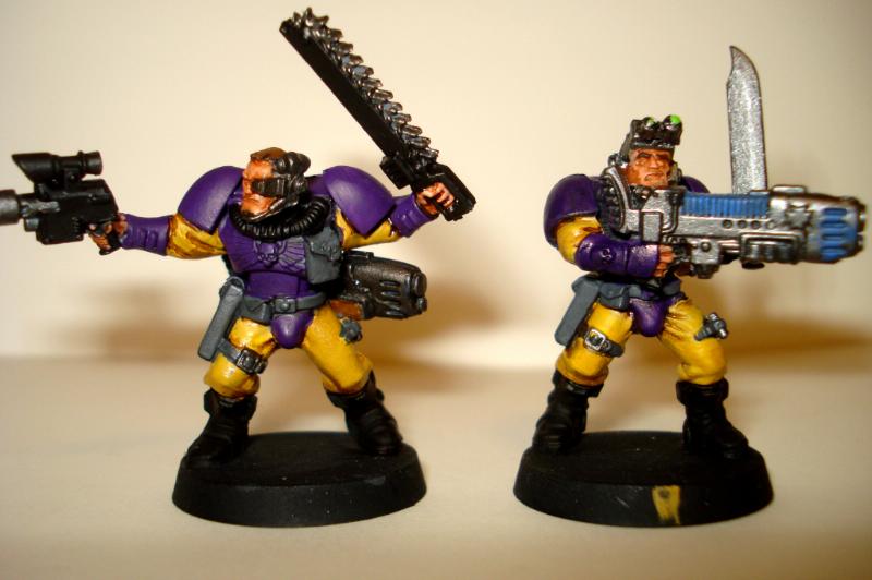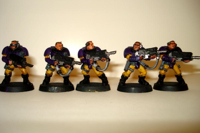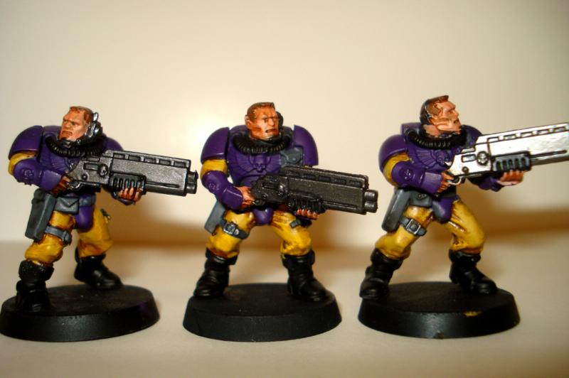 You should put helmets with face guards on the storm troopers and they would make a good bloodbowl team, the vikings. (purple and gold are the Vikings NFL team colors). Joking aside, they look good too. I just think the barrels are dwarfed a little by the bolter. i have seen lasgun barrels on shotguns (for hellguns) and that looked a little more "to scale" but that is just personal preference. Besides it is getting a little down to the wire as far as the TOMG goes. 2 weeks until deadline....