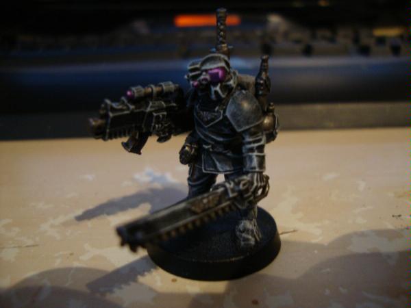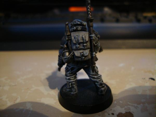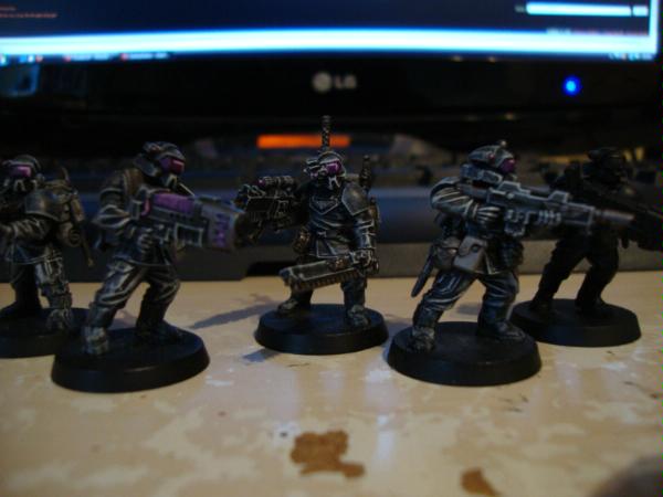 The Imperial guard are in some desperate need of colours to break up the black, the eye lenses are on the right track but you need more colour on the rest of the model.