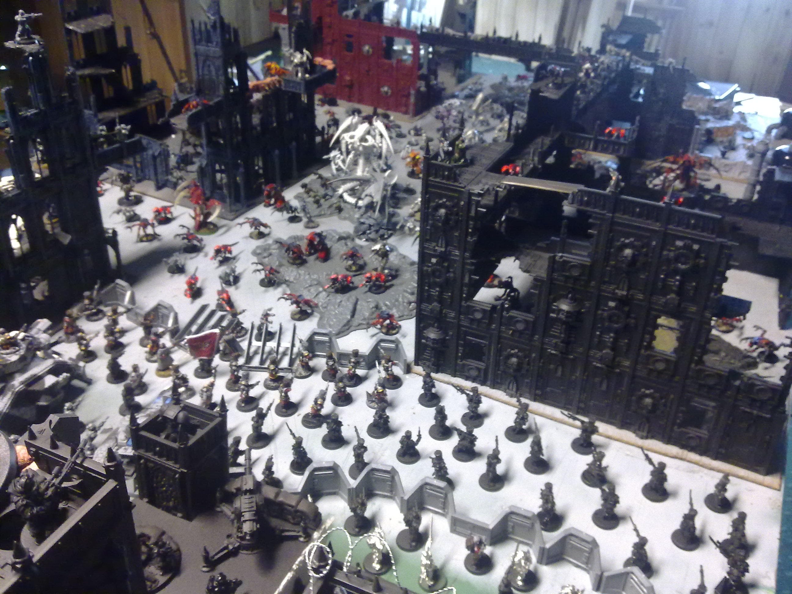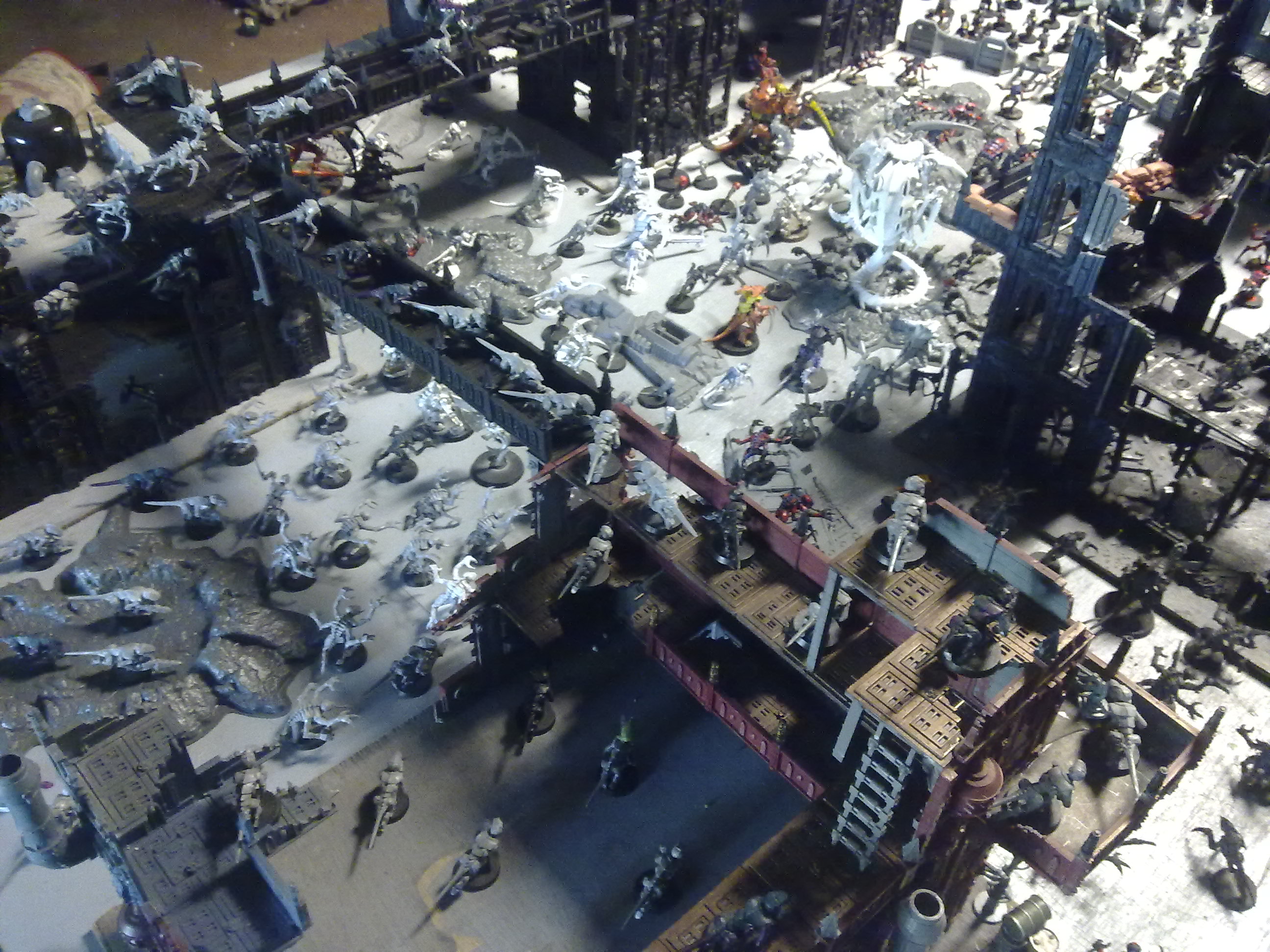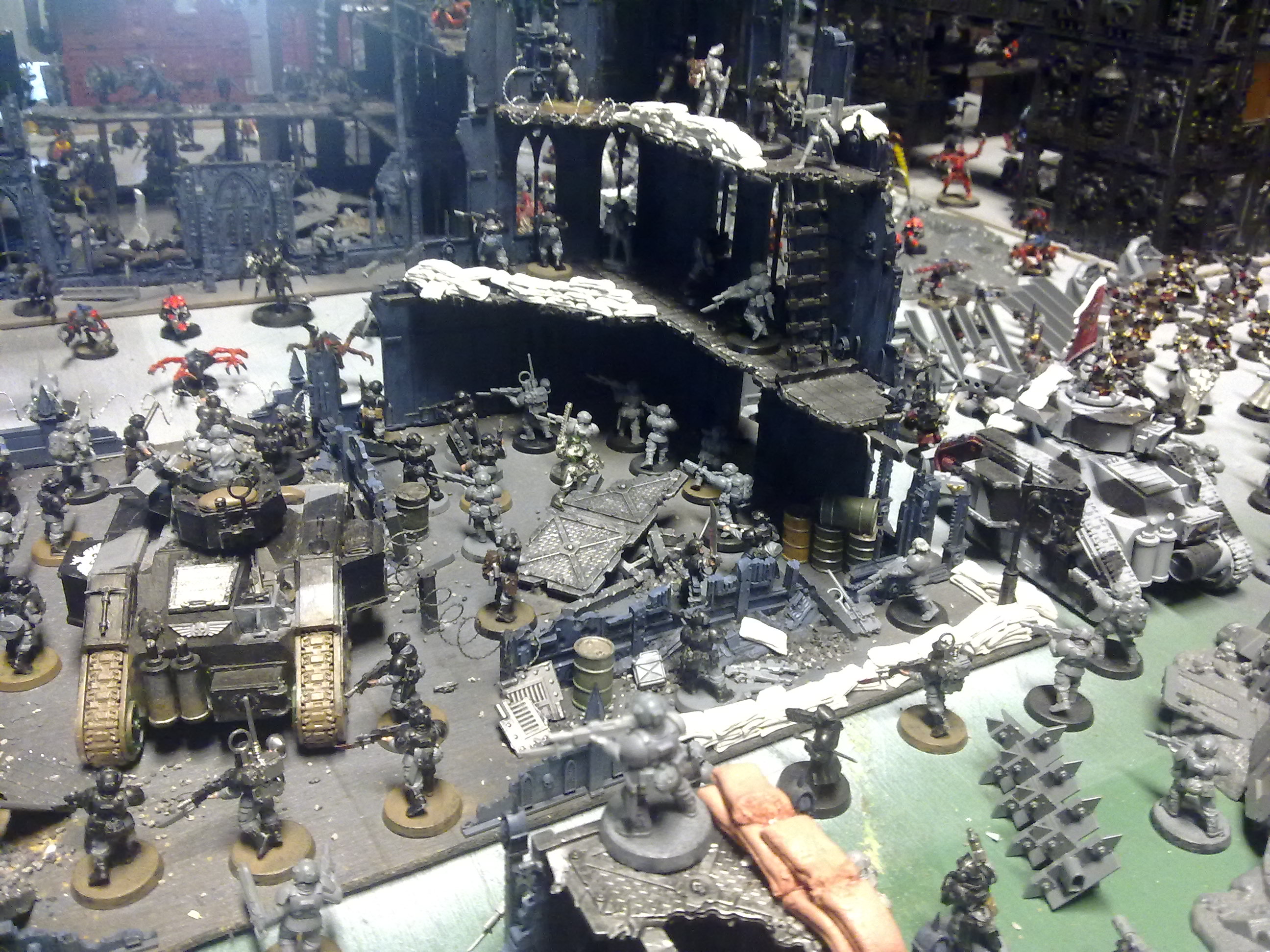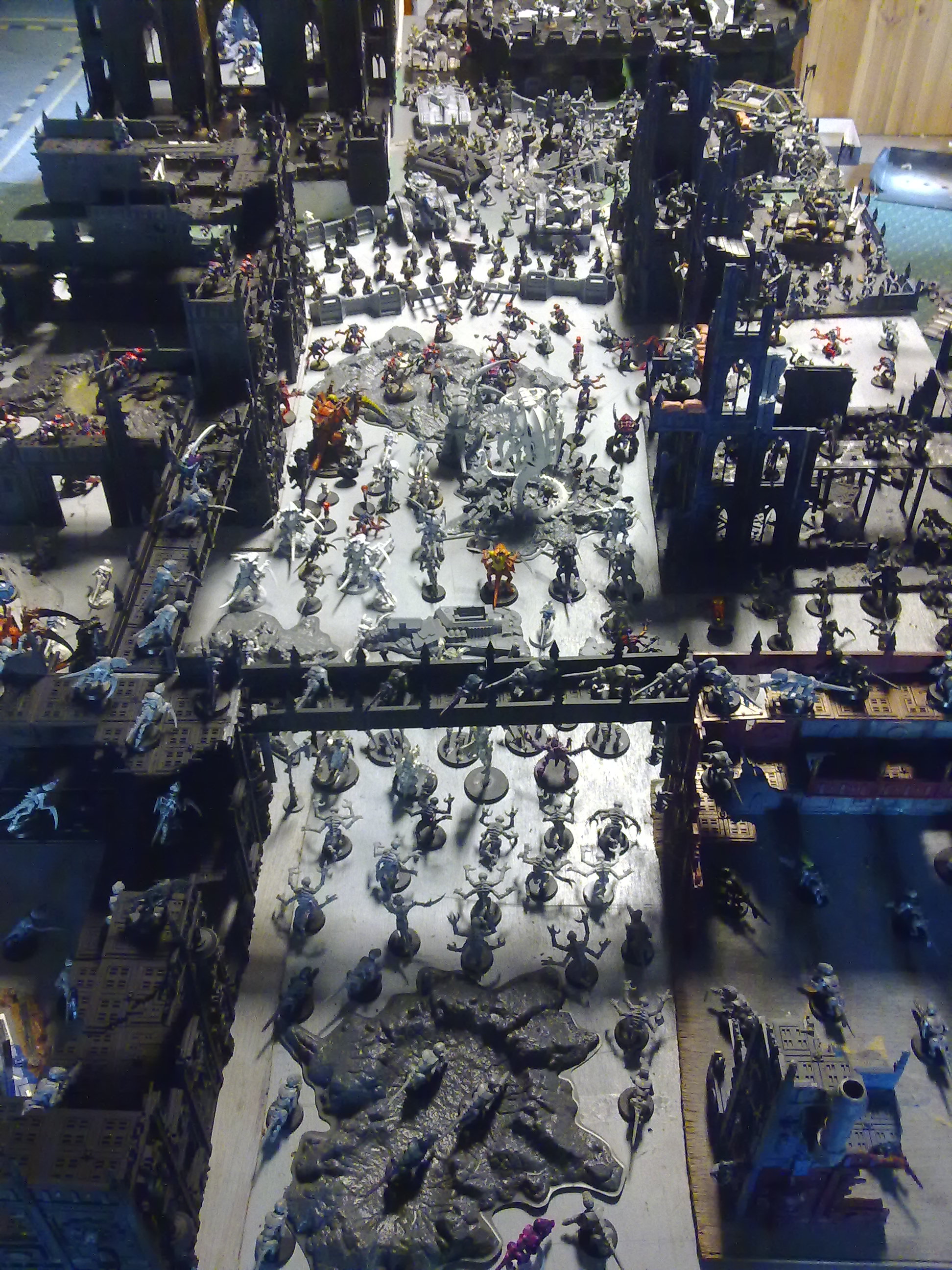 So i randomly decided to see wat my 'Cities of Death' table looks like covered in models! I used my entire tyranid army and a fraction of my Imperial guard army i decided not to put super heavys on the table as they take up to much room theres also only a few of my tanks present much for the same reason theres just not enough room, hope you like it. PS: Sorry most of my models arent painted i have few hundred to do and not nerely enough time to do them so the best i can do for now is leave them grey or undercoat a few sorry if you hate grey or undercoated armys im getting there slowly just finished painting 25 Vostroyan models only 60 more to go then on to the Tyranids.