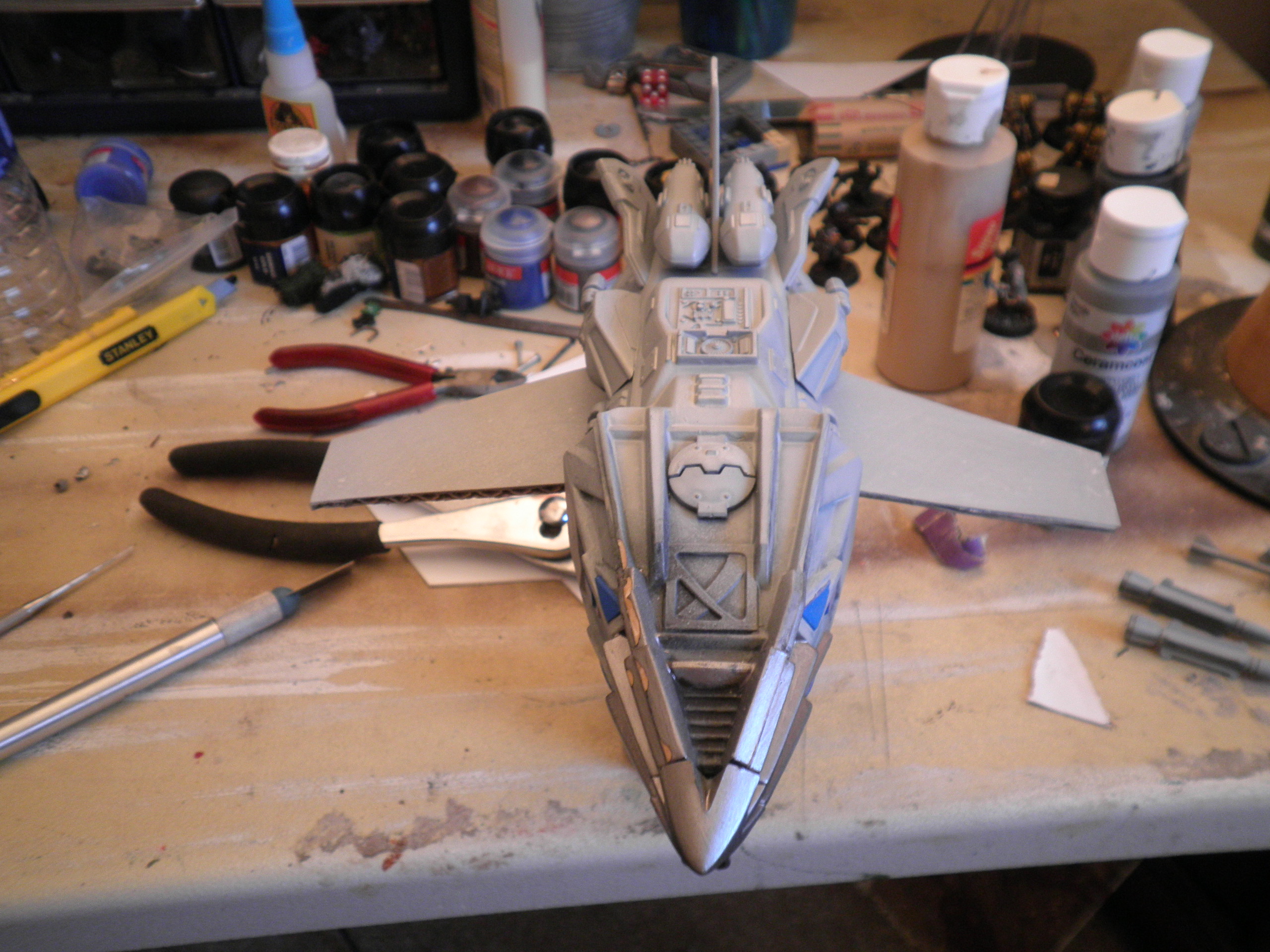Ok, so I got this Star Trek model in a trade about 6 years ago. I was just going to use it as a crashed Xeno ship terrain piece but why not make it more useful. Squat Valkyrie maybe? It is kind of short and fat! So far, I changed out the short stubby side wings and with longer cardboard/plastic card ones and added a center wing between the jets on top. I've added heavy bolters to the front, a turret mounted lascannon on top and hunter-killer missiles on the wing tips.