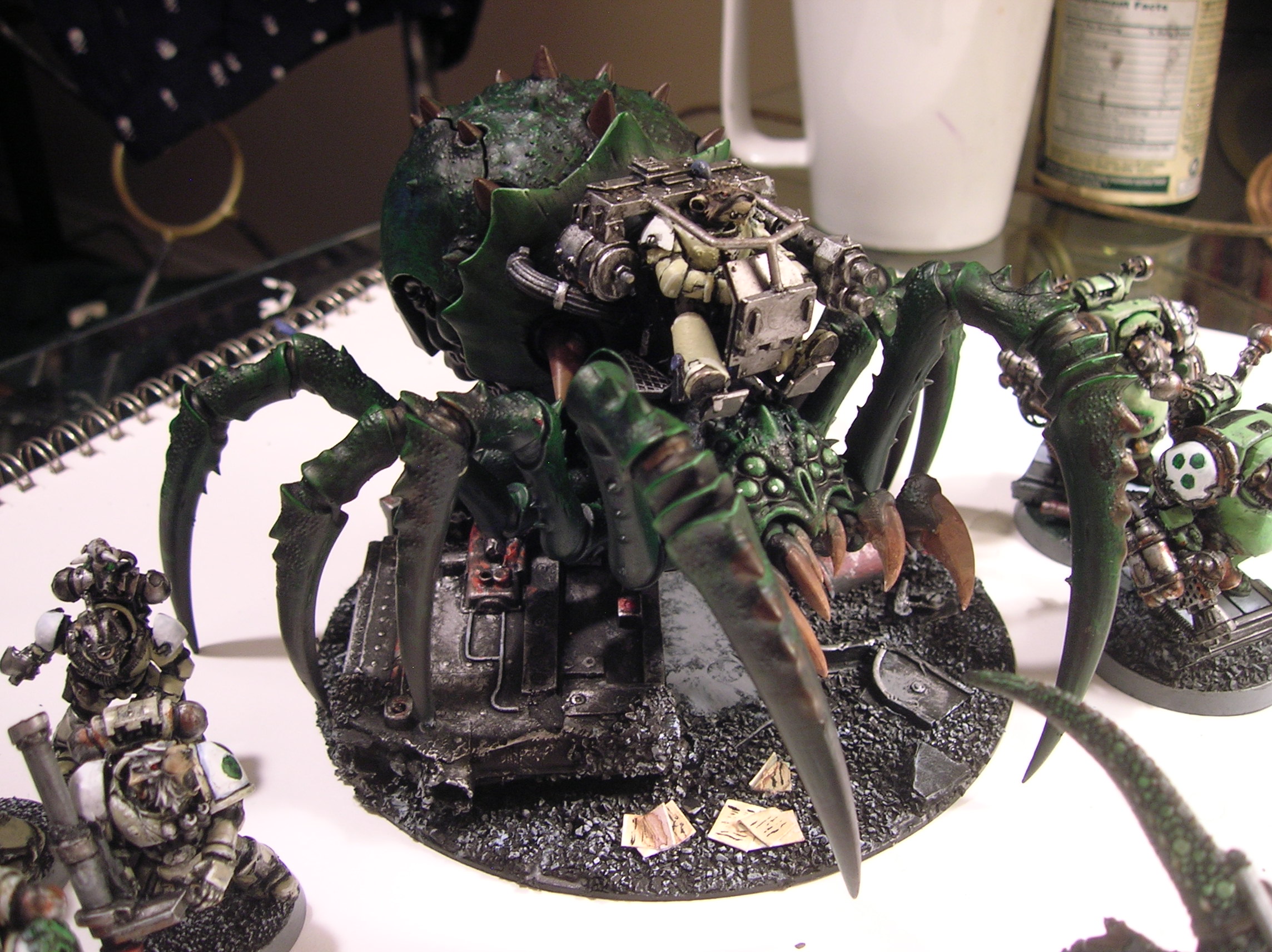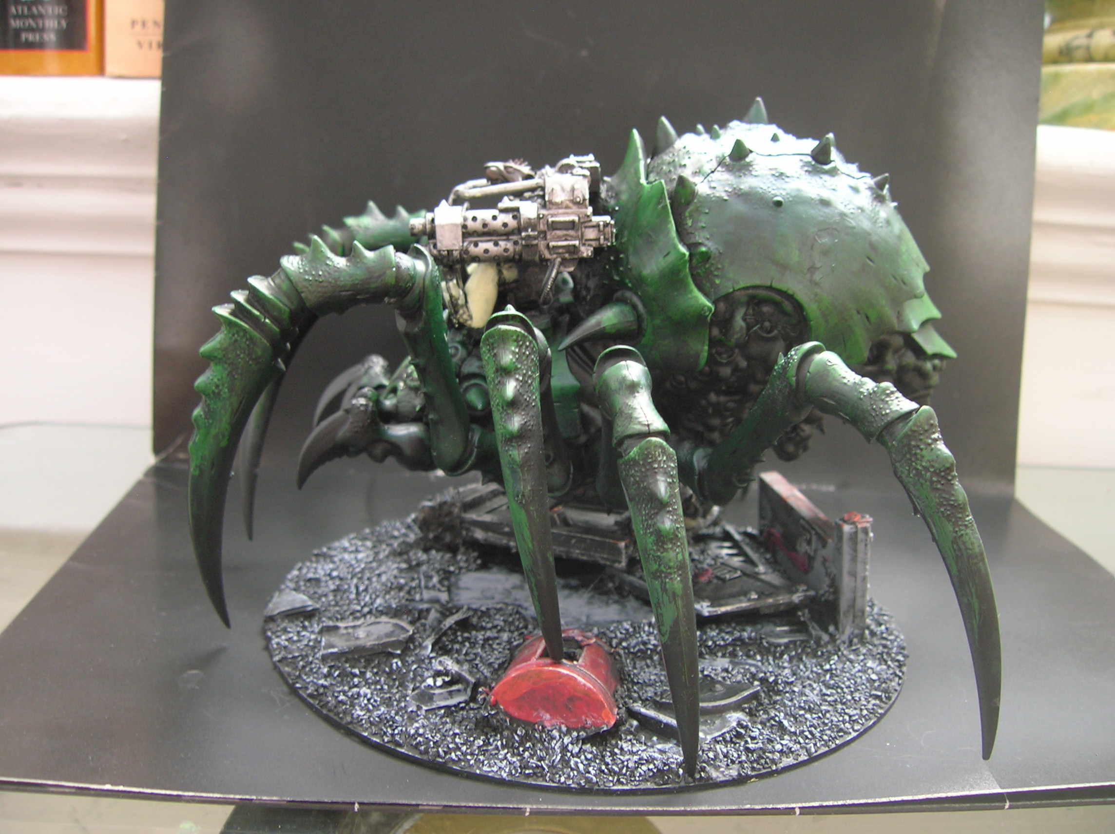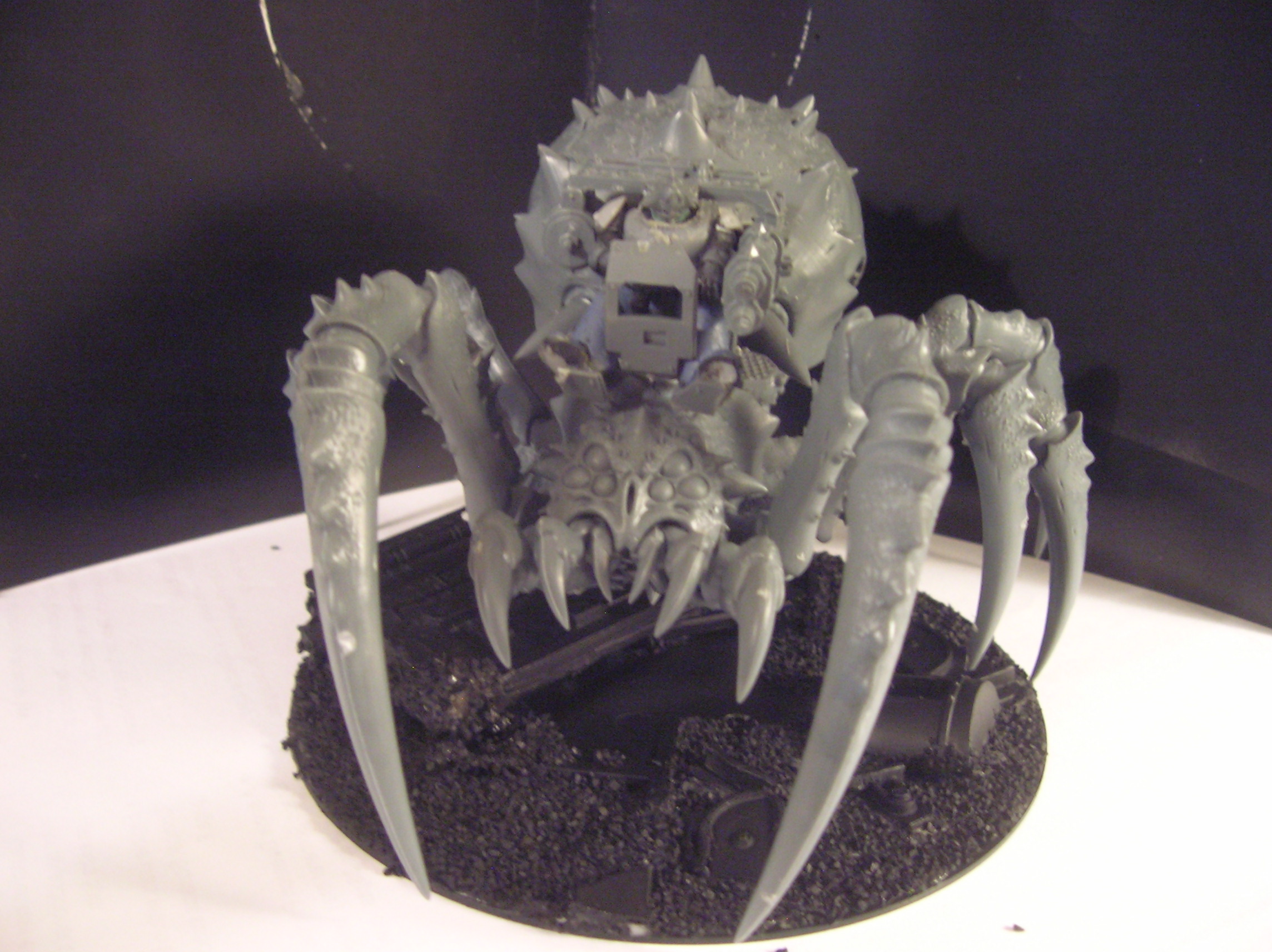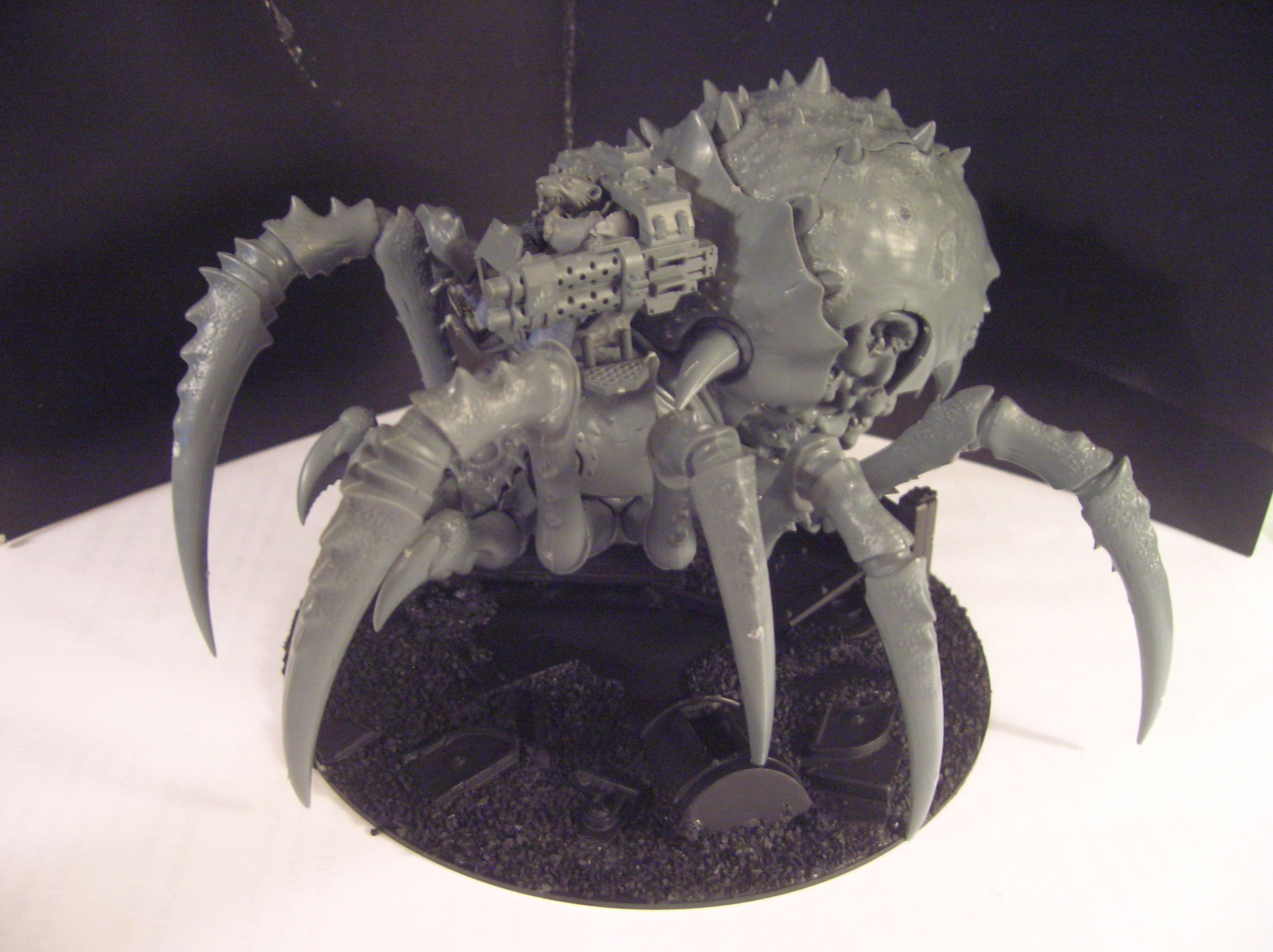 @yggs. Yeah I've been struggling with how to make the spider a little more "tech/futuristic" to fit into 40k. I think im going to put some guitar wire from the saddle to behind the spiders head to look like wiring going to its brain. Its going to have a mark of nurgle so I think the vomit cannon can just be assumed to come from its mouth. The ork big shoota (or what ever the hell that bit is ) will make a good "scavenged" autocannon, and Im going to trade a flamer for another dccw. I figure since this thing has fleet and Front AV 13 using it primarily for close combat makes the most sense. Anyway I could use some suggestions if you got any.