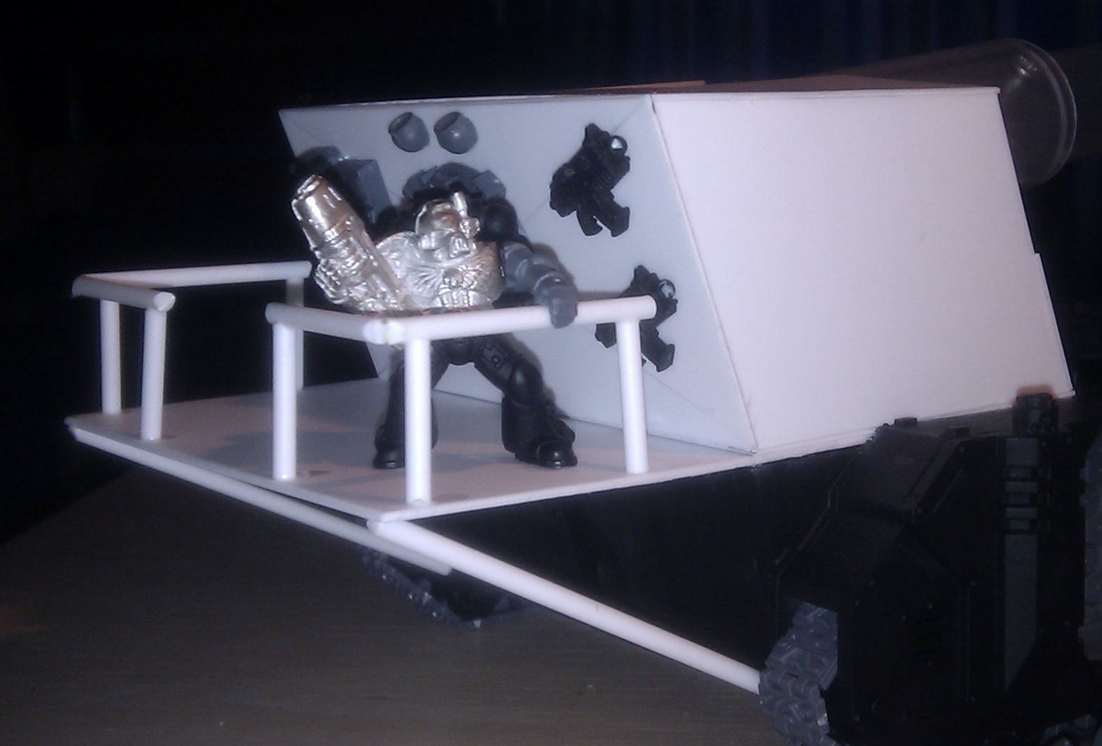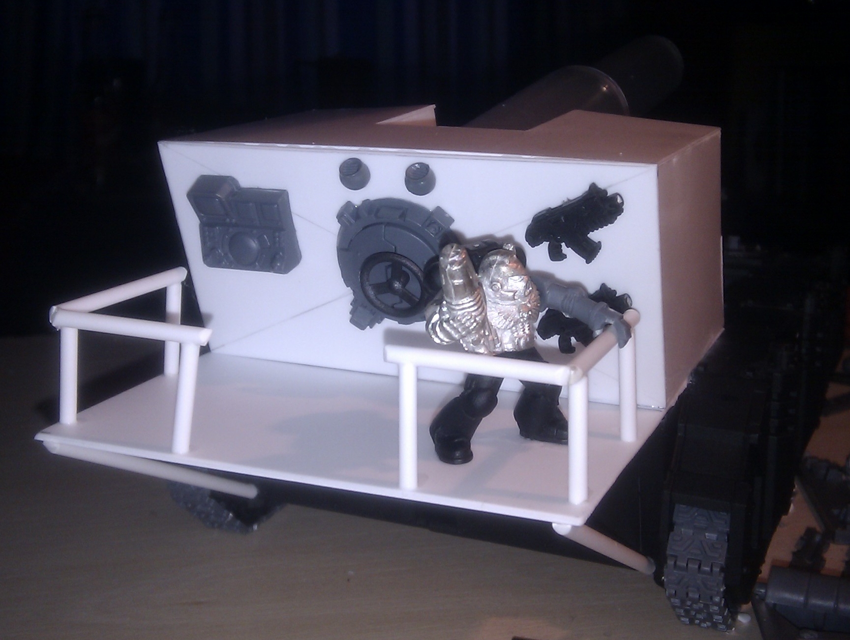 Uncle Tom sounds good! I am trying to build an extra 'pod' on the back with screens around it and a drivers head up through a hatch. The only other weapons I'm considering is a pair or four of the standard tank rocket launchers. I'm going to attempt to build a moving loading ramp (which will probably be no more than a pivoting piece of card shaped to fit the look).