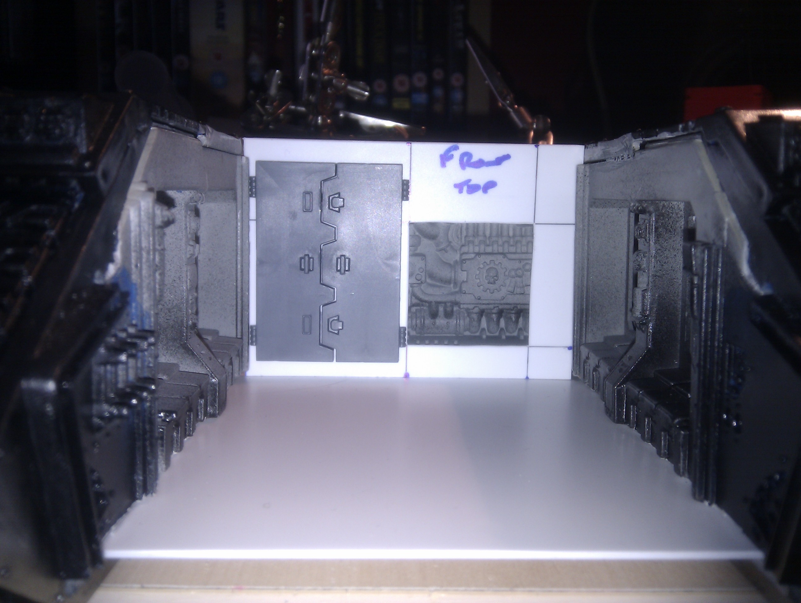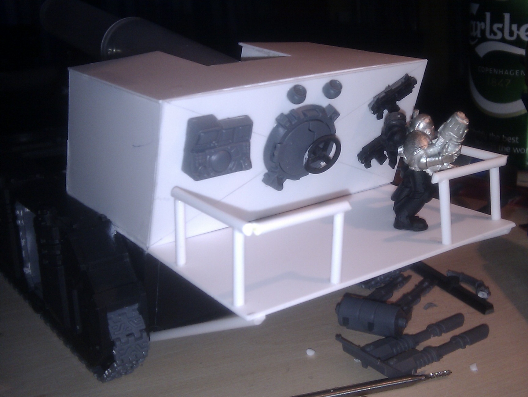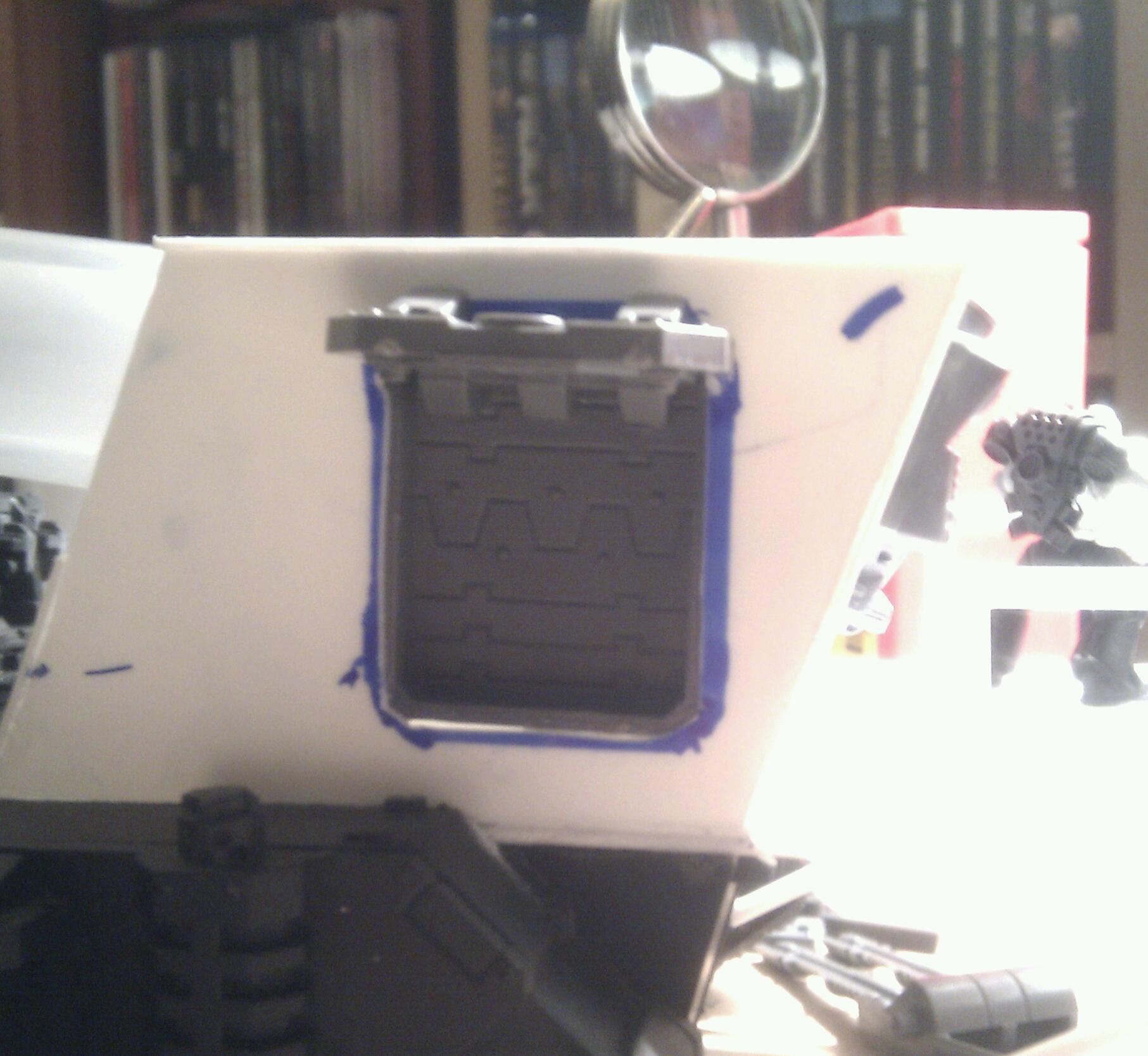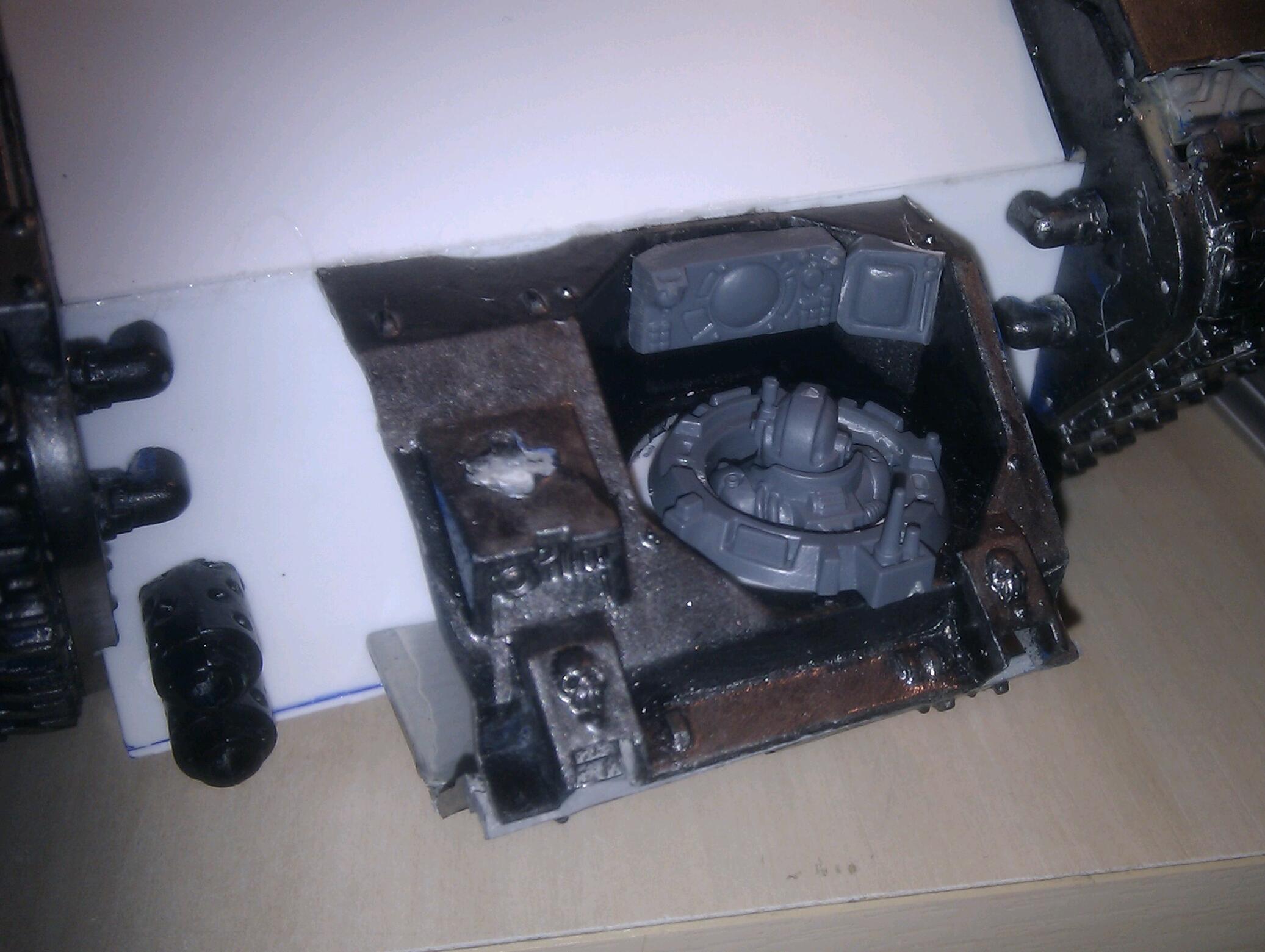 Looking great. Is there room behind the plasticard and 'doors' for a couple servitors and a tech marine? This would add efect and reason for the driving(steering) firing of weapons, and controlling of the crane(should you add it)