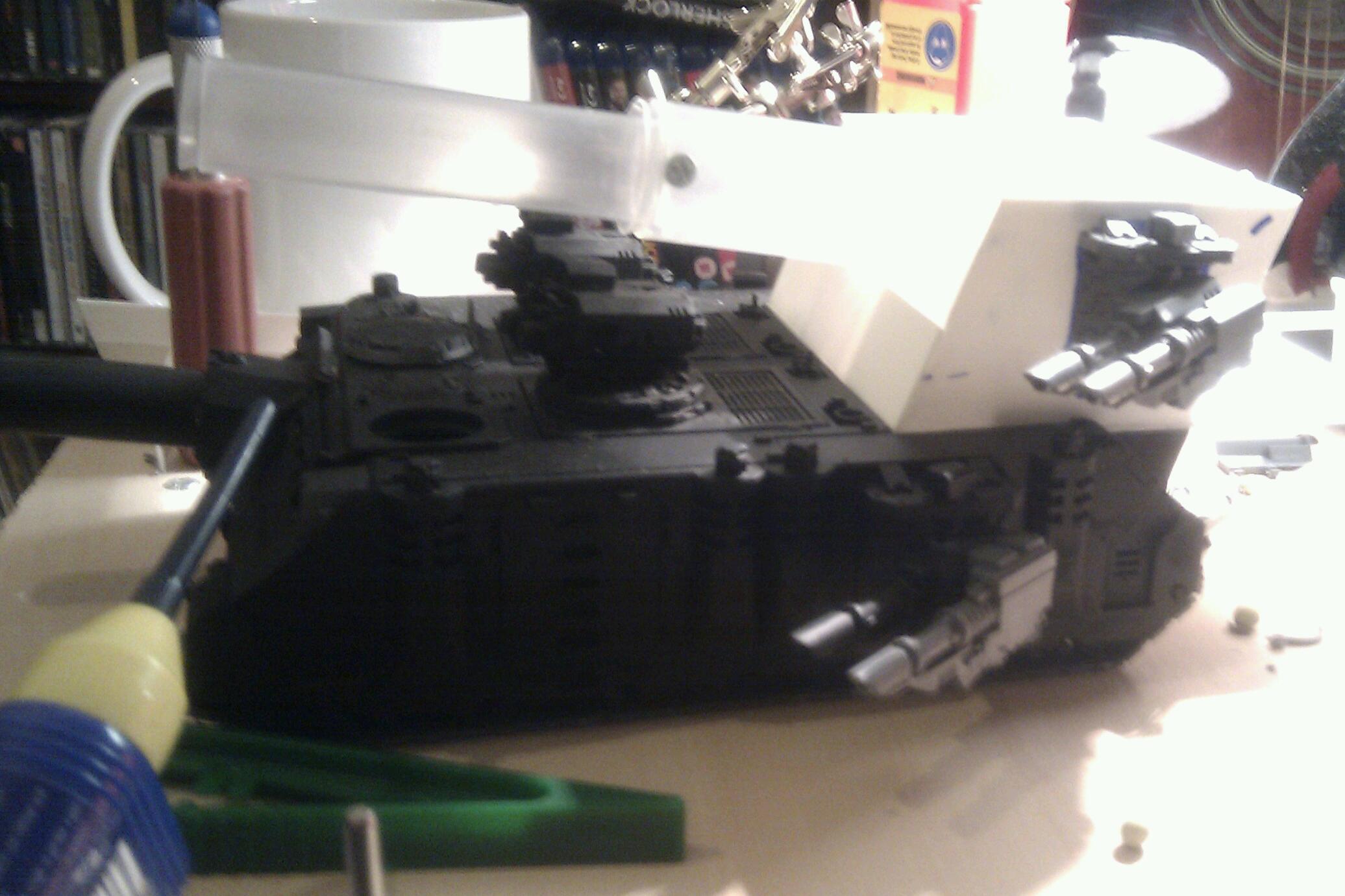 A few picture updates. No massive changes. I've repaired the original twin linked las cannon sponsons and put magnets in them so as to reduce the chance of me breaking them both again. Started building the platform on the back, complete with hand rails and two marines (one is in situ to see how I like it). I will need to do some work on the handrail as my slicing and sticking is of rather poor quality. I've added detail to the rear of the cannon housing including loading hatch and target computer. The tracks are now fitted (which was slightly tedious work since I had to trim down the links to make them look a little like they were meant to fit. I've got the other set of twin linked las cannon sponsons built, I'm just working on a way to fit them to the cannon housing. I have an idea on how it could be done, but as always, my big problem is getting my ideas from my head in to reality. The cannon housing has been made magnetic as well. I am considering building interchangeable roof top accessories. With two dreadnoughts on the way, I'm thinking of building a craneand platform so it can be used as a Dreadnought Transport. We will have to see what happens with that though. Once again, ideas to reality. Doesn't always go as planned.
