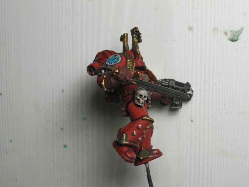 His weapon of choice to make the blood flow is the bolter and has no self preservation whatsoever as long as he gets the shot,hench the bolter holes
