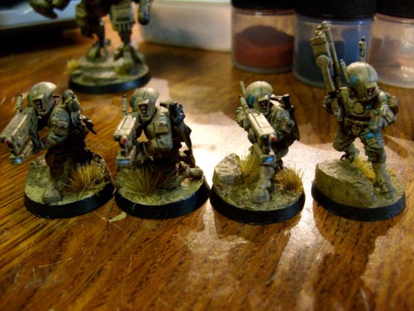 Man, I'm loving this. My first ever army was Tau so I've always had a soft spot for them, but more than that, your paint schele is gorgous! It really fits the Tau well and you've executed it greatly! That suit looks ace, good choice of color placements, and those pathfinders are nice conversions, simple, subtle, and effective! Keep it up! I''ll be watching, and with this amount of quality, I'm sure lots others will too