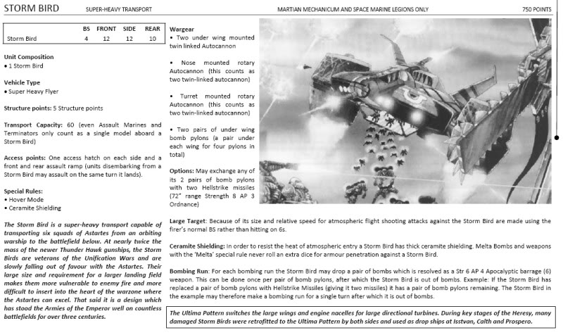 The Storm Bird is an awesome vehicle, but impractical as it is larger than a Thunderhawk even.