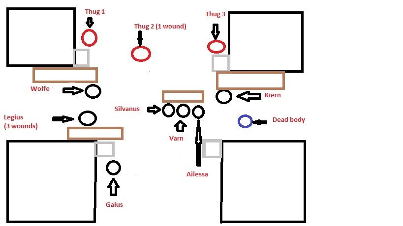 The third Thug, shocked to see his friend bleeding heavily from his arm, runs behind the pillar to his left (the top right one on the image) and snaps off a shot at Kiern who is hiding behind the nearby stall, the bullet flying wide.