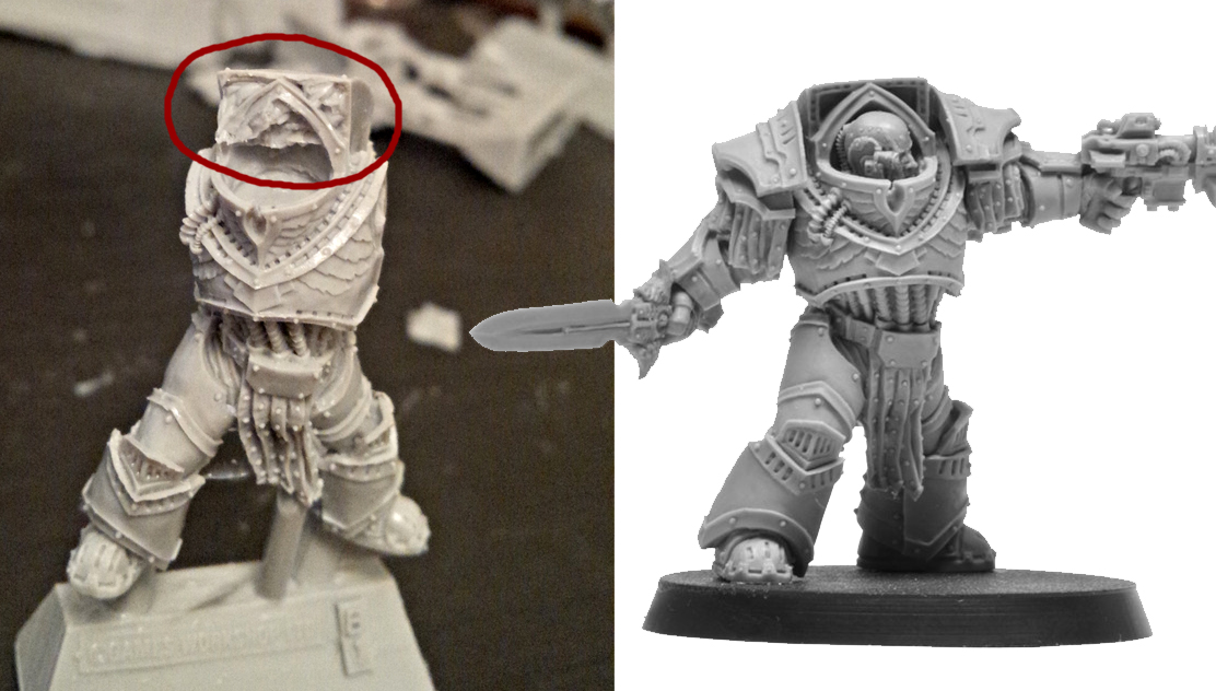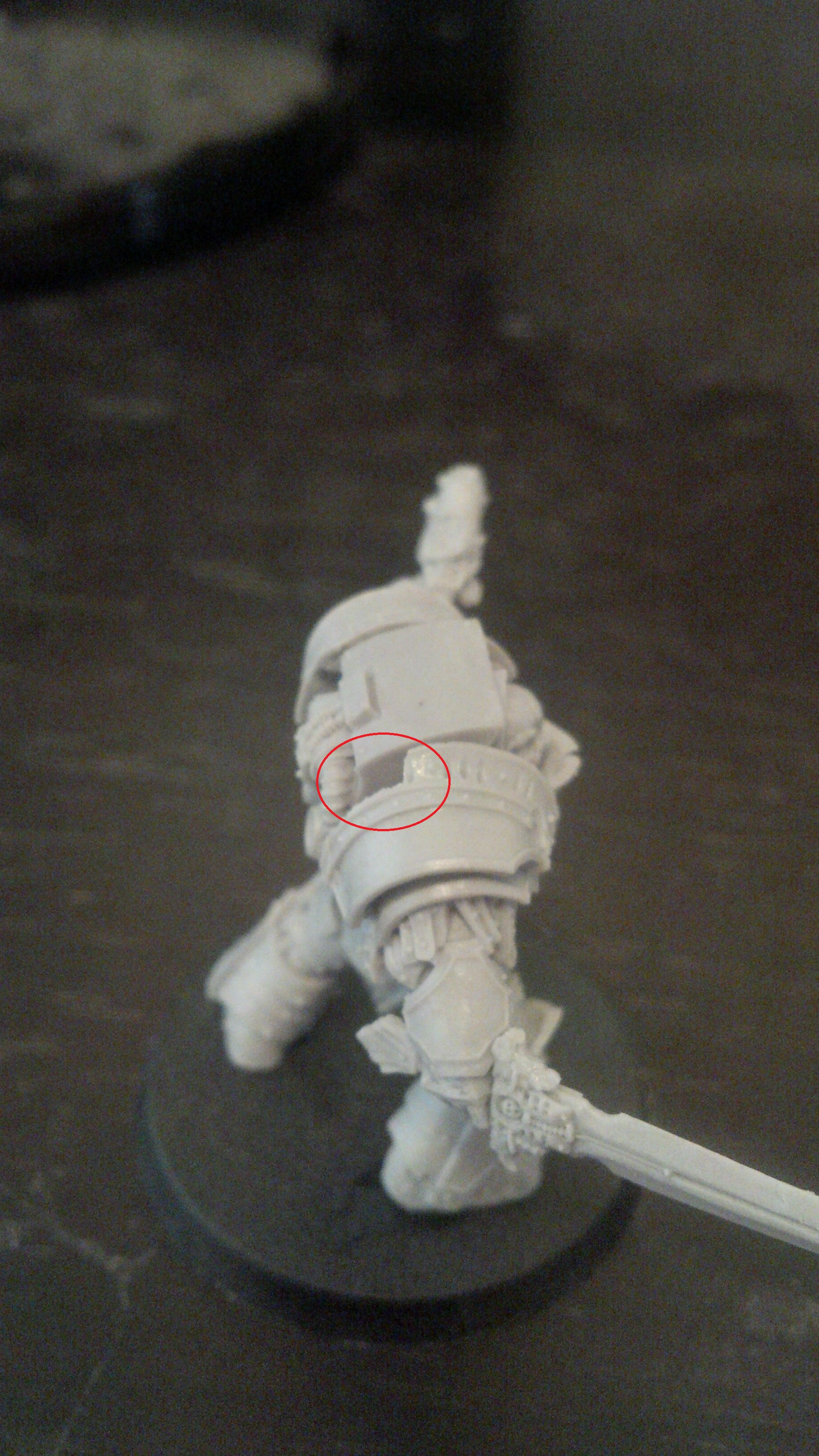 Been busy so I finally just got him assembled, but at least theres some pictures this time. I gotta say this is my favorite terminator model yet; the level of detail is amazing, you can even see the servos powering the armor. However I did manage to feth it up in two places, the first being his shoulder trim and the second being his head. I damaged the trim on his sword arm while clipping it from the sprue and had to cut my losses by getting rid of the trim until it was undamaged (circled the missing bit in red). As for the head, well its just not looking quite where he's firing, but I don't see it as as much of a loss since it would have hid even more detail.