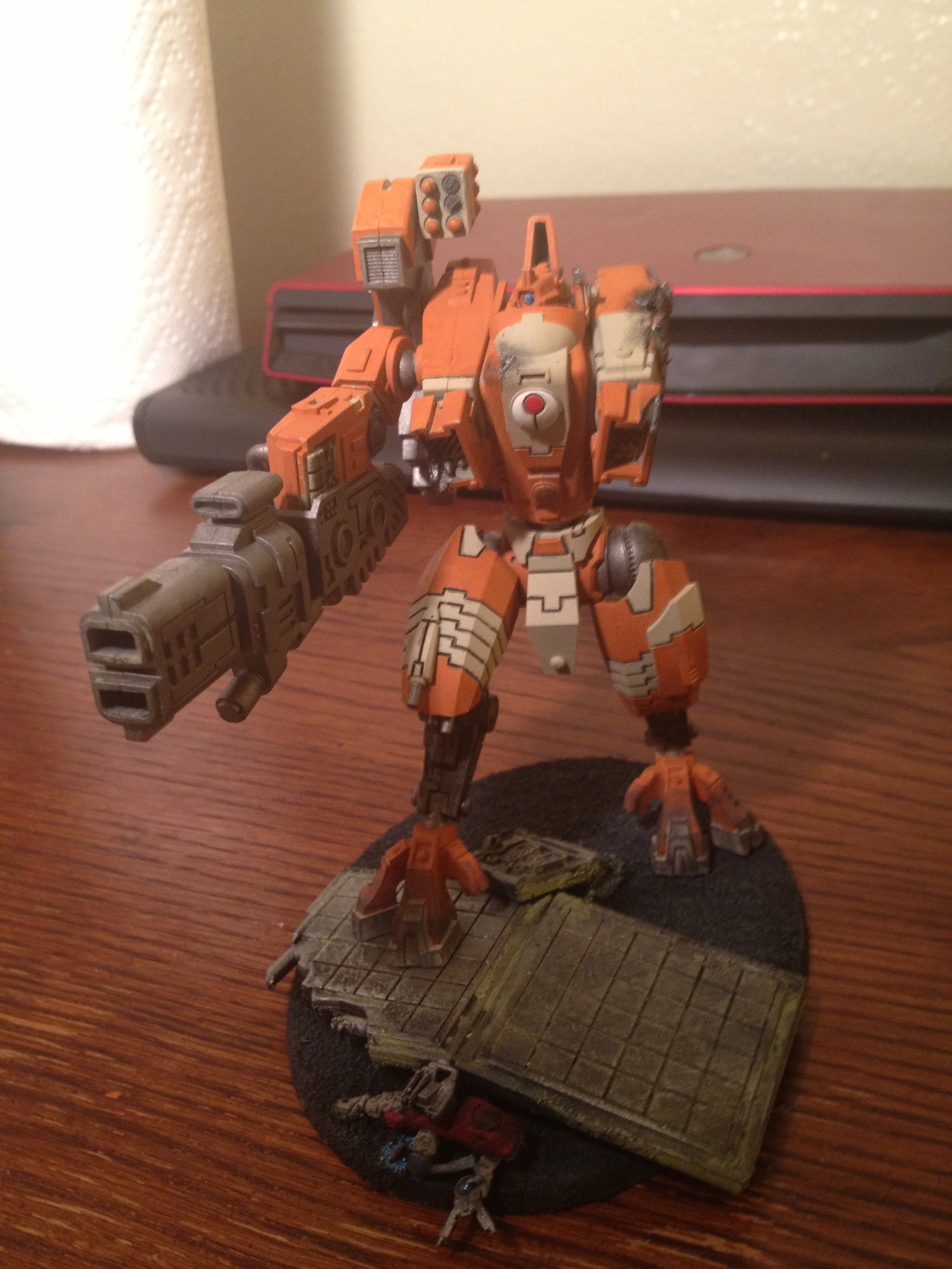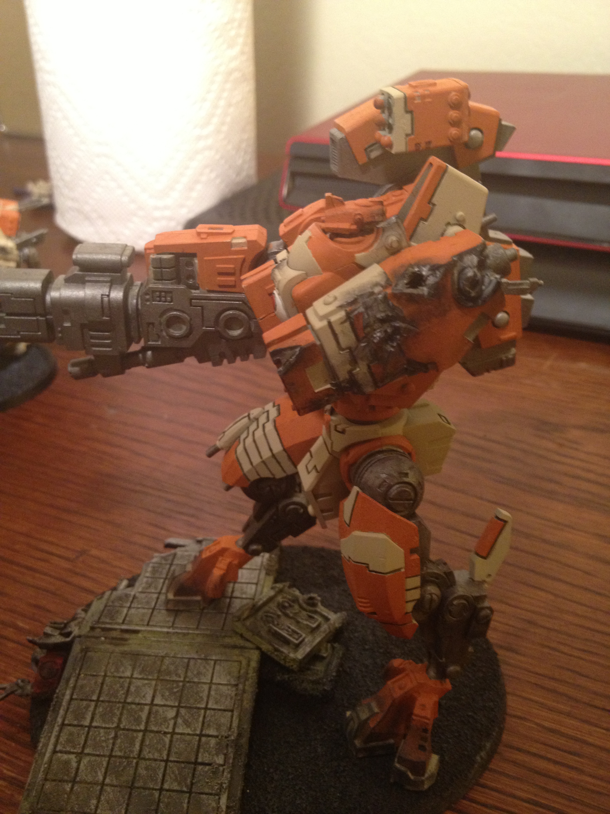 My riptide having one arm wasn't the plan at first but unfortunately part of my desk broke and fell on him breaking booth boosters and both arms. I manged to fix his right side but I was unable to fix the the left side. After that incident I decided to make my whole army look like it was currently in a fight with Farsight loyal tau.