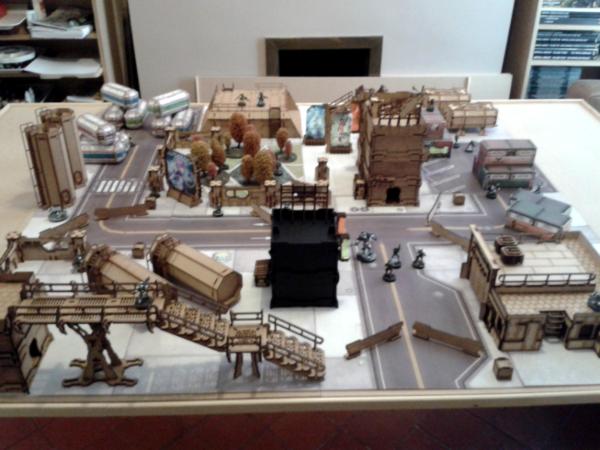 Some shots of my table, mark II - same buildings but condensed to 4x4, and with added crates, trees, barricades and other scatter. I still haven't read any build a good table stuff, so it probably still doesn't play great but looks soooo cool, to me anyway, hopefully will look much better when painted up. I particularly love the walls from CNC, remind me of dropping the perfect grenade through a window in Laser Squad Nemesis.