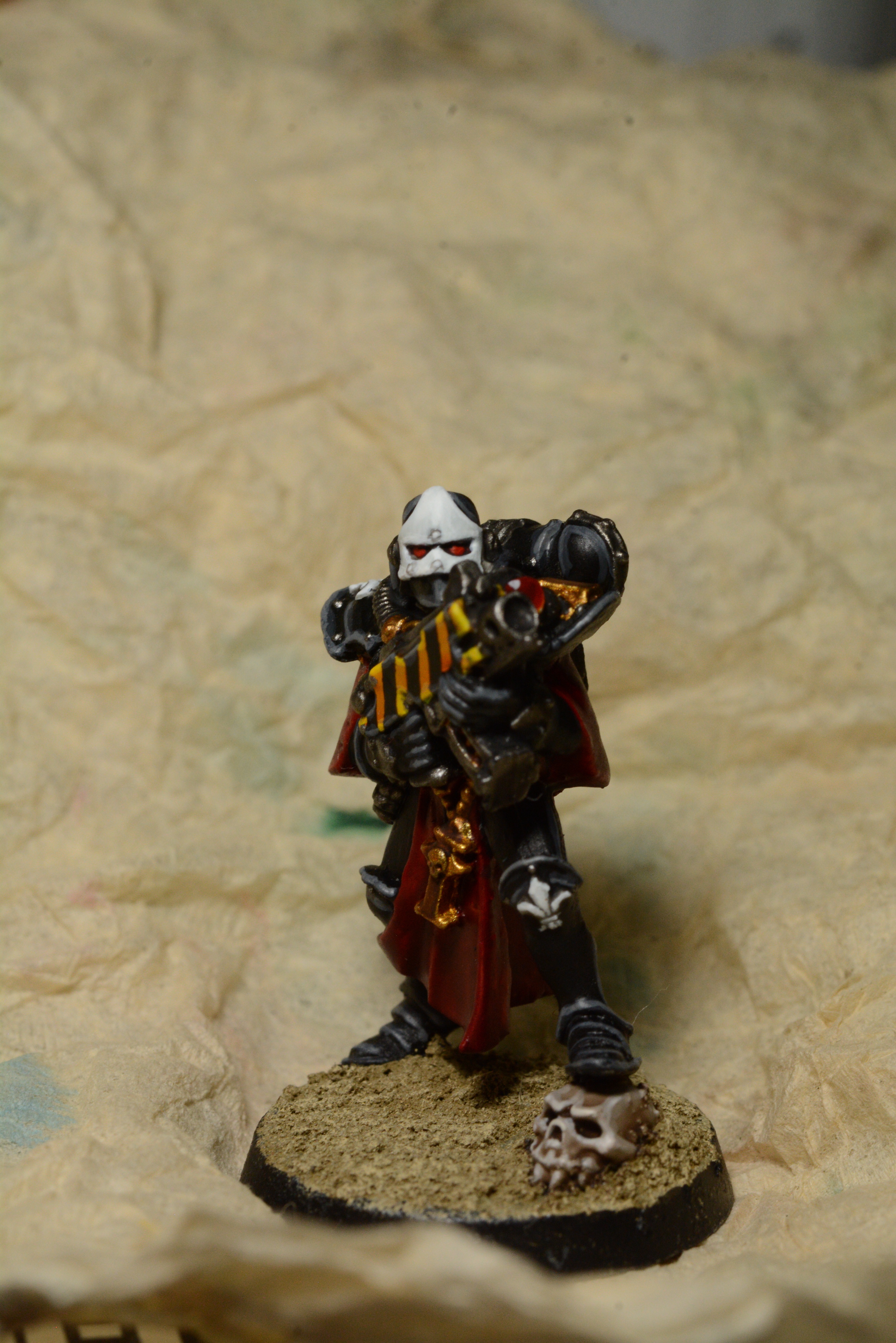 Actually, I drilled out a space marine helmet, and put one of the citadel plastic skulls in the hole. After a bit of slicing, managed to get a respectable looking bit of battle damage on the helmet so that the skull was visible. With hindsight, I'd probably put my hobby knife to slightly more work, and make things a bit more battered and detailed, but otherwise I'm pretty pleased with the whole thing!