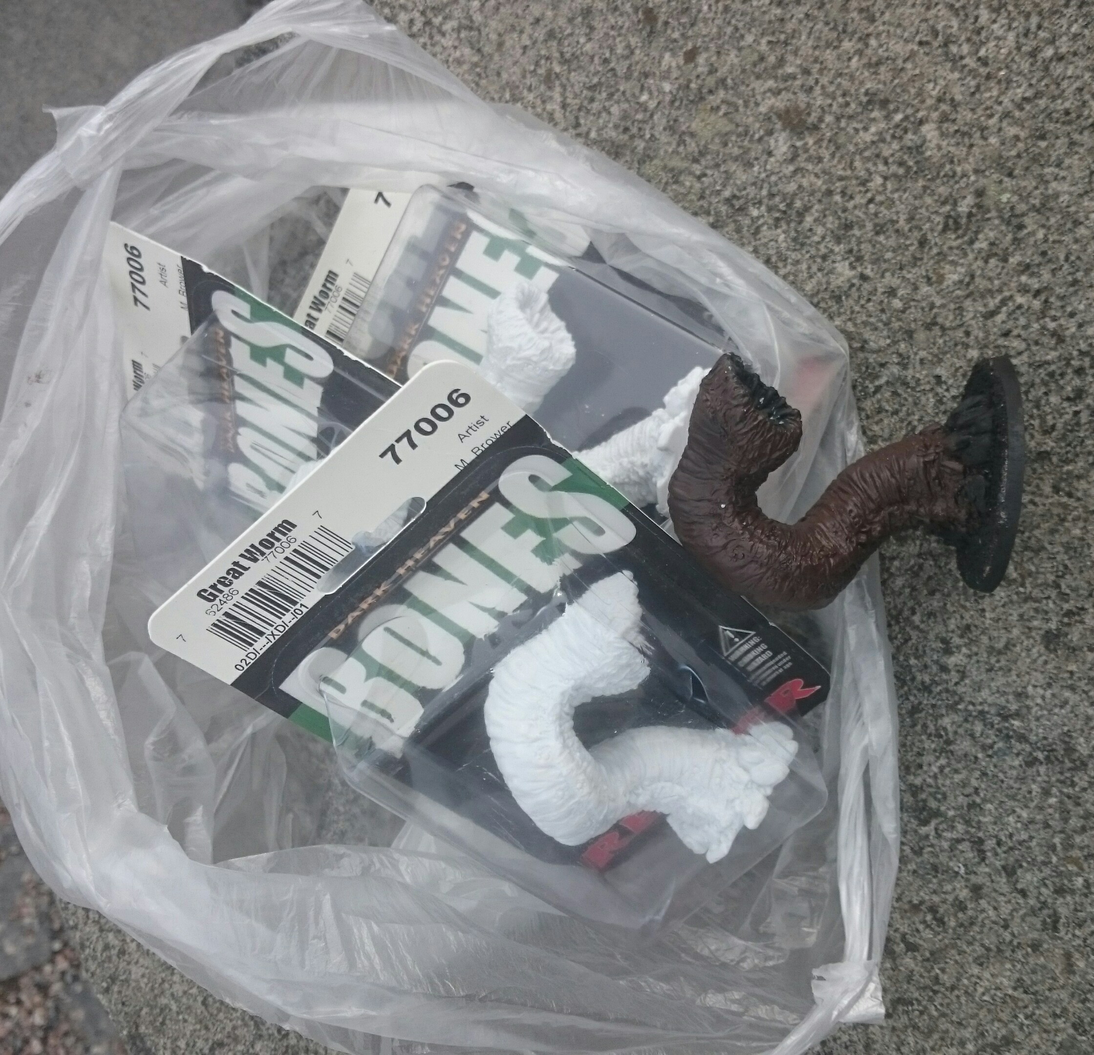 The plan is to make a bunch of worms in different shapes and sizes, convert a bunch of Epic miniatures clinging onto them and drive them closer to hit the enemy with their worms. Reaper's worms are roughly similar in size to Titanicus Warhounds, though slimmer, and my vision is to run these guys as very melee oriented Hounds, toting Inferno cannons all day long (ie. vomiting on things) and crashing against others like the maveriks they are.