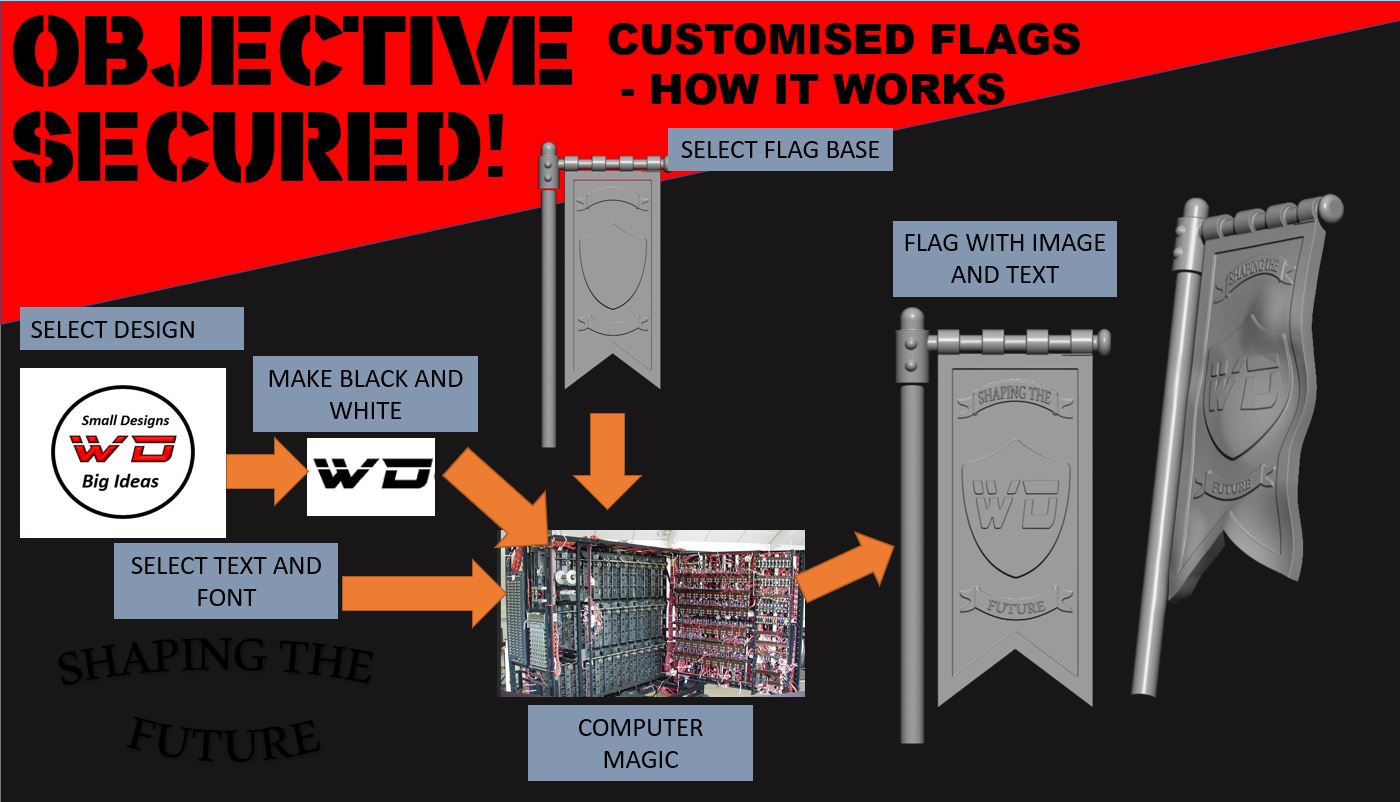 The flags can be placed and removed from objectives to show ownership and to track in game actions, as well as giving a cool visual to who owns what objectives.